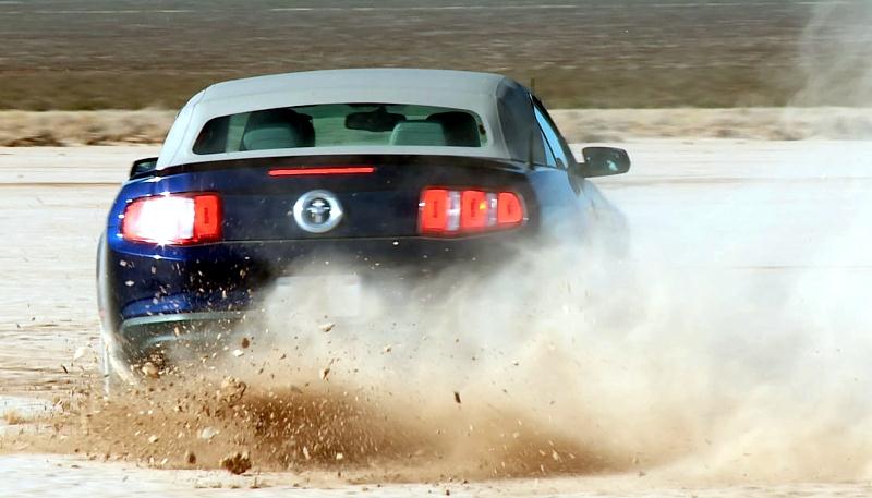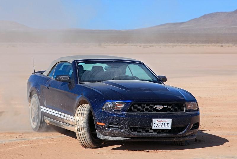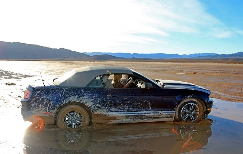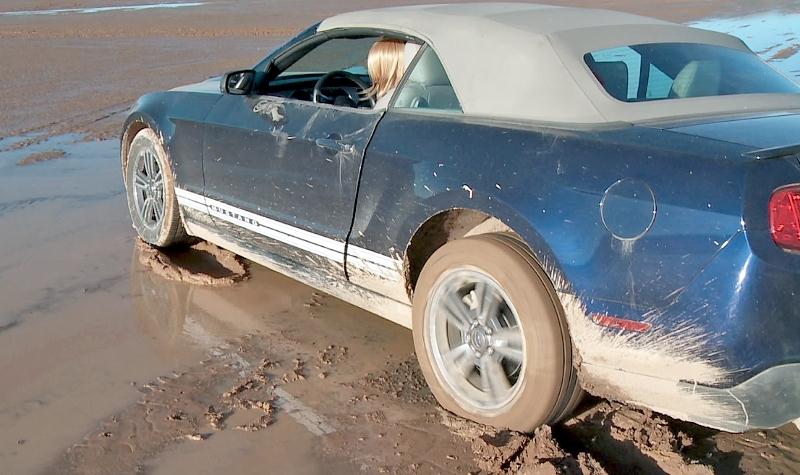 Et…, elle est arrivée dans une ancienne Ford Mustang décapotable bleue, boueuse…
