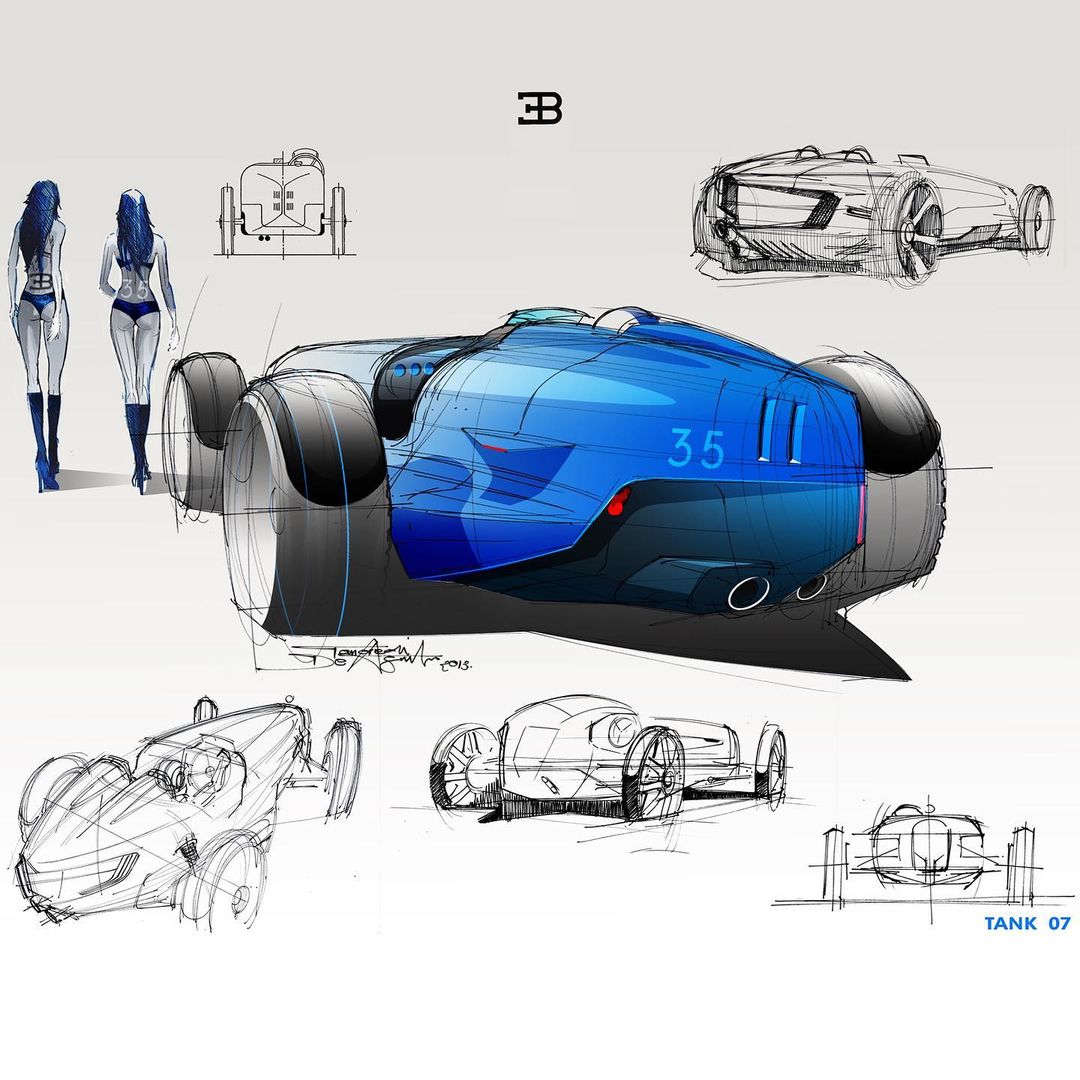 Après une pause, il a continué de plus belle : “L’équipe d’Uedelhoven Studios s’est donc penchée sur les lignes de cette Bugatti Type 35 pour en proposer cette déclinaison Roadster moderne, dotée d’une carrosserie habillée d’une livrée “bleu Bugatti” et équipée notamment d’une imposante calandre avant en forme de fer à cheval, ainsi que d’appendices aérodynamiques réalisés en fibre de carbone. Les suspensions du véhicule, comme ses jantes au design moderne, sont quant à elles apparentes et renforcent la connexion avec le véhicule original. L’habitacle du véhicule enfin, a de son côté hérité de deux sièges baquet recouverts de cuir, l’ensemble du cockpit étant par ailleurs réalisé en aluminium, en fibre de carbone et en bois”.