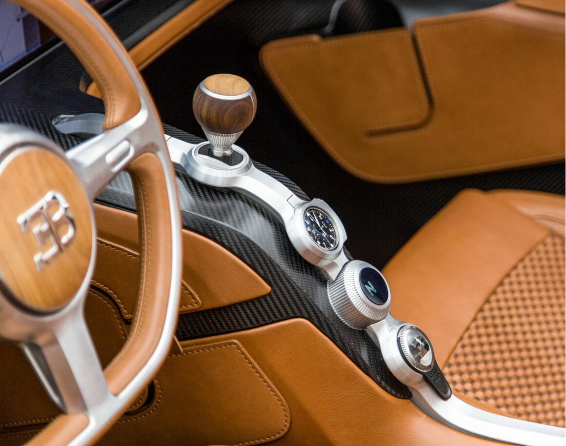 Le conducteur et sa passagère (ou l’inverse, homos, lesbiennes et transsexuels confondus dans la joie pré-sexuelle de s’asseoir dans cet engin) peuvent prendre place dans des sièges recouverts de cuir, séparés par une fine console centrale très épurée, équipée de diverses choses à manipuler avec soin… et sur laquelle trône la commande de boîte de vitesse. Les plus observateurs remarqueront par ailleurs la présence de fibres de carbone, apportant une petite touche contemporaine supplémentaire.