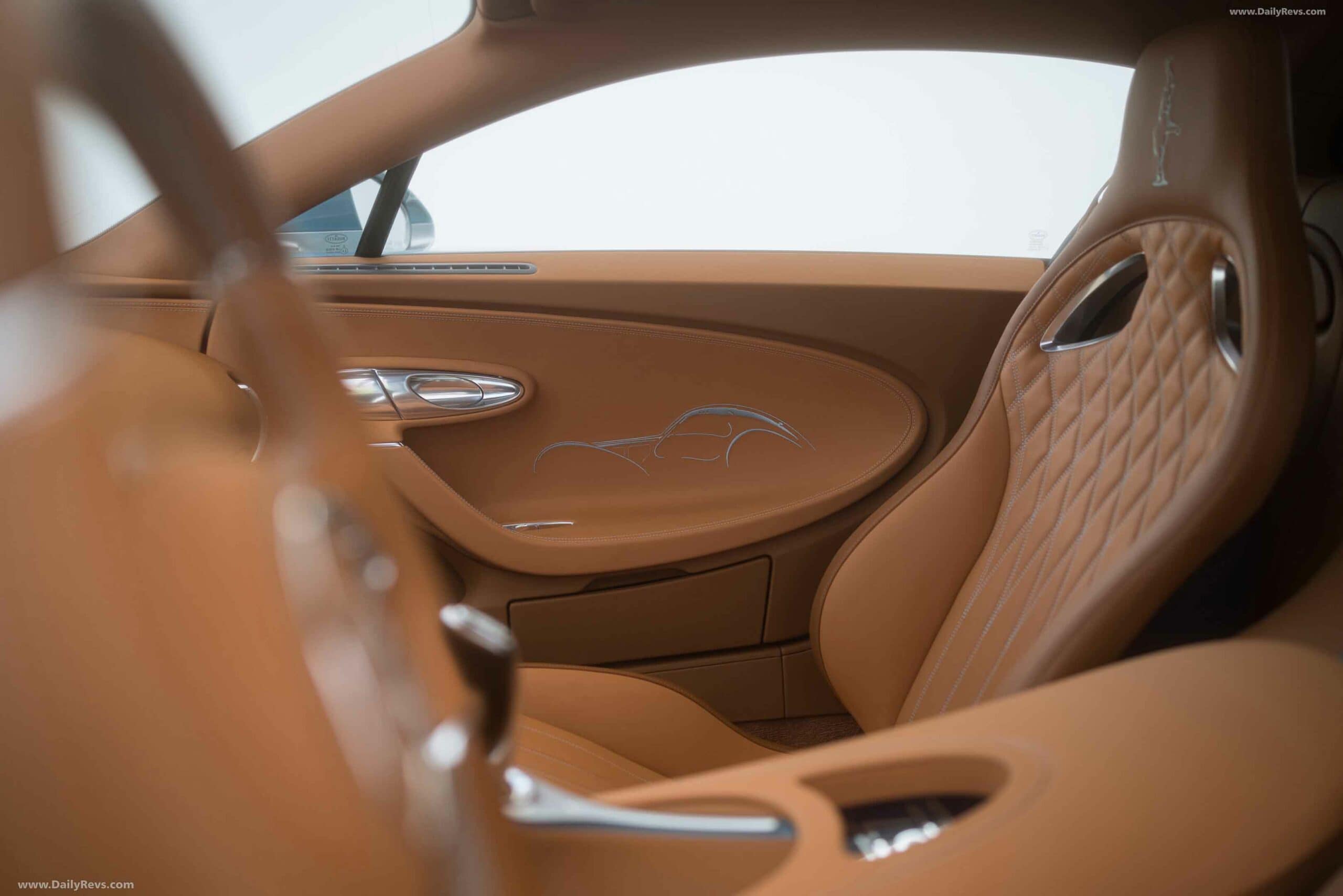 “Sur les panneaux de porte et la console se découvrent des incrustations personnalisées qui proclament 57 One of One. Consciente de l’histoire et de la vision artistique de la famille Bugatti, l’emblématique sculpture ‘Éléphant dansant’ de Rembrandt Bugatti est délicatement brodée sur les appuie-tête, signifiant sa passion pour les animaux. Les signatures de Jean Bugatti, le génie qui fut la force créatrice de la Type 57 SC Atlantic, et de Rembrandt Bugatti sont appliquées sur les seuils de porte’…