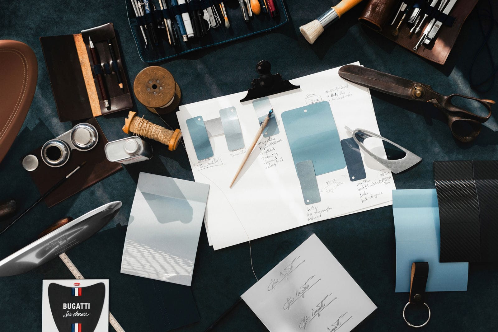 La teinte bleue argentée saisissante, scintillant sous les lumières du Mullin Automotive Museum, s’étant imprimée dans l’esprit de cette Dame, pour cet hommage vibrant, il n’y avait qu’une seule couleur qu’elle et Jascha Straub pouvaient reproduire… La même… Pourtant, y parvenir n’a pas été une mince affaire. Parce que chaque projet “Sur Mesure” était, chez VW Bugatti, toujours méticuleux dans son processus, car immergé dans les moindres détails…