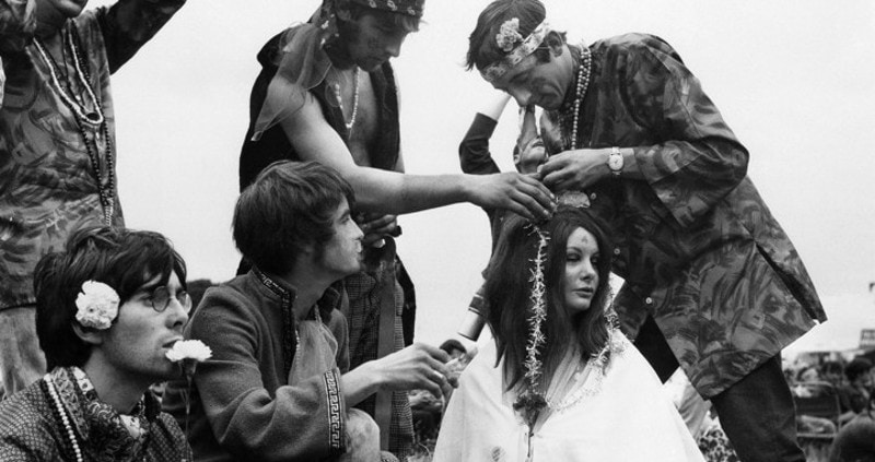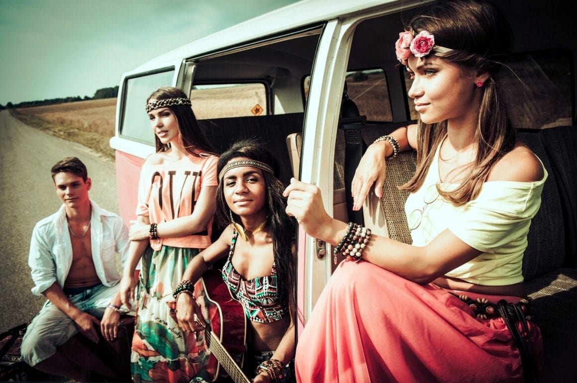 La “Flower Power Génération” déboule au début des années ’60 aux États-Unis. Le mouvement hippie se caractérise par son refus du consumérisme, son rejet des valeurs traditionalistes et sa lutte contre la guerre du Vietnam. Les hippies prônent un nouvel art de vivre, entre autres choses, basé sur les philosophies orientales et la liberté sous toutes ses formes : cheveux longs, vêtements indiens, nudité des corps, liberté de l’amour, usage massif de cannabis et d’hallucinogènes et surtout refus de toute forme d’aliénation aux codes de la société américaine bien-pensante. Bien qu’elle n’ait pas radicalement changé la société, la contre-culture hippie a tout de même laissé des marques indélébiles dans l’histoire au travers de la libération des mœurs notamment, de l’égalité des rapports (sexuels) entre les hommes et les femmes… et de la discrimination des minorités. Au niveau culturel, les hippies ont laissé un héritage fondamental dans l’art via le “Pop Art”, par exemple le “Living Theater”, mais surtout dans la musique.