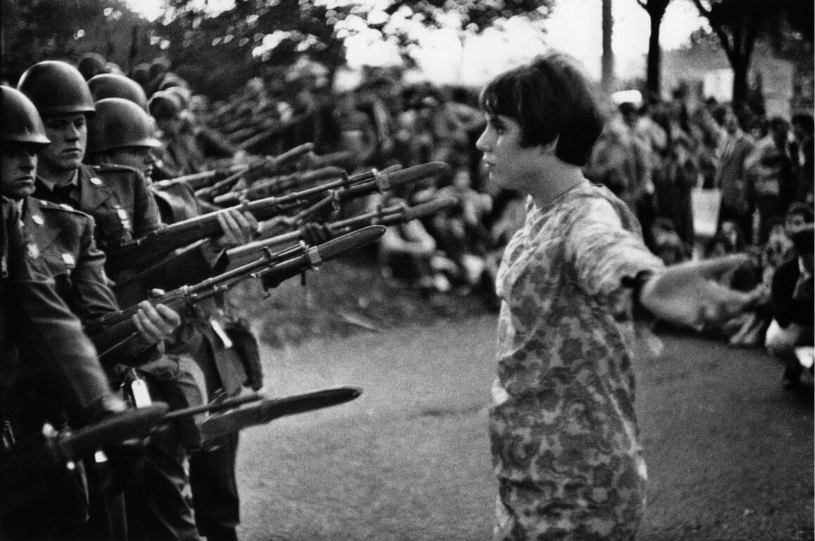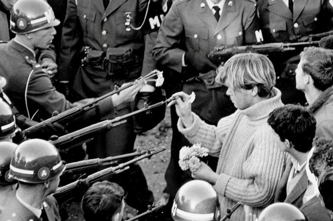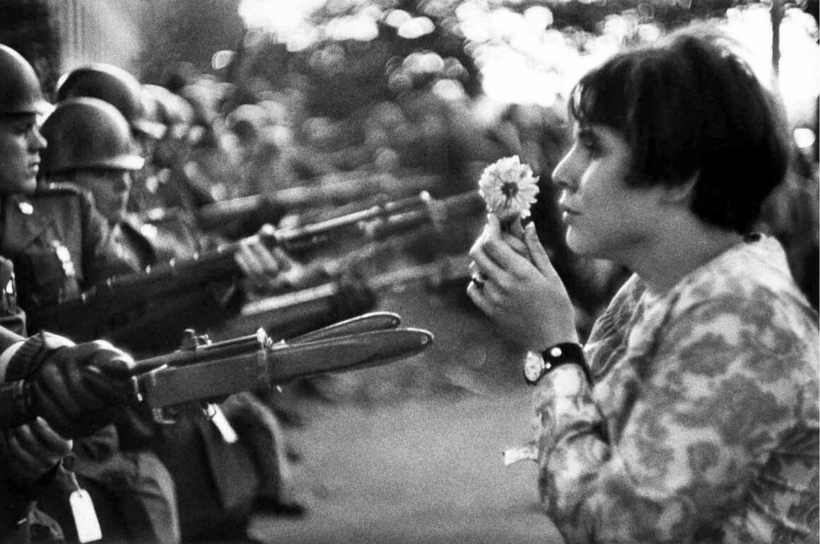 Le pouvoir de la fleur se manifestait dans différentes actions comme offrir une fleur à un agent de police pendant une manifestation ou glisser une fleur dans le canon d’un fusil. Une photo renommée du journaliste Bernie Boston prise le 21 octobre 1967 lors d’une « marche vers le Pentagone montre une jeune femme approchant une fleur des armes des militaires. Il y a également la photo de Jan Rose Kasmir par Marc Riboud prise lors de cette même manifestation.