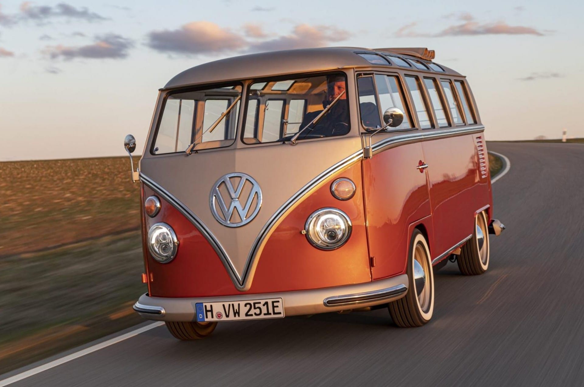 Mais, même si l’événement a été annulé, VW a tout de même annoncé le lancement de son concept e-Bulli. Mais plutôt qu’une voiture futuriste révolutionnaire, il s’agissait de la mise à jour d’un modèle classique de 1966 avec une propulsion électrique de 2020. Le fruit d’un partenariat avec eClassics, qui prévoit, à terme, de proposer des conversions de T1 et des véhicules T1 complets dans le style de l’e-Bulli. Pour ce concept-car, Volkswagen et eClassics se sont basés sur un Combi T1 de 1966. Si le look est immédiatement reconnaissable, les designers l’ont sensiblement modernisé, avec une nouvelle finition métallisée or et orange ou encore de nouveaux phares ronds à LED avec feux de jour.