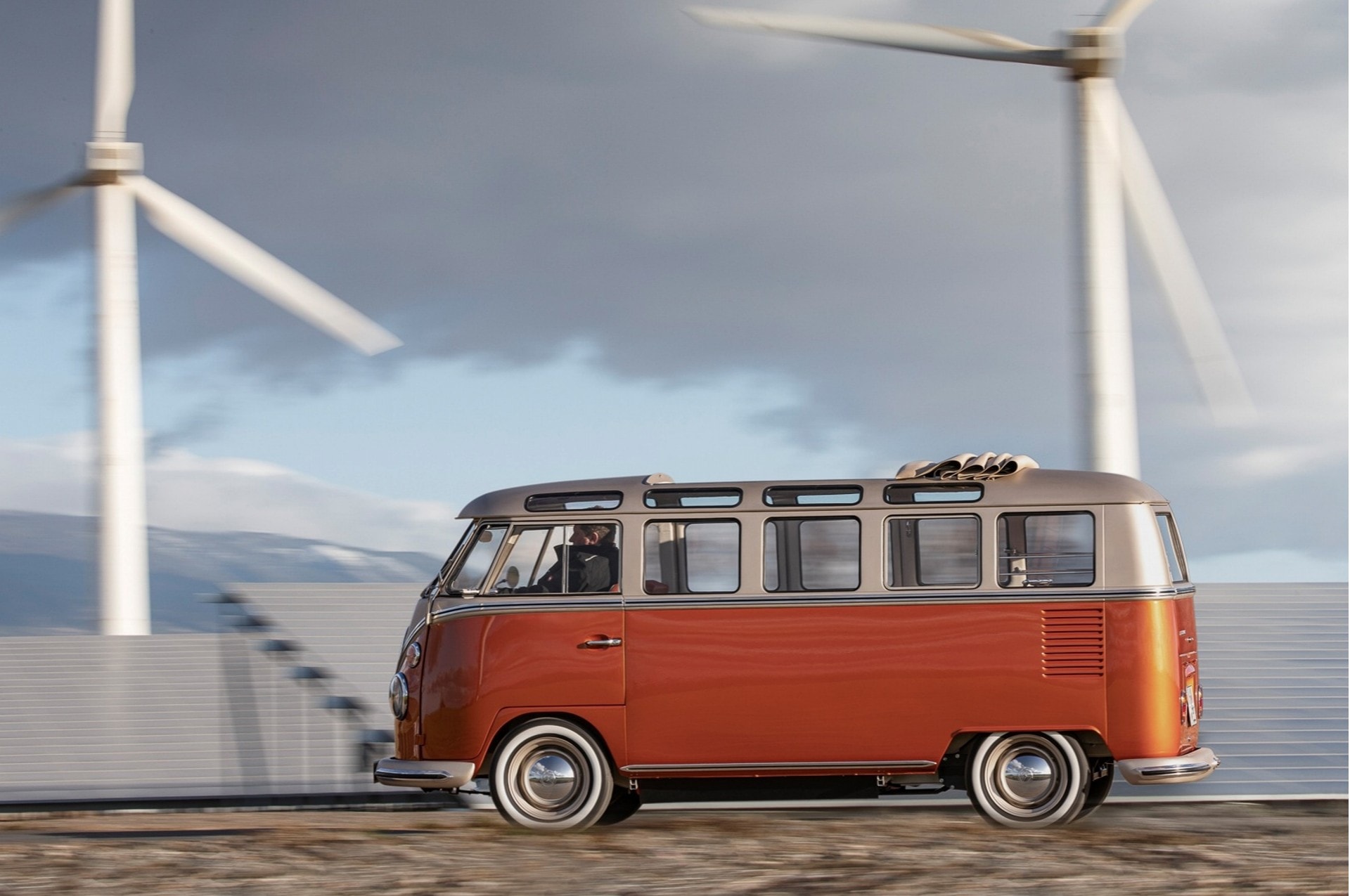 Contrairement aux véhicules actuels, on ne trouve pas d’écran tactile sur la planche de bord… mais une tablette directement intégrée dans le plafond. Celle-ci peut par exemple indiquer le temps de charge restant, l’autonomie actuelle, les kilomètres parcourus, les temps de trajet, la consommation ou encore la récupération d’énergie. Même la radio oscille entre rétro et moderne, avec un style vintage assumé et une connectivité Bluetooth et USB ! Question motorisation, si le châssis, les essieux et amortisseurs ont été modernisés, c’est surtout en devenant électrique que le Combi fait sa révolution.
