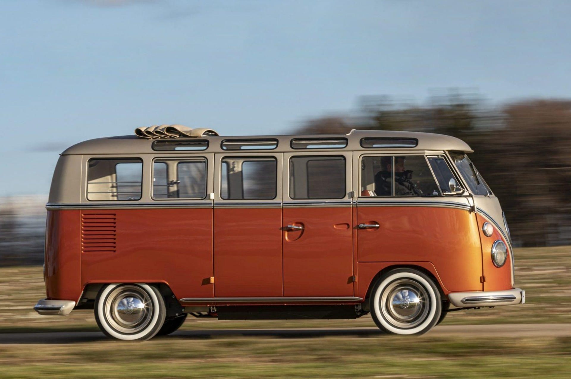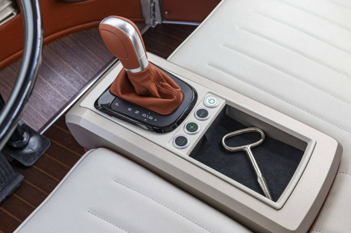 A l’intérieur, les changements sont plus significatifs : les 8 sièges se parent eux aussi d’une teinte bicolore et du bois massif a été utilisé sur tout le plancher, conférant à l’ensemble des airs de pont de navire. Pour accentuer cette impression, le toit panoramique repliable baigne l’habitacle de luminosité. Pour faire entrer le Combi de plain-pied dans le 21ème siècle, le conducteur bénéficiera désormais de tout un attirail technologique. Par exemple, si le nouveau compteur reste fidèle à l’original, il se met au numérique et peut afficher diverses informations comme l’autonomie restante.