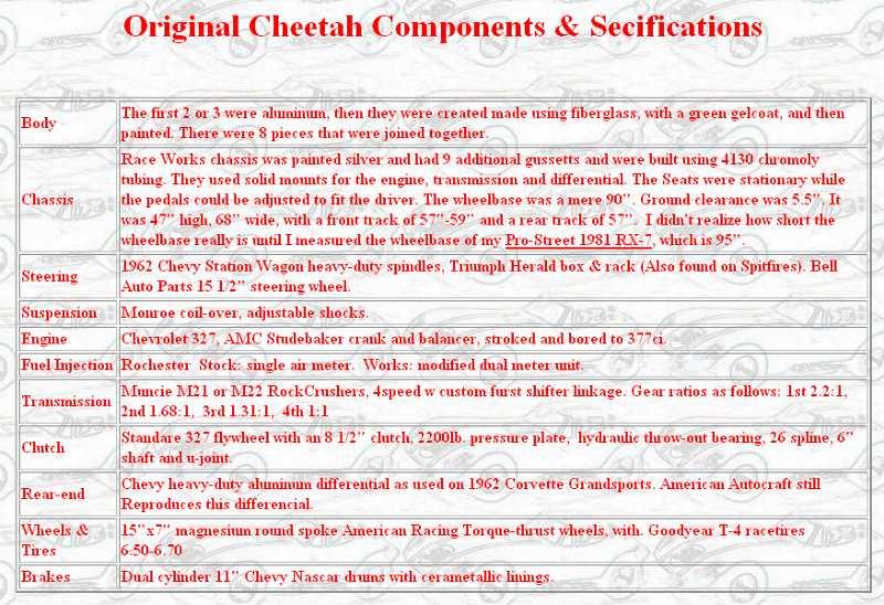 The following is gathered from conversations with two people that worked at Bill Thomas Race Cars during the period that the Cheetah was being built until the fire at the shop.