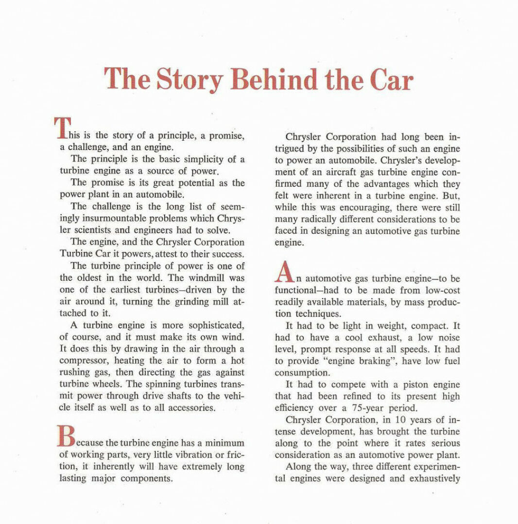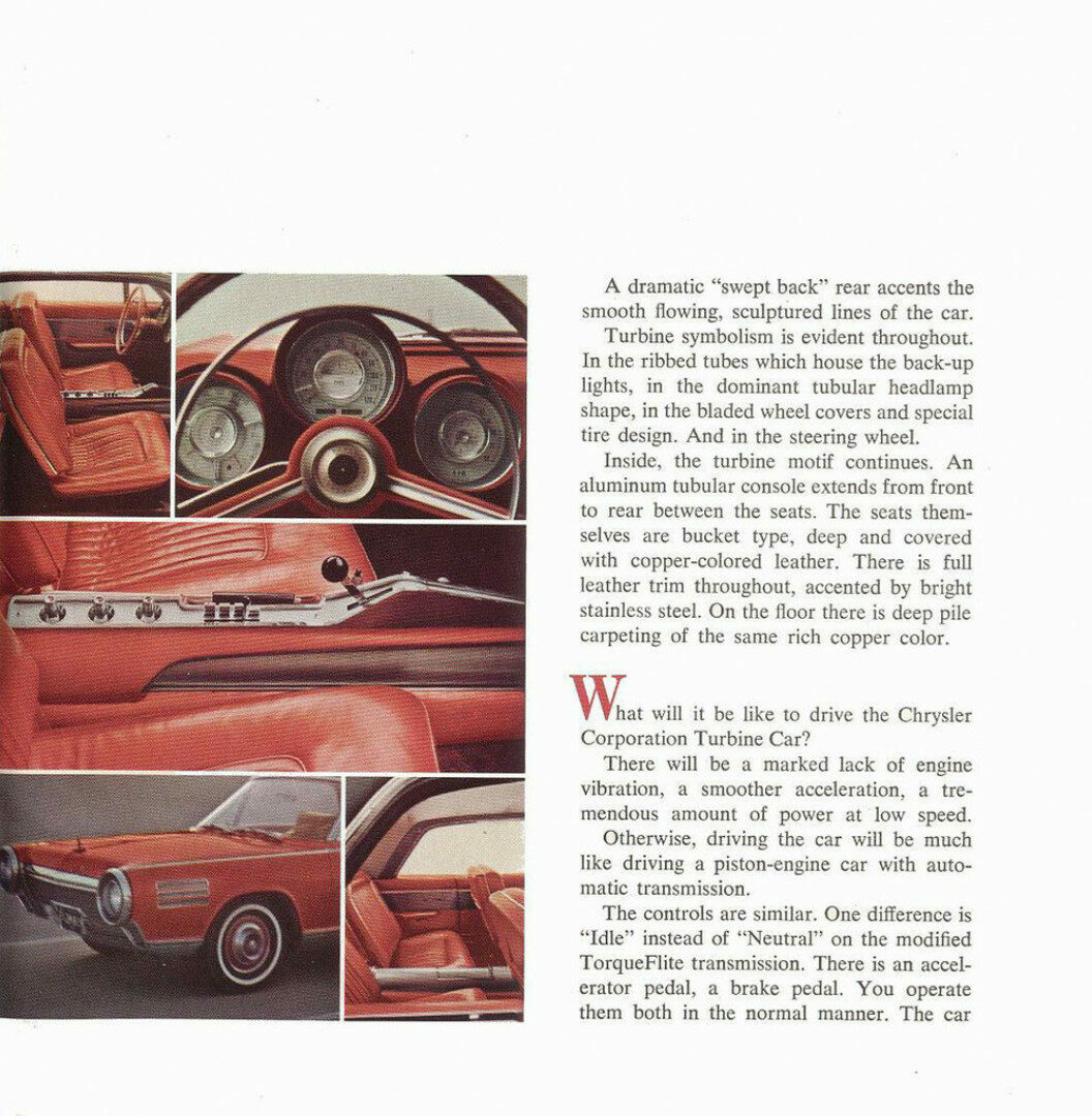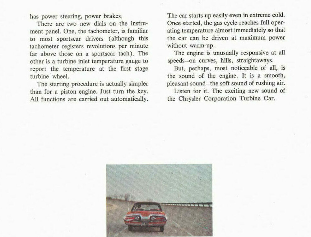 Cet accent mis sur le raffinement s’étend également à la note d’échappement. Ou plutôt à la note d’induction, car la majeure partie du son d’une turbine provient de l’air aspiré par le compresseur. Jay pense que les ingénieurs de Chrysler auraient pu l’éliminer complètement, mais ils ont voulu en laisser juste assez pour maintenir le mysticisme de l’avion à réaction. Ce n’est d’ailleurs pas très bruyant (le son est loin de ressembler à celui d’un Boeing 747)…