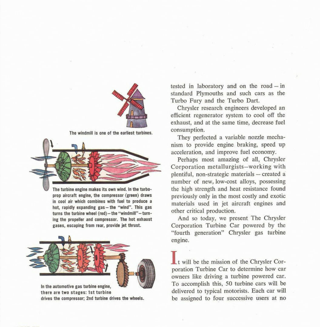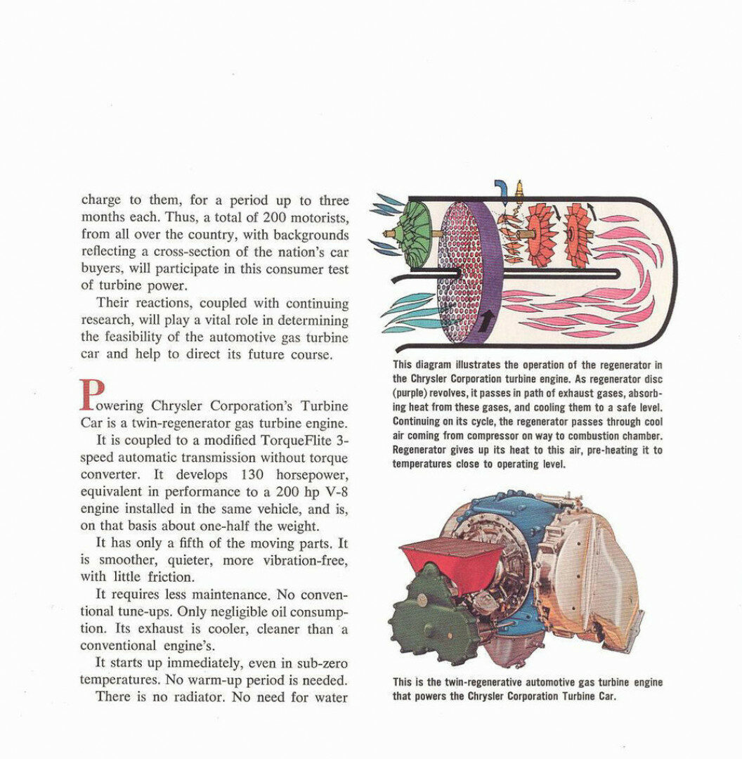 L’une des principales différences entre un moteur à turbine à réaction traditionnel et le moteur à turbine utilisé pour propulser la voiture à turbine Chrysler était l’introduction d’une turbine de puissance de deuxième étage. Selon Hagerty, l’unité du deuxième étage utilisait une réduction de vitesse de 10:1, ralentissant en toute sécurité la production de 40 000 à 50 000 tr/min de la turbine primaire à une vitesse que l’essieu arrière pouvait supporter.