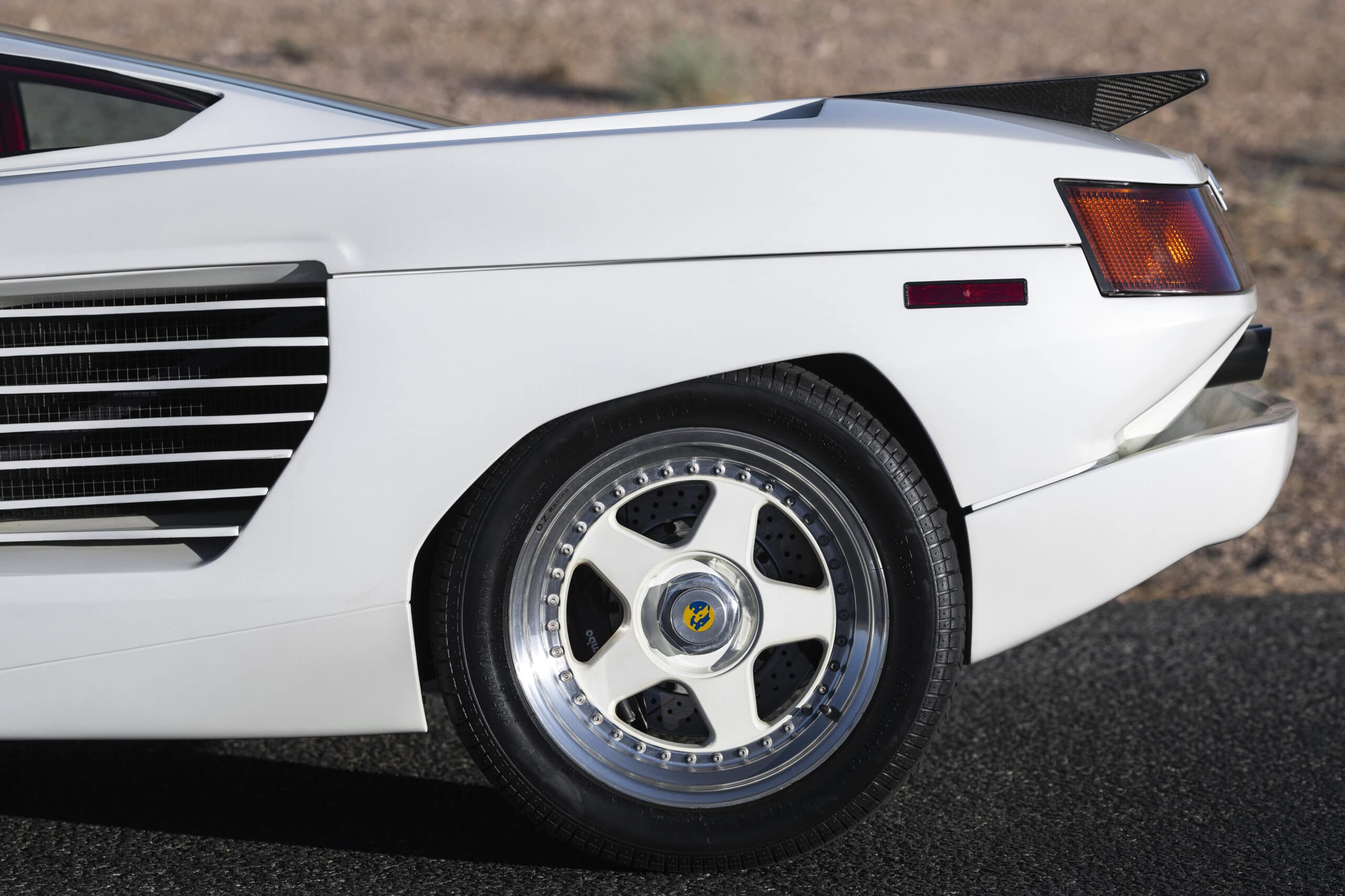 Étant le prototype des 10 Cizeta V16T construits (c’est un stratagème fiscal et technique aux USA, restant “Prototype” cet “engin” n’est pas soumis aux mêmes obligations légales sécuritaires incluant un crash-test), ce prototype particulier arbore une poignée d’éléments de conception qui n’apparaissaient pas sur les neuf véhicules de production suivants. Il y a des prises d’air latérales plus grandes avec plus de “virures”, un pli diagonal le long de la partie inférieure de la carrosserie, des clignotants différents, des phares antibrouillard uniques et des rétroviseurs latéraux exclusifs. Les acheteurs potentiels seront heureux de savoir que le #001 est entièrement fonctionnel et dispose même de son propre titre américain.