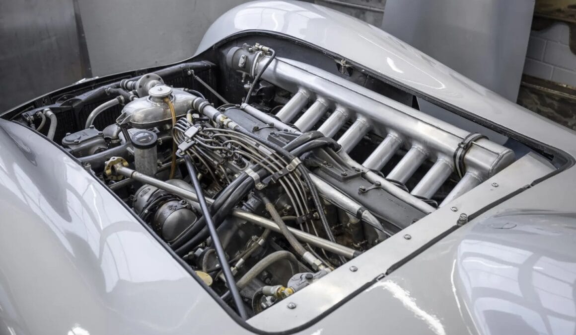 Il a commencé avec un cadre spatial tubulaire de type treillis de diamètre étroit similaire au châssis de la voiture de course W 194 300 SL. Surnommé W 196 R, ce châssis était équipé d’une suspension indépendante avant à double triangulation, de ressorts à barre de torsion et d’amortisseurs télescopiques hydrauliques de pointe. Plus important, la suspension arrière était régie par un essieu oscillant à pivot bas qui a été développé par Uhlenhaut. C’est une caractéristique de conception qui réapparaîtra plus tard dans la voiture de série 300 SL Roadster. D’énormes freins à tambour Alfin ont été spécifiés pour maintenir le W 196 R au sol, et ils ont été montés à l’intérieur pour abaisser la masse non suspendue. Après avoir fait fonctionner des moteurs huit cylindres en ligne suralimentés et des moteurs V-12 pendant l’entre-deux-guerres, le département de course avait plusieurs options à tester, et a finalement conclu qu’une configuration à huit cylindres en ligne d’un déplacement de 2 494 centimètres cubes fournirait la puissance la plus constante.