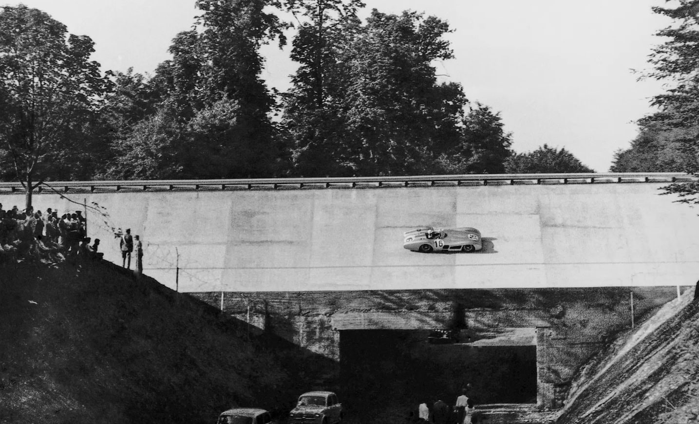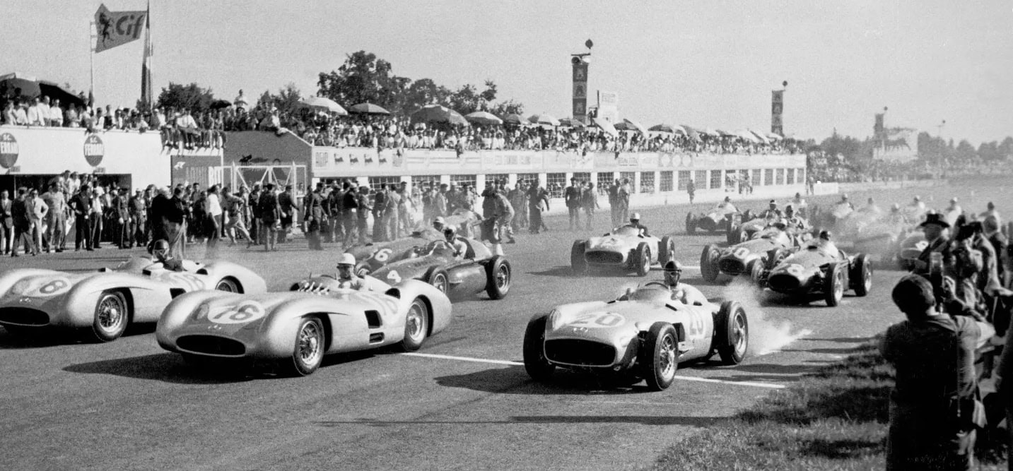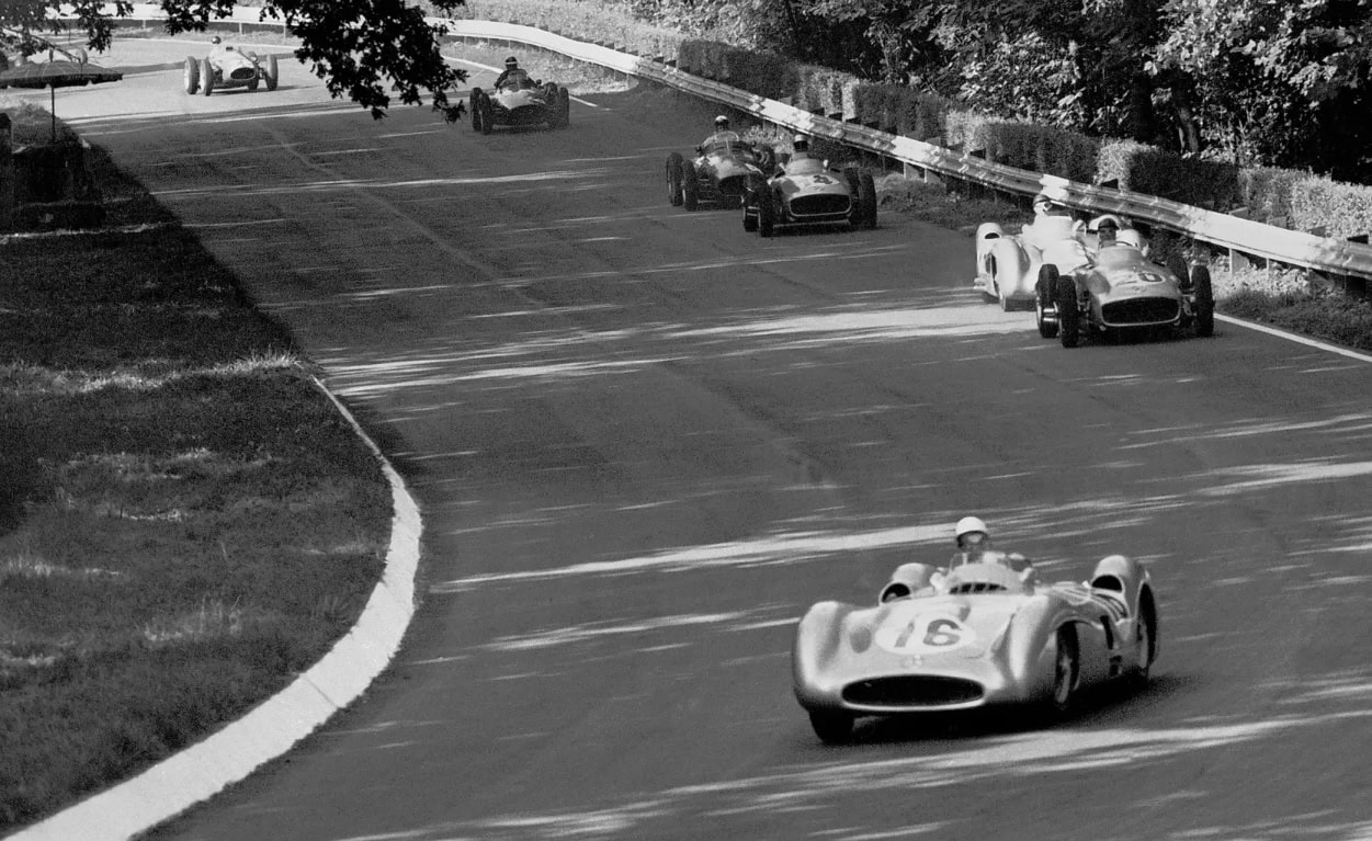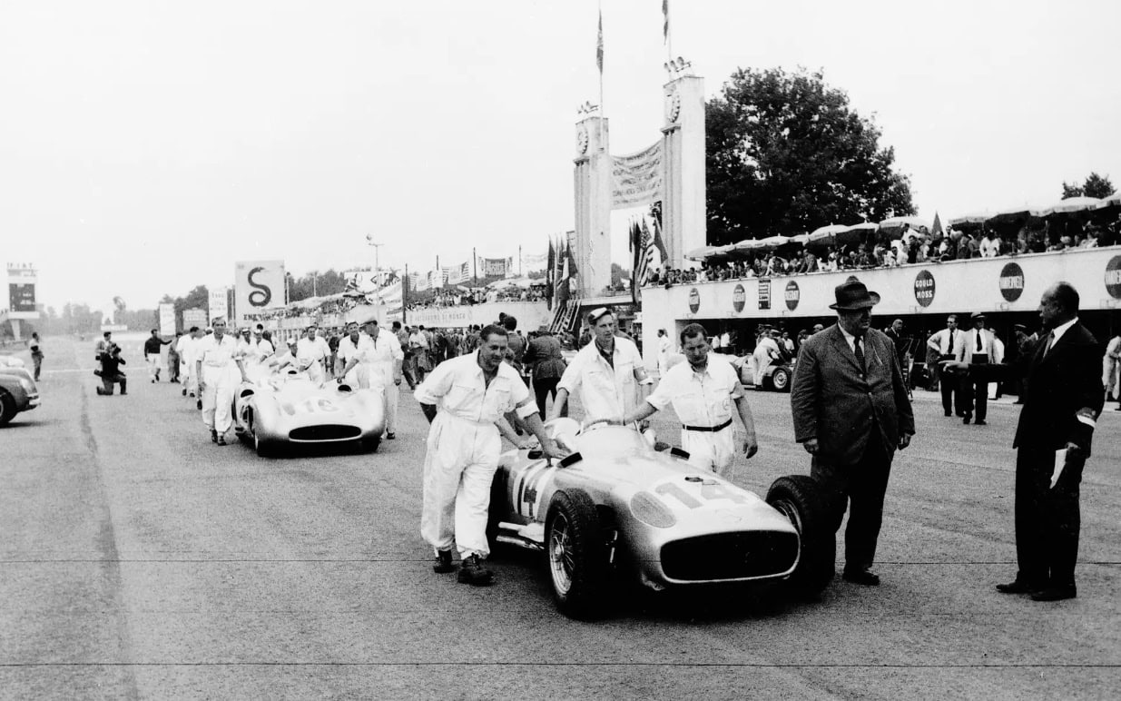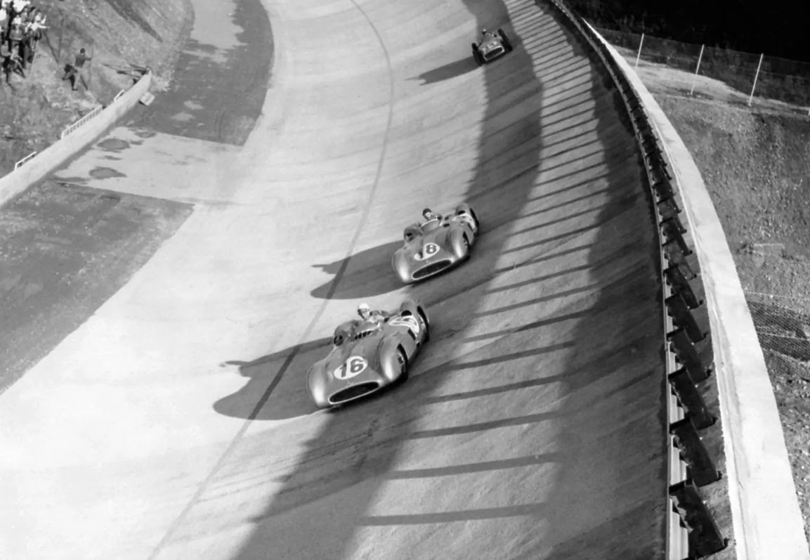 Fangio a obtenu la pole position et a remporté la course, Kling terminant 4e, chacun dans des voitures à roues ouvertes. Une équipe de trois voitures, toutes à roues ouvertes, au Grand Prix de Suisse trois semaines plus tard a donné des résultats presque identiques, Fangio remportant à nouveau la victoire et Herrmann terminant 3e. Lors du Grand Prix d’Italie sur le circuit de Monza au début du mois de septembre, tout va changer… Mercedes-Benz a engagé deux Streamliner et une voiture à roues ouvertes après que des essais aient indiqué que la carrosserie à ailes fermées serait plus rapide. Dans la course, un jeune privé britannique nommé Stirling Moss au volant d’une Maserati 250F a mené la fin de la course pendant 19 tours avant d’abandonner en raison d’un réservoir d’huile fissuré. Fangio dans une Streamliner et Herrmann dans une voiture à roues ouvertes ont respectivement terminé 1ère et 4e. La performance du talentueux Anglais n’a probablement pas échappé à l’attention de Rudolf Uhlenhaut et Alfred Neubauer. Deux semaines plus tard, les W 196 R sont engagées dans une course hors championnat, le Grand Prix de Berlin, qui se déroule sur le circuit AVUS.