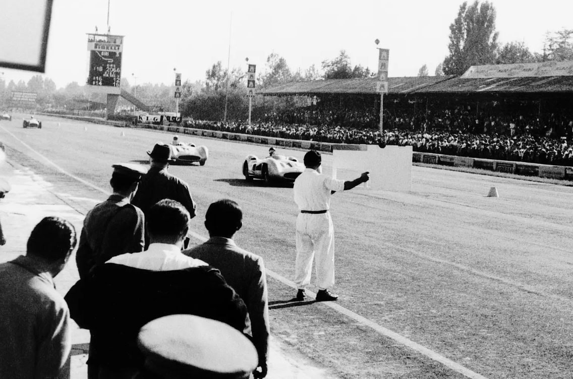 Fangio et Moss concouraient dans des W 196 R Streamliners et Kling et Piero Taruffi au volant de W 196 R monoposto à roues ouvertes. Cette voiture, numéro de châssis 00009/54, était le Streamliner à empattement long susmentionné livré à la demande pour Moss après que les Streamliners à empattement moyen aient été déclinés par Fangio et lui-même. Stirling Moss, au volant de la #16, pilotera le châssis numéro 00009/54 dans la course. Fangio s’assurerait la pole position, Moss s’assurant la 2e position de départ à seulement trois dixièmes de seconde de Fangio. Kling se qualifierait 3e et Taruffi 9e ; l’avantage de la carrosserie Streamliner sur la piste rapide de Monza était évident. Dès le début, Fangio et Moss ont maintenu leur départ 1-2. Moss a pris la tête de Fangio au 9e tour de la course, mais cela a été de courte durée, car Fangio a repris la tête au 9e tour et a conservé la 1ère position pour le reste de la course. Moss s’est accroché à la 2e place jusqu’au 18e tour, lorsqu’il a été contraint de s’arrêter pour remplacer le pare-brise… C’est cela qui l’a fait chuter à la 8e place au moment où il a rejoint la course. Moss s’est hissé à la 7e place, mais a rapidement été contraint à l’abandon (piston défectueux).