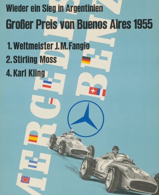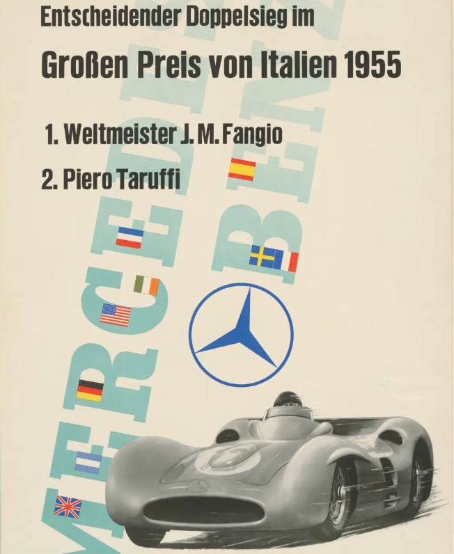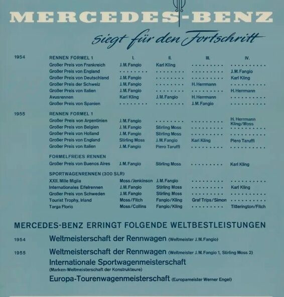 Et Moss a remporté la manche avec trois secondes d’avance dans une finale excitante. Bien qu’il ait terminé 2e dans les deux manches, Fangio a réalisé le temps total le plus bas de 2:23:18.9, devançant Moss de 11,9 secondes, la Ferrari 625 de plus d’une demi-minute et Kling de près d’une minute, remportant ainsi la victoire de la Rennabteilung lors de cette première sortie importante pour le châssis numéro 00009/54. Cette victoire a permis à Fangio de balayer les courses de cette saison dans son pays natal, après avoir remporté le Grand Prix de Formule 1 d’Argentine deux semaines auparavant. L’arrivée impressionnante au Grand Prix de Buenos Aires a été commémorée à l’époque… Mercedes-Benz commandait en effet une belle affiche de course à Anton Stankowski célébrant l’arrivée 1-2-4 Fangio-Moss-Kling. Au Grand Prix de Monaco à la fin du mois de mai, Fangio a reçu une nouvelle voiture à roues ouvertes construite sur un châssis à empattement extra court (2 150 millimètres), et bien qu’il se soit qualifié pour la pole, Herrmann a ensuite accidenté la voiture lors des essais. La chance de l’équipe n’a fait qu’empirer pendant la course, où trois voitures ont abandonné prématurément en raison de pannes.