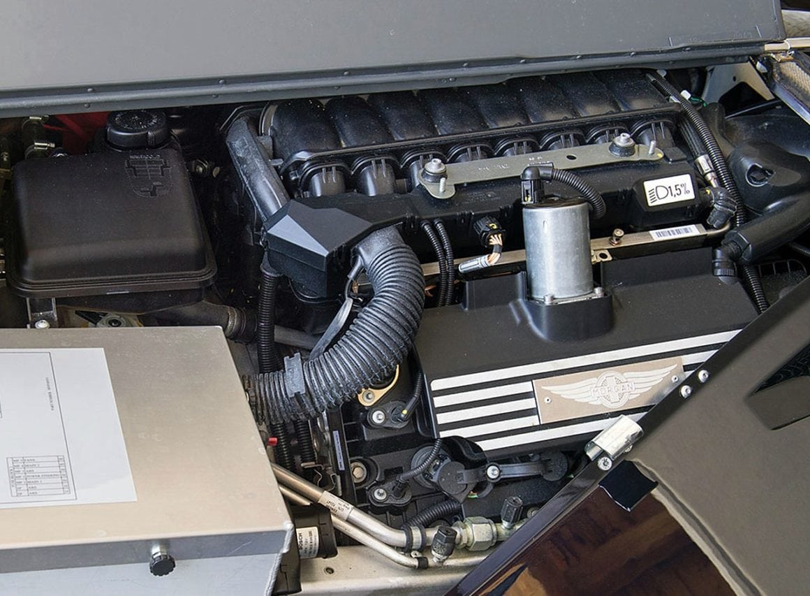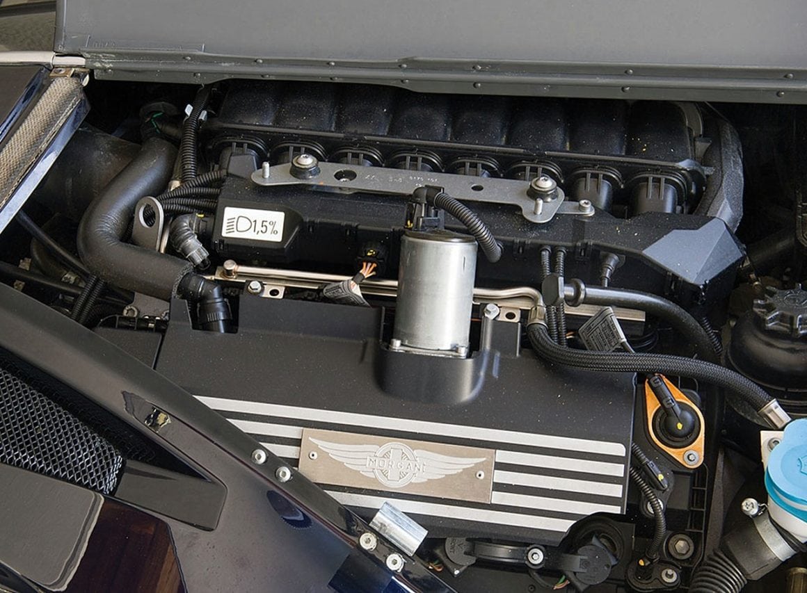 Une lame de frêne vernis s’étire d’avant en arrière pour couper la custode arrière…, cet intérieur s’observe avec le nez et se regarde du bout des doigts…., mais tout n’est pas rouge-rose, les assemblages sont précaires… et le plus dérangeant, ce sont les commodos plastique tirés de chez BMW qui dénotent dans cet environnement, à l’instar de feu TVR, Morgan aurait dû réaliser ses propres pièces.