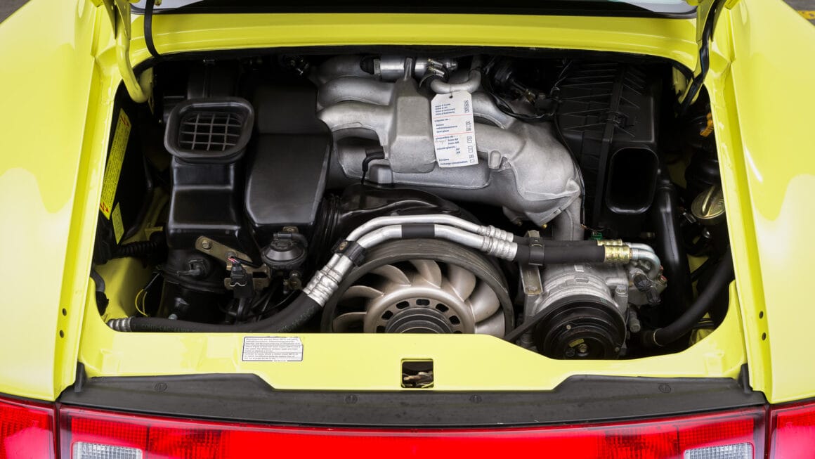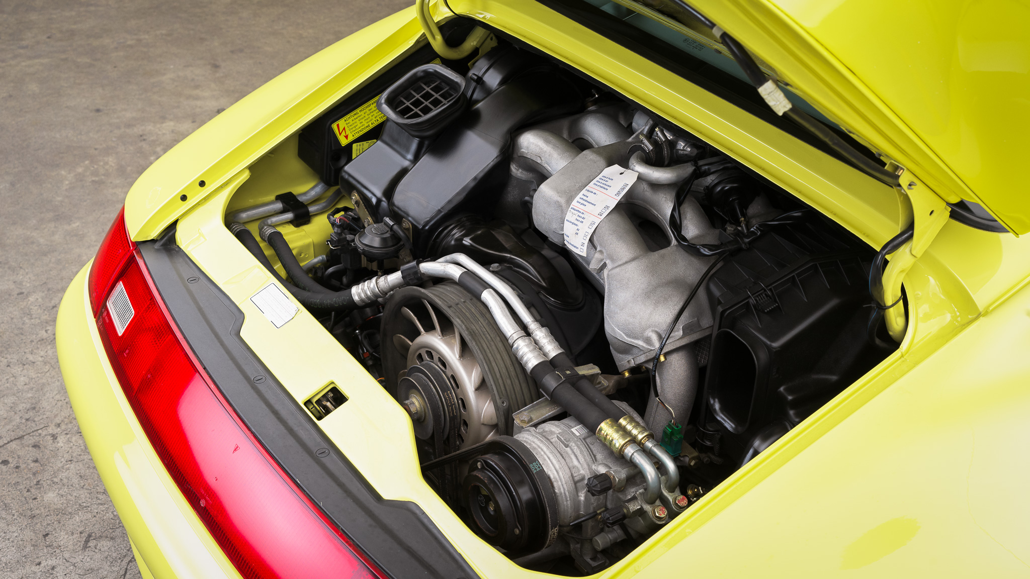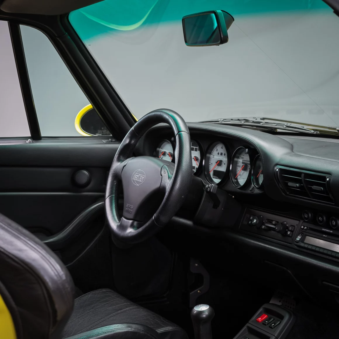 Les sièges sport avant à dossier fixe sont des RS recouverts de cuir noir et complétés par un tableau de bord, une console centrale, des panneaux de porte et de la moquette coordonnés par couleur. Des pédales TechArt ont été installées ainsi qu’une chaîne stéréo CD, un ordinateur de bord, des dossiers de siège de couleur carrosserie, un système d’alarme, des vitres et des serrures électriques et la climatisation. Un volant TechArt encadre l’instrumentation VDO à cadran blanc comprenant un tachymètre central avec une ligne rouge de 6 800 tr/min, un compteur de vitesse de 300 km/h, une horloge analogique Quarz et des jauges pour la pression d’huile, la température de l’huile, le niveau d’huile et le niveau de carburant. Le compteur kilométrique à six chiffres indique 64.000 kilomètres…