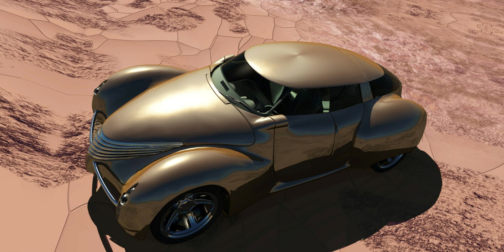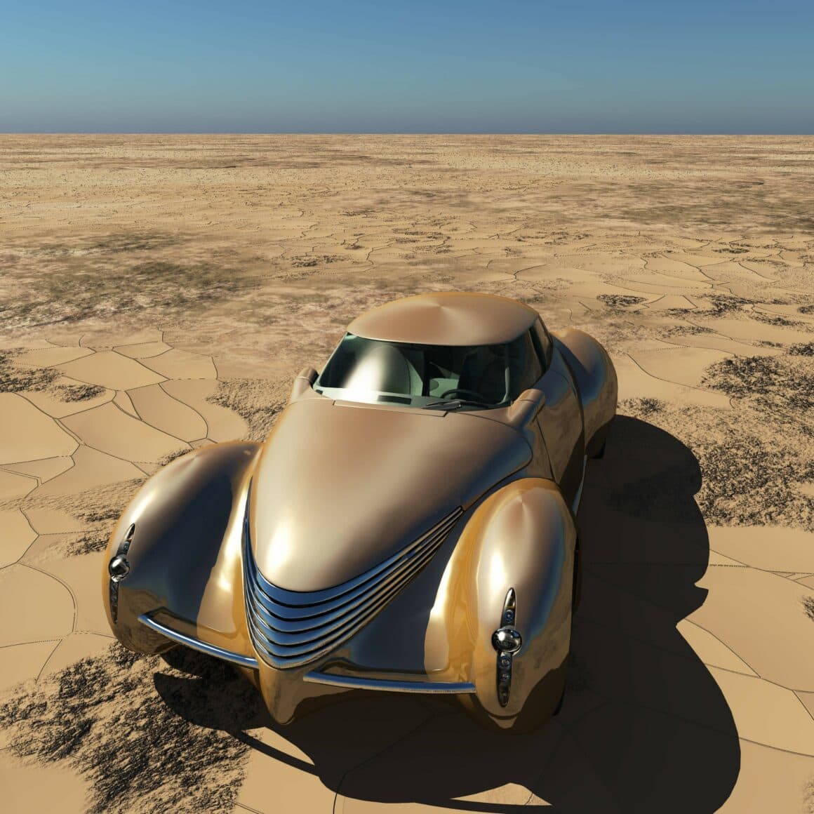 Bien, tout ceci a été tapoté pour habiller de très belles photographies d’un projet “Rétro-avant-gardiste” d’une berline électrique dans l’esprit “Art-Déco”... Il s’agit donc d’une berline-sportive rétro-avant-gardiste-art-déco, présentée dans un décor désert pour bien montrer qu’on est presqu’au bout de la fin, mais qu’être atomisé ce n’est pas une raison de ne pas faire n’importe-quoi ! L’automobile est, selon Roland Barthes dans son livre “Mythologies”, une création d’époque, conçue passionnément par des artistes inconnus, consommée dans son image, sinon dans son usage, par un peuple qui s’approprie en elle un objet parfaitement magique… Et donc, le design de la berline dont 6 photographies servent d’illustration à cet article, s’inspire et rend hommage à une palanquée de créatifs géniaux, restés inconnus du grand-public : Richard Buckminster Fuller, Karl Schlör, Robert Clabot, Jean Antem, Norman Timbs, Marcel Alamagny, Gustaf Sigvard Berggren, Eugenio Grosovich, Franco Bricci, Erich Übelacker, Harley Earl, Alexey Andreevich Smolin, Friend Wood, Erwin Allgaier, Wellington Everett Miller, et Jacob Munkhammar… TAPOTEZ CHAQUE NOM SUR UN MOTEUR DE RECHERCHE ET VOUS VERREZ ET SEREZ CONFRONTE A LEURS CREATIONS…