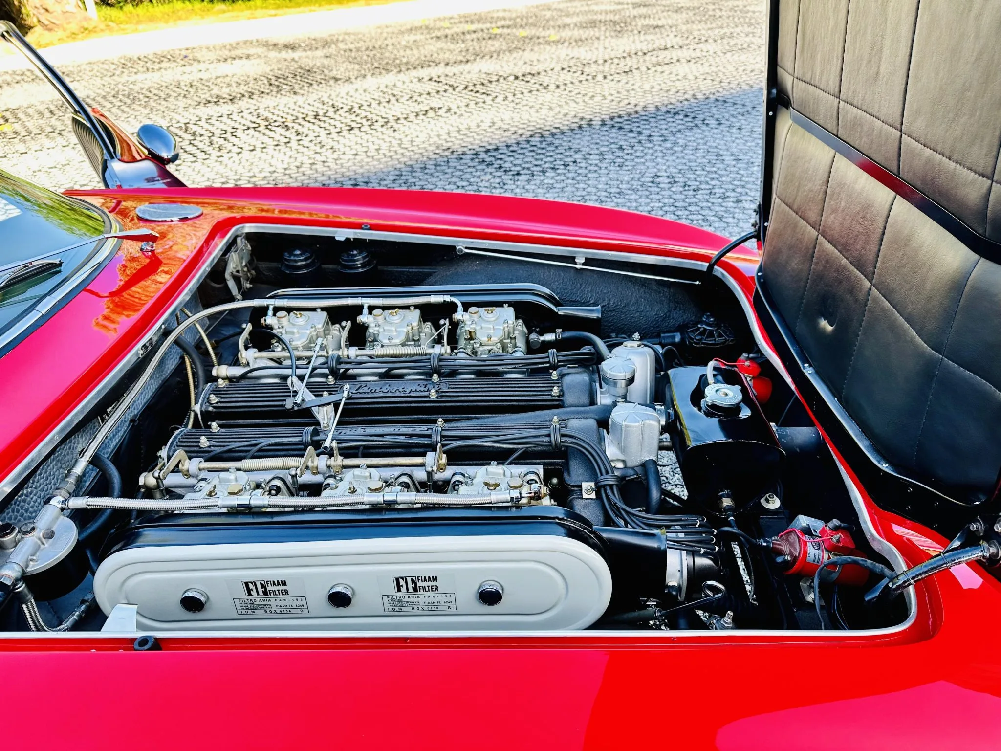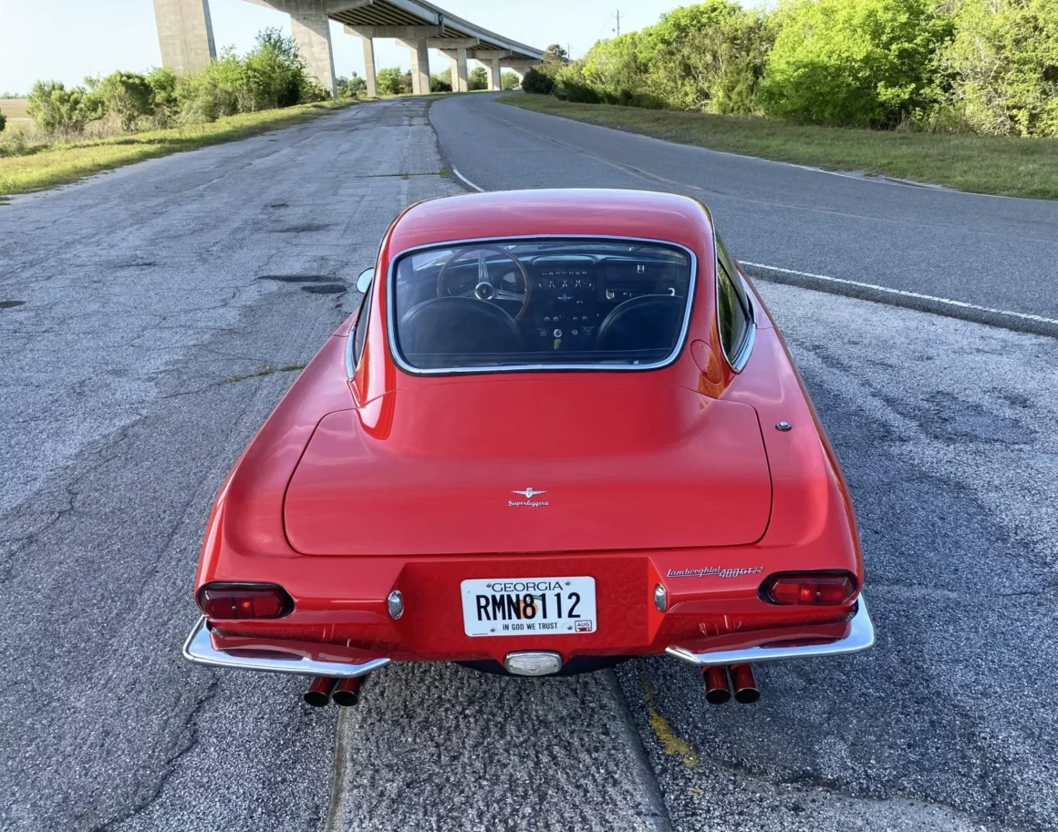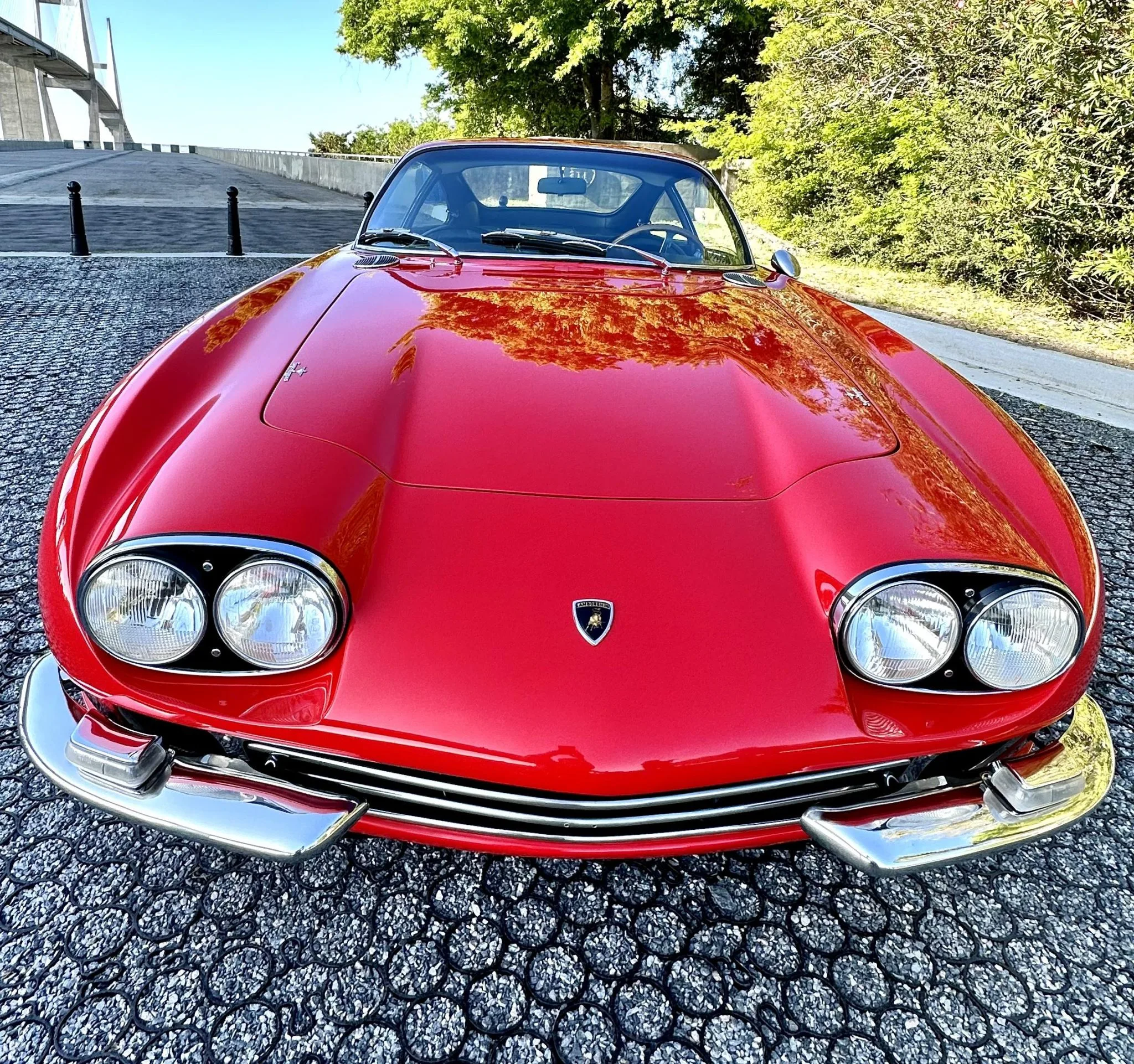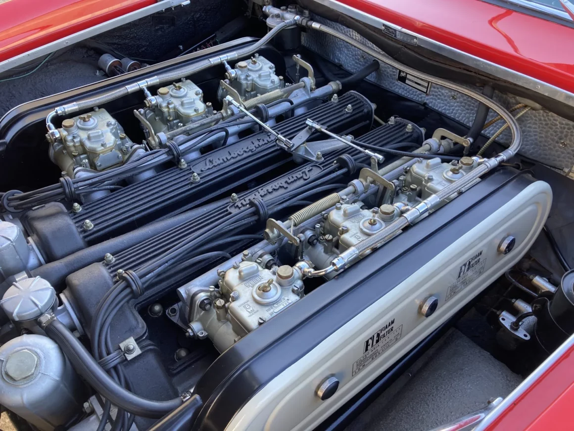 À partir de 1965, quelque 23 nouvelles voitures ont été construites avec des carrosseries identiques à la 350 GT mais propulsées par le nouveau moteur de 4 litres de Lamborghini. Le nouveau groupe motopropulseur comportait une course plus longue (augmentée de 77 à 82 mm) portant la capacité à 3929cc. La compression est passée de 9,5:1 à 10,2:1 et la puissance est passée à 320 ch à 6500 tr/min. Le couple s’est également amélioré de 35 lb-pi. à 276 lb-pi à 4500 tr/min. L’une de ces 23 voitures spéciales appartient à Brian et Julie Gladish de Californie du Sud, qui ont généreusement fourni la voiture pour cet article. Lorsque Brian a trouvé la voiture pour la première fois, le script d’identification arrière ne montrait que la cursive « Lamborghini »; la partie qui aurait dû dire « 350GT » ou « 400GT » manquait. Brian avait fait quelques recherches, cependant, et savait que les 350GT étaient en aluminium. Armé d’un aimant, il a rapidement déterminé que la carrosserie de cette voiture était en acier, la plaçant dans la catégorie 400 GT.