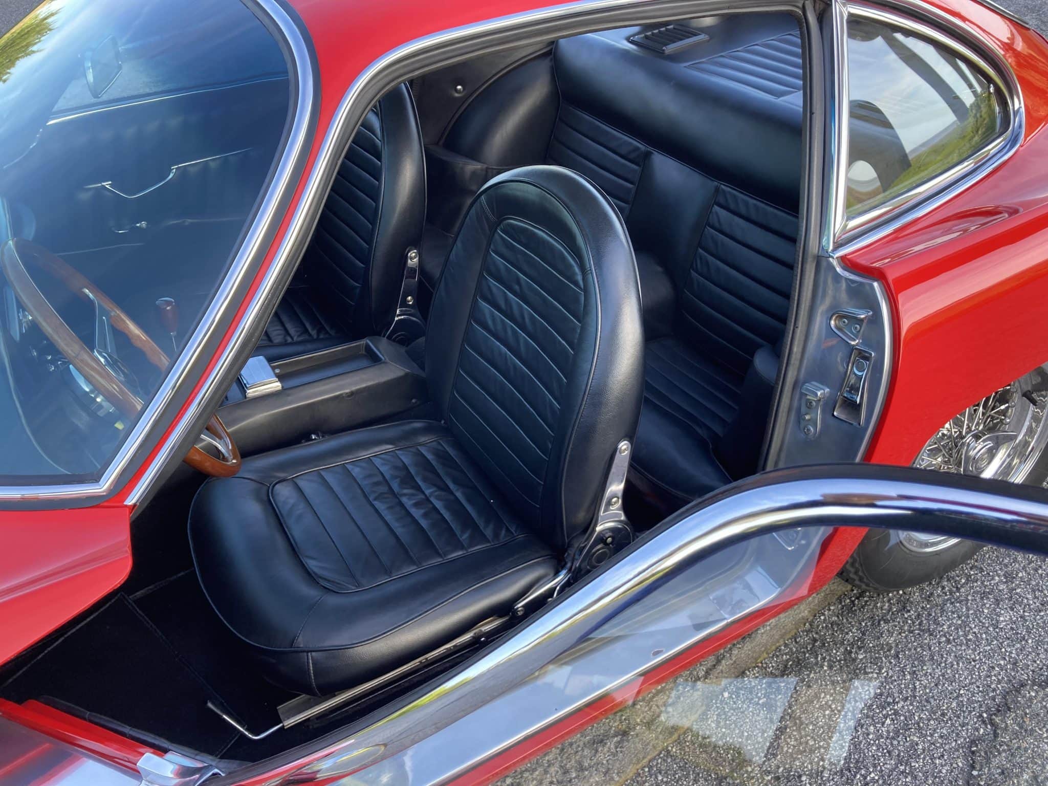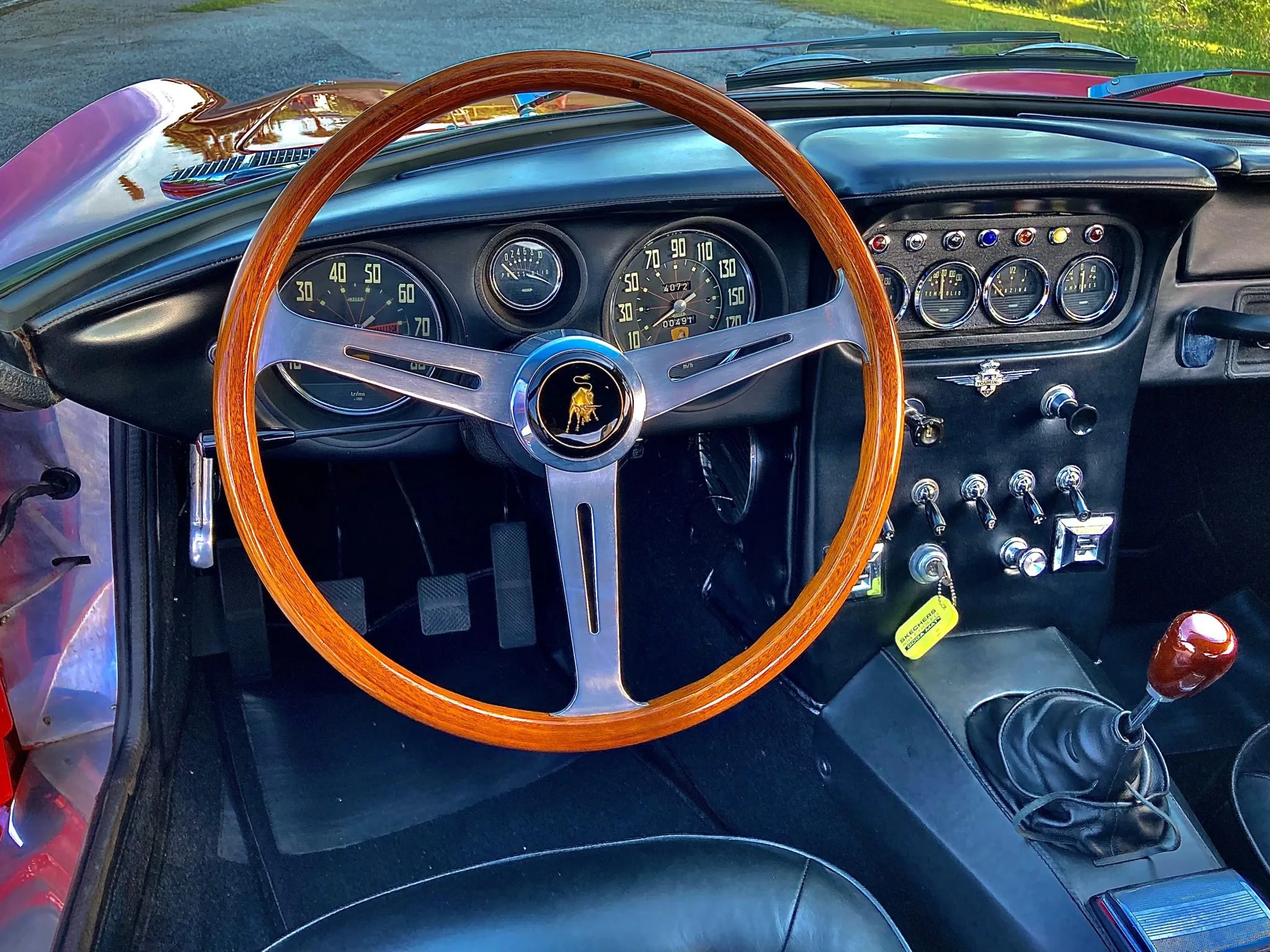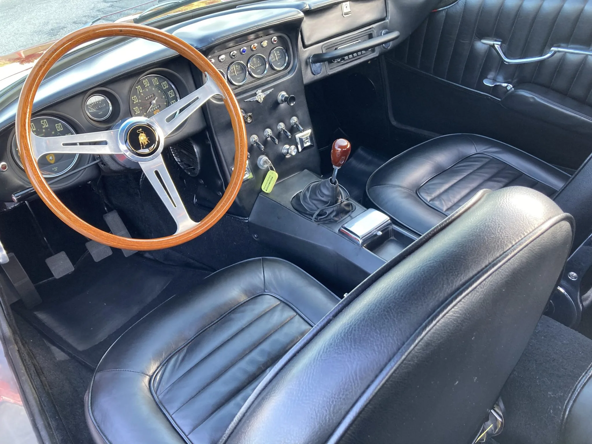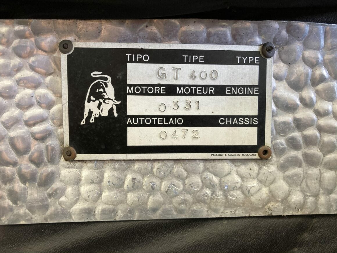 Pourtant, la voiture avait les mêmes phares que la 350 (la plupart des 400 GT sont livrées avec quatre phares ronds scellés nichés dans les compartiments ovales des phares ovales de la 350 ) et a également une plaque 350 à l’intérieur. Outre la taille du moteur et la carrosserie en acier, la principale différence entre une 350GT standard et la 400GT est la transmission; ce n’est plus la ZF mais plutôt la propre création de Lamborghini, bien qu’elle se connecte au même différentiel Salisbury utilisé sur les voitures précédentes (qui ont été remplacées sur les 400 GT ultérieures par une unité fabriquée par Lamborghini). La voiture porte également le numéro de carrosserie du carrossier Touring à l’intérieur de sa boîte à gants, indiquant que la voiture a été construite avant que la carrozzeria milanaise ne soit mise en liquidation à l’automne 66. Brian voulait à l’origine une Miura, mais il était trop grand pour tenir confortablement dans cette voiture. Depuis leur achat de cette 350/400, Brian et son épouse Julie ont fait restaurer la voiture.