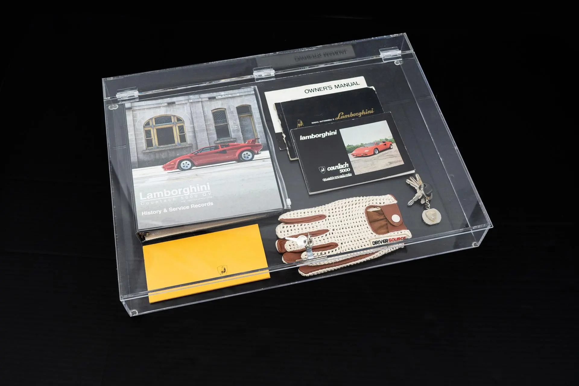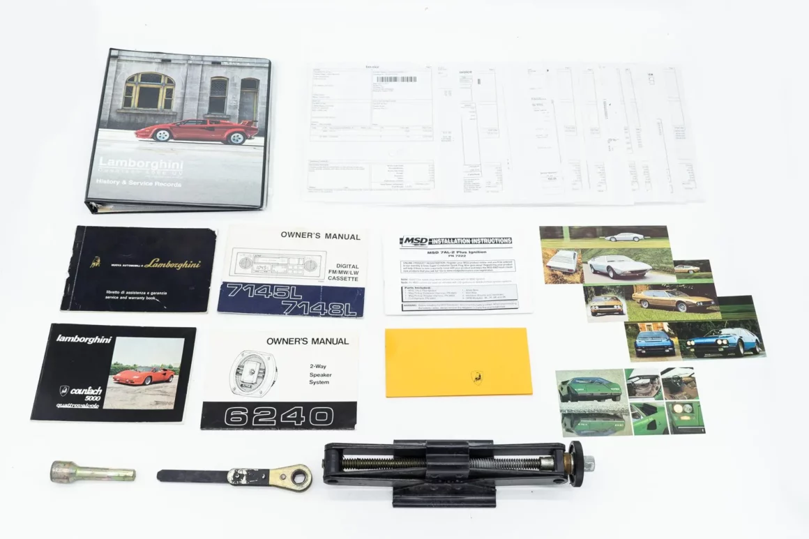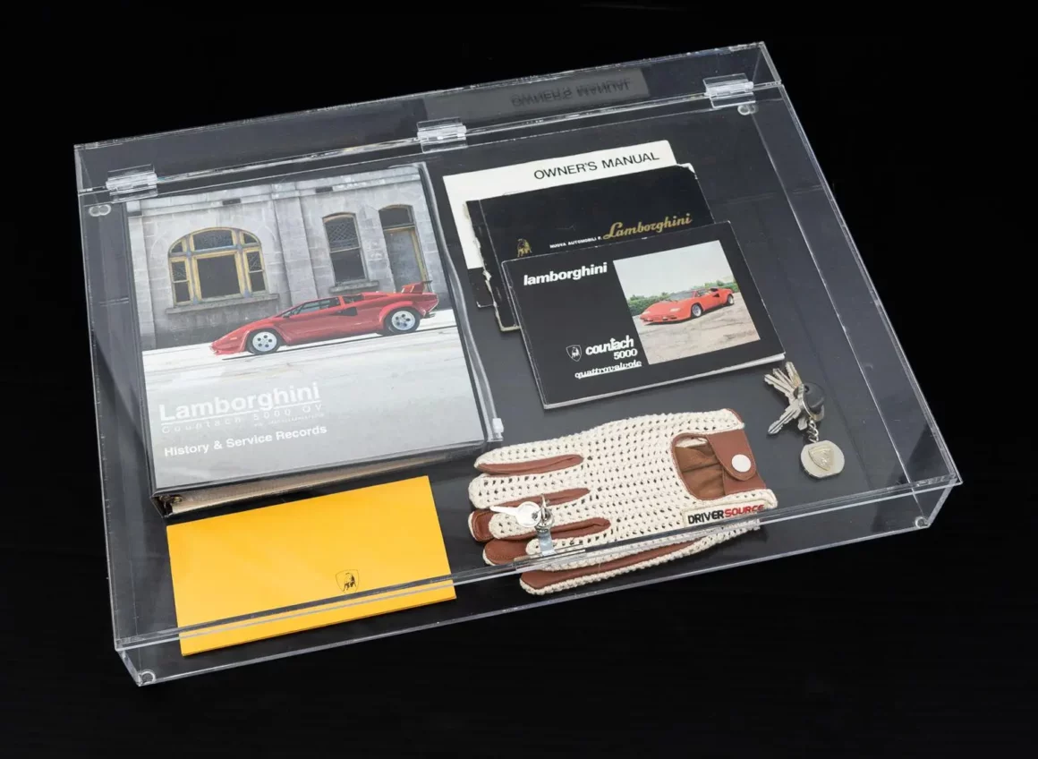 Cette Countach est annoncée proposée en vente aux enchères avec ses bouquins et catalogues d’usine, ses outils, diverses photos personnelles avec Valentino Balboni tout sourire, dont une photo 2m² encadrée de la voiture avec dédicace de Valentino Balboni, ses gants de conduite, son livre préféré de chevet (sic !) par ailleurs écrit par lui (gag !).