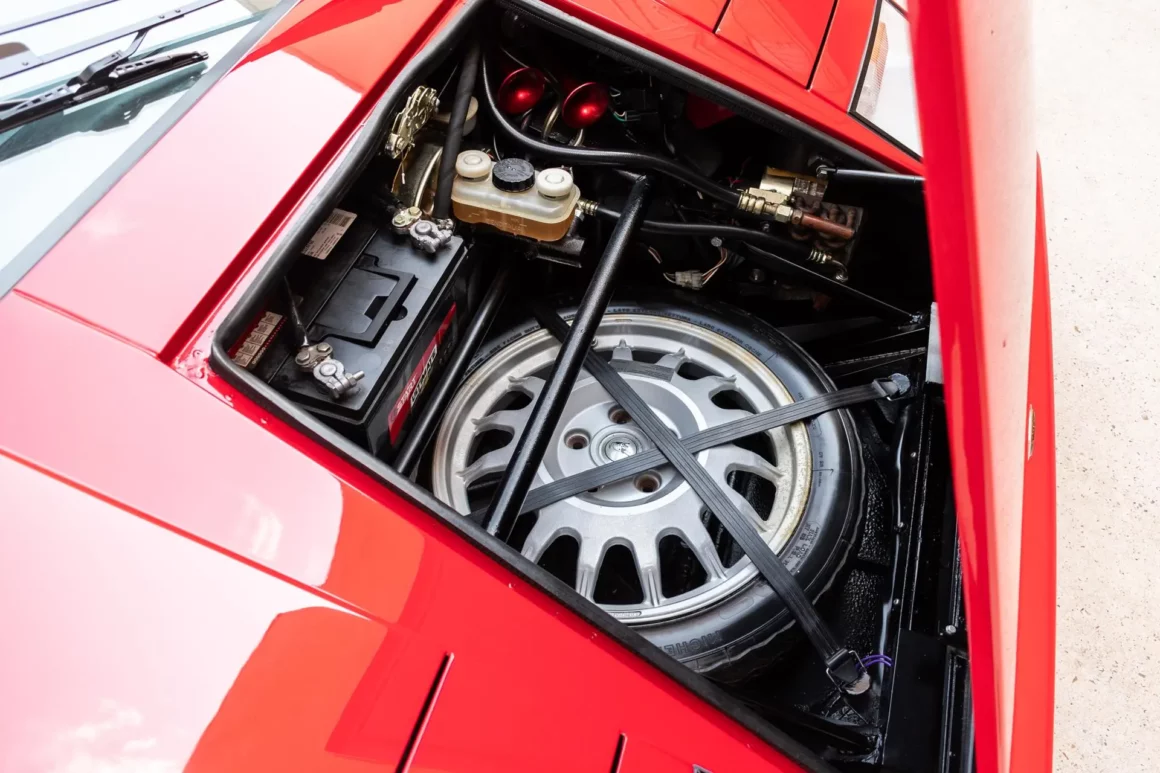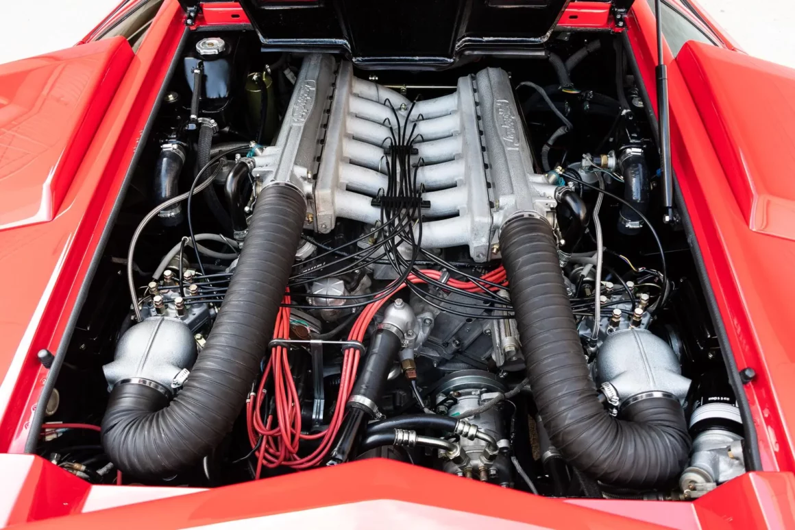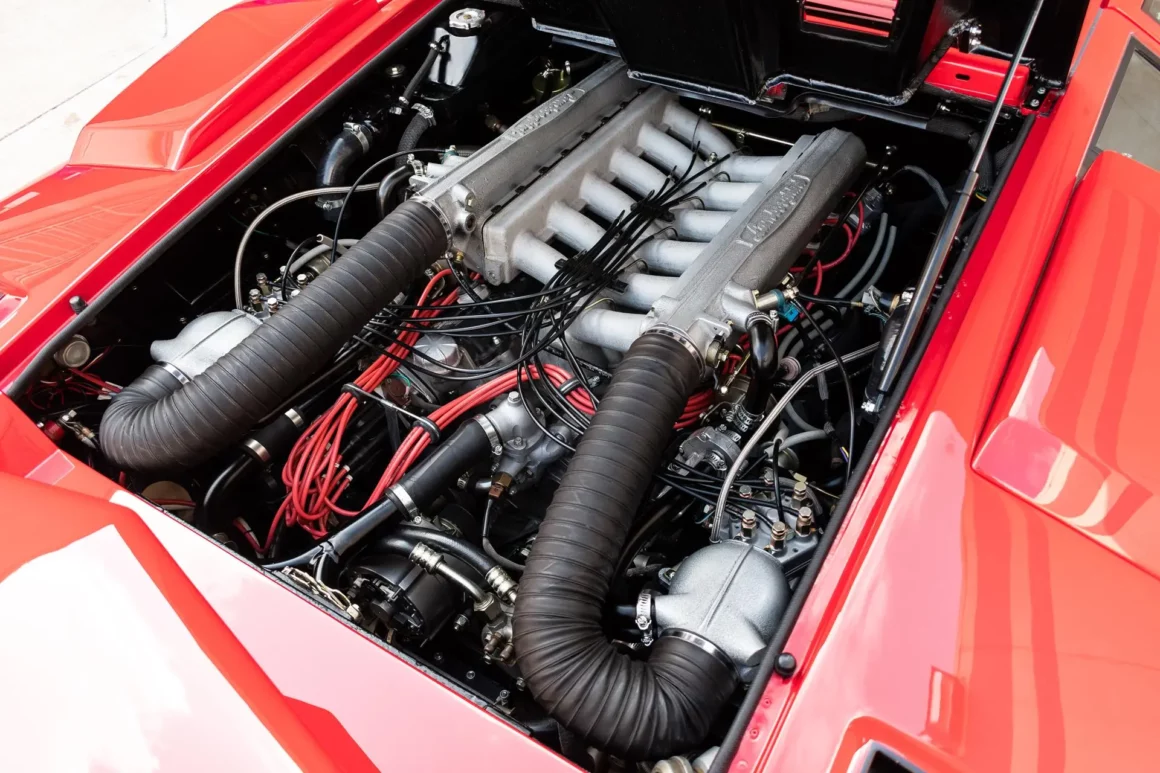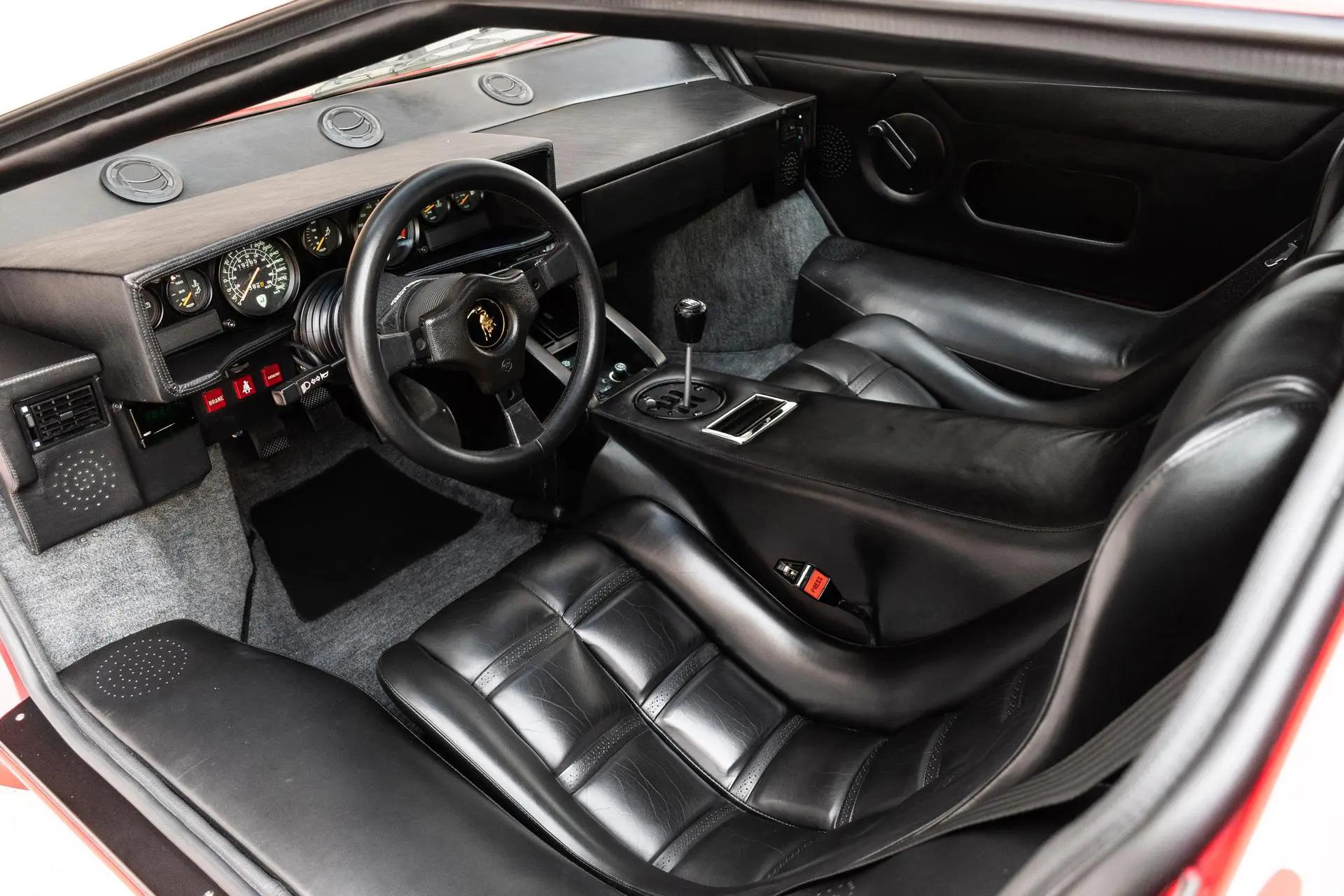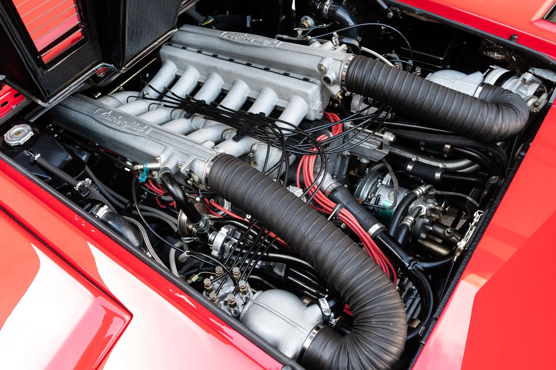 Rouge Siviglia (immaculé) avec une sellerie en cuir noir (immaculé), équipée de son V12 original (immaculé) Quad-Cam de 5L2 injection (conçu par Giotto Bizzarrini) disposant d’un angle de banc de cylindres de 60°, de quatre soupapes par cylindre et d’une injection de carburant Bosch K-Jetronic, cette Countach a été évalué en usine à 414 chevaux. Il est jumelé à une transmission manuelle cinq vitesses. L’ensemble affiche seulement 19.000 kms.