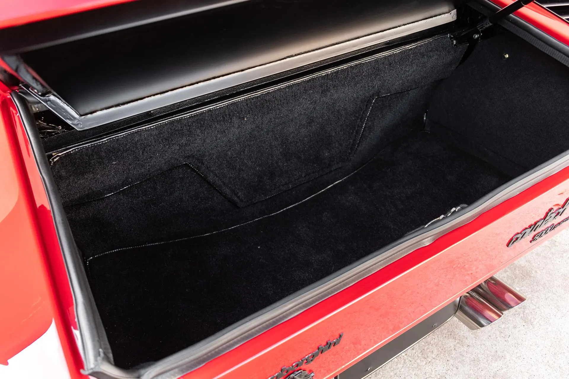 Le modèle 5000 QV a fait ses débuts en 1985 et utilisait des dessous avant et arrière en Kevlar. Cet exemplaire hyper rare est équipé des pare-chocs et de l’éclairage du marché européen, d’un échappement à quatre sorties, de rétroviseurs latéraux Vitaloni et de phares antibrouillard Carello. Les jantes Ruote OZ de 15 pouces sont badgées Lamborghini et montées avec des Pirelli P Zero Asymmetrico 225/50 AV et 345/35 AR indiquant les codes 2007 et 2011.