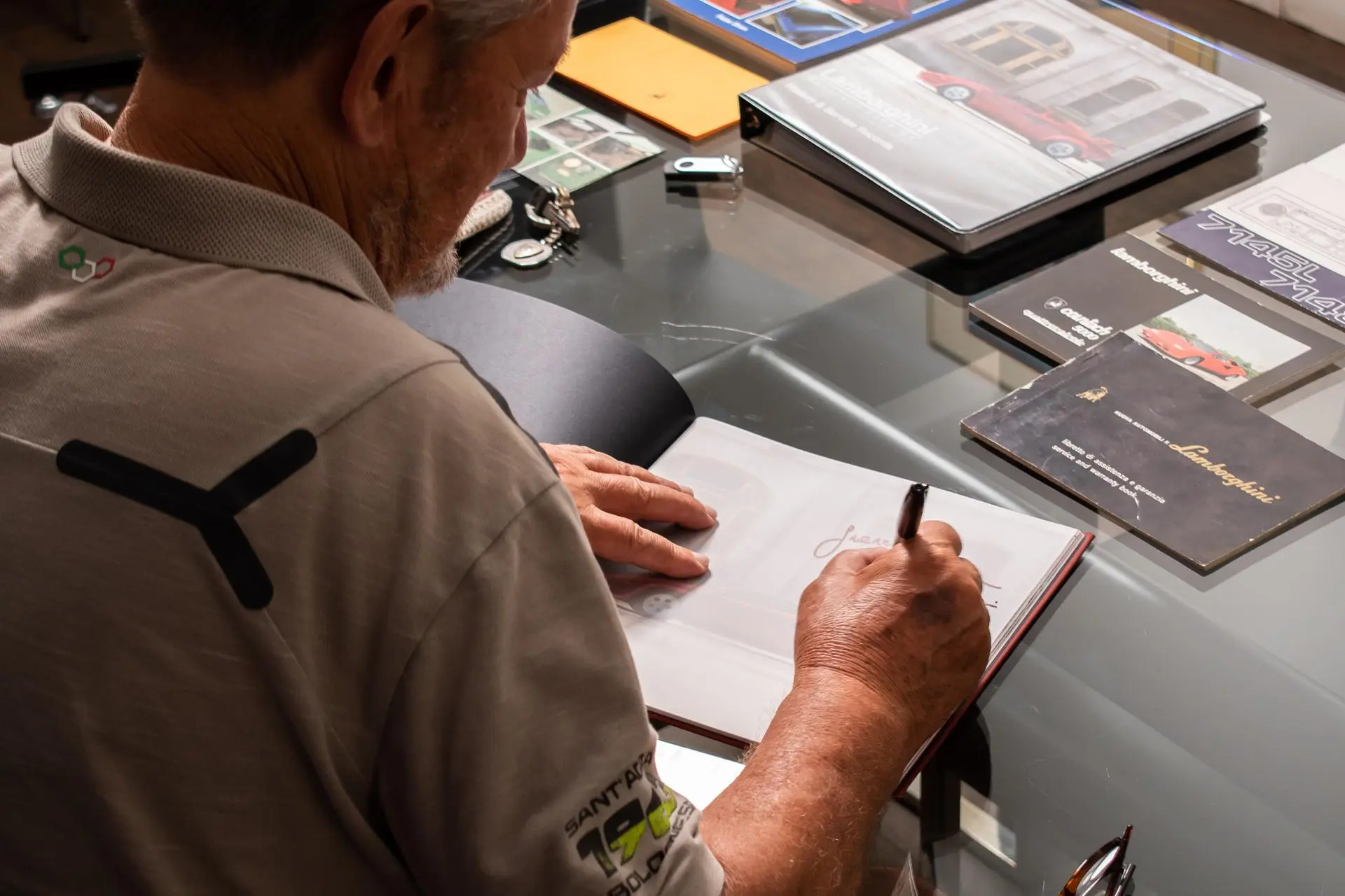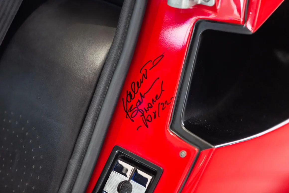 Le cadeau ultime qui sera livré avec cette Countach est une table/meuble rangement de salon contenant des albums-photos de la voiture et de Valentino Balboni (toujours souriant) qui signe le tout en dédicaces. Même la Countach est dédicacée (Valentino Balboni a signé le montant arrière de l’entrée de porte côté conducteur) ! Le montant espéré (à atteindre) a été arbitrairement défini au million de US$ !