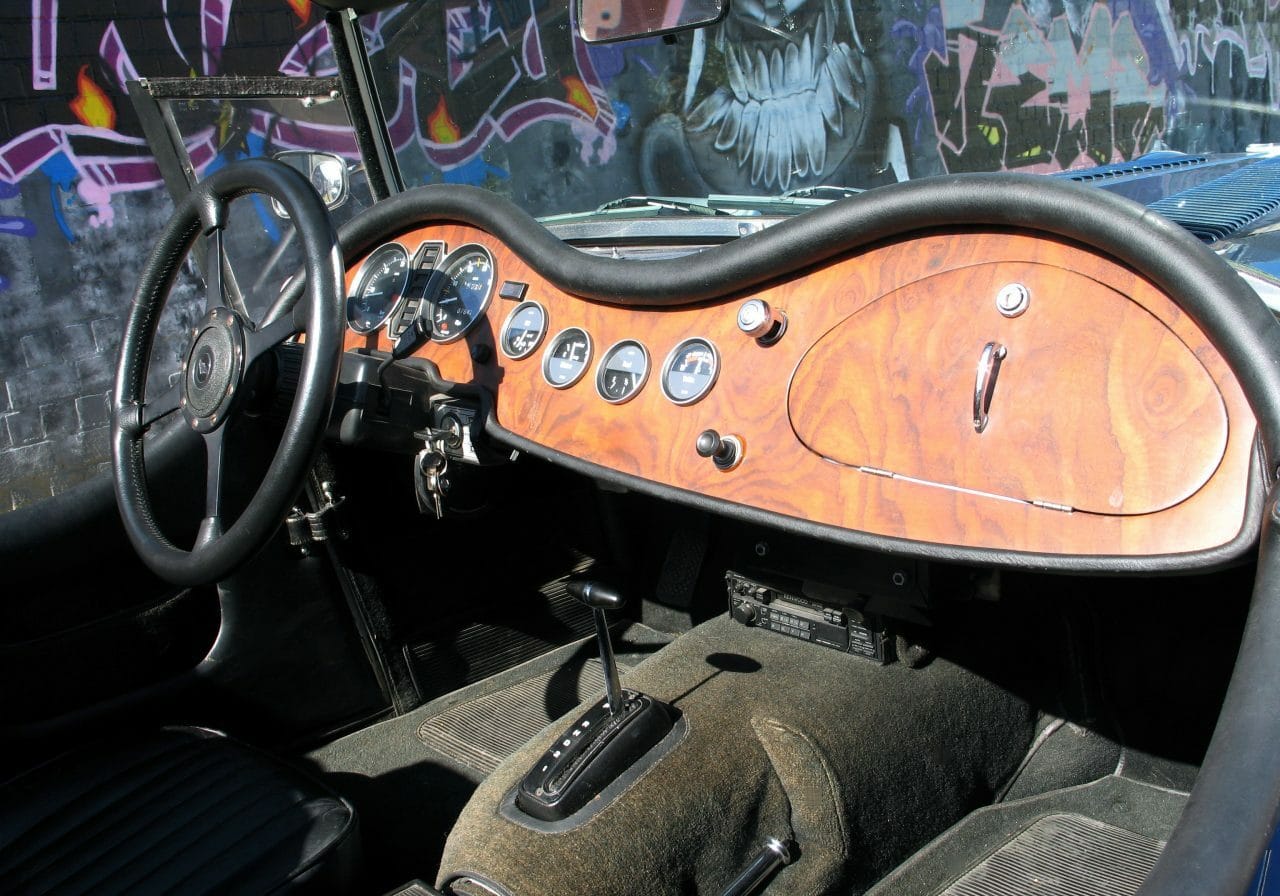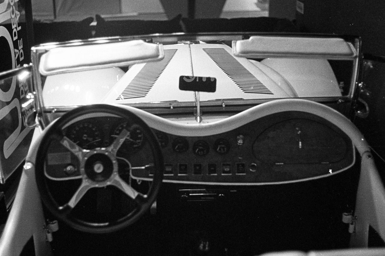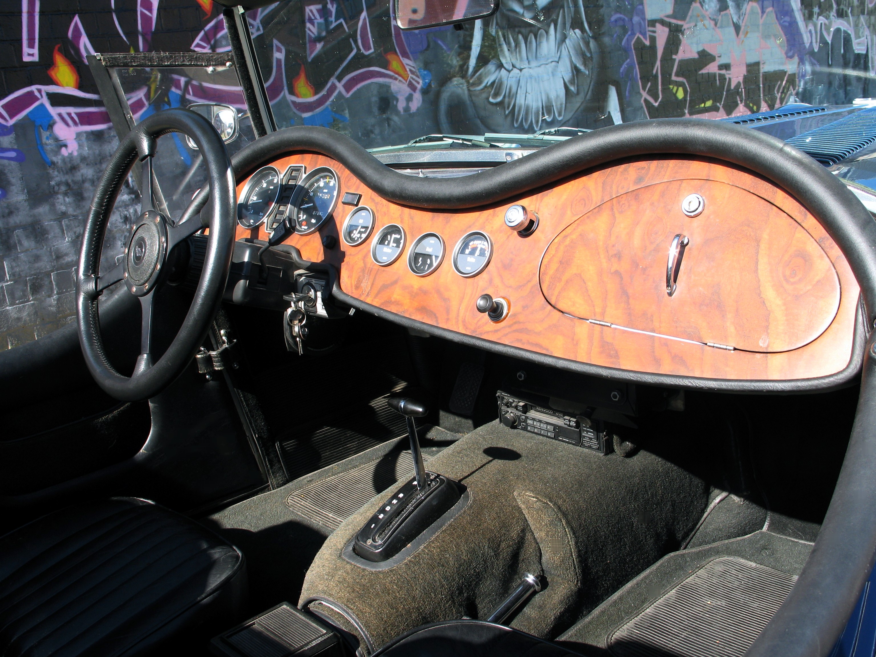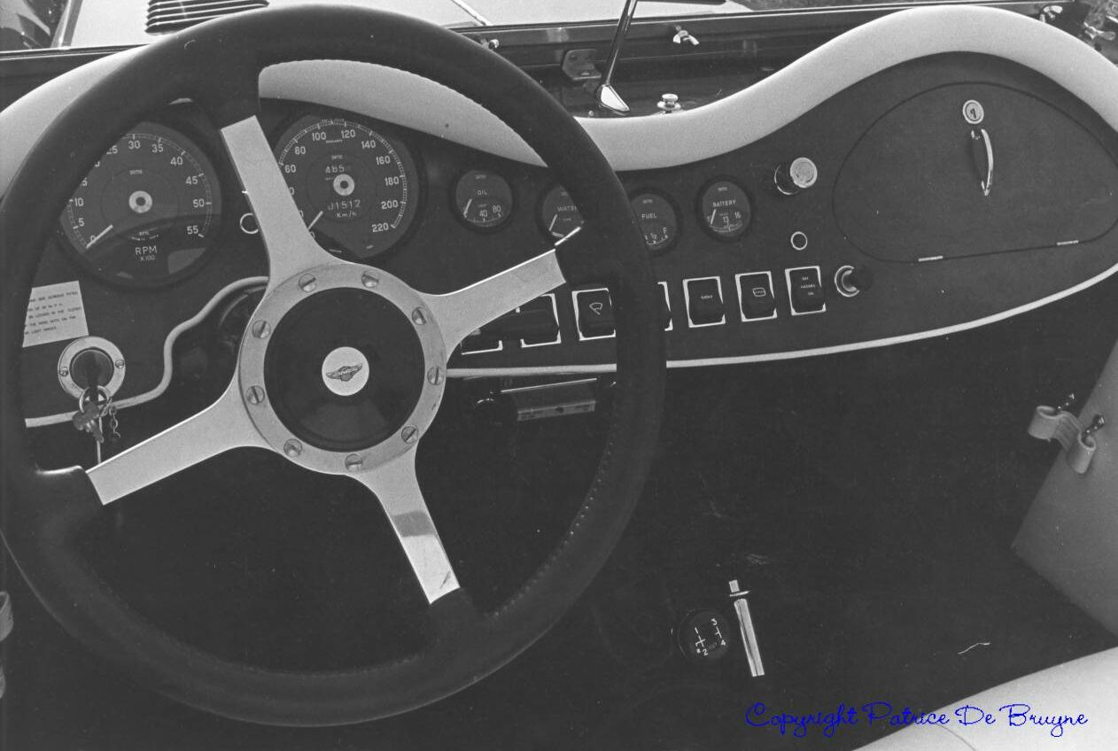 Pas de poignée extérieure, juste un levier du coté intérieur… et une fois que l’on a compris le maniement de l’objet, que le portillon est ouvert… il suffit de s’asseoir… Une fois installé à bord (le souci vient avant-tout de la porte sans aucune longueur suffisante pour les jambes, qui doivent se frayer un passage avec le volant qui prend beaucoup de place…, ce qui est pire encore quand la Panther est capotée)…, il suffit d’engager la clef dans le barillet, de tourner la dite clef dans celui-ci… et le démarreur s’enclenche, faisant tourner le 6 cylindres à carburateurs…