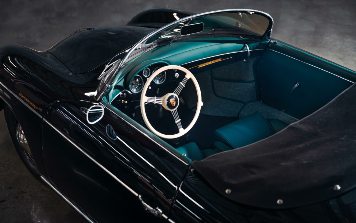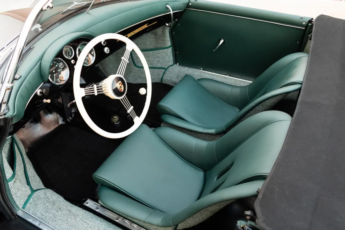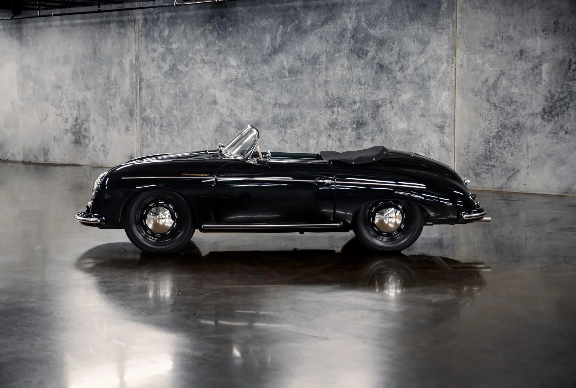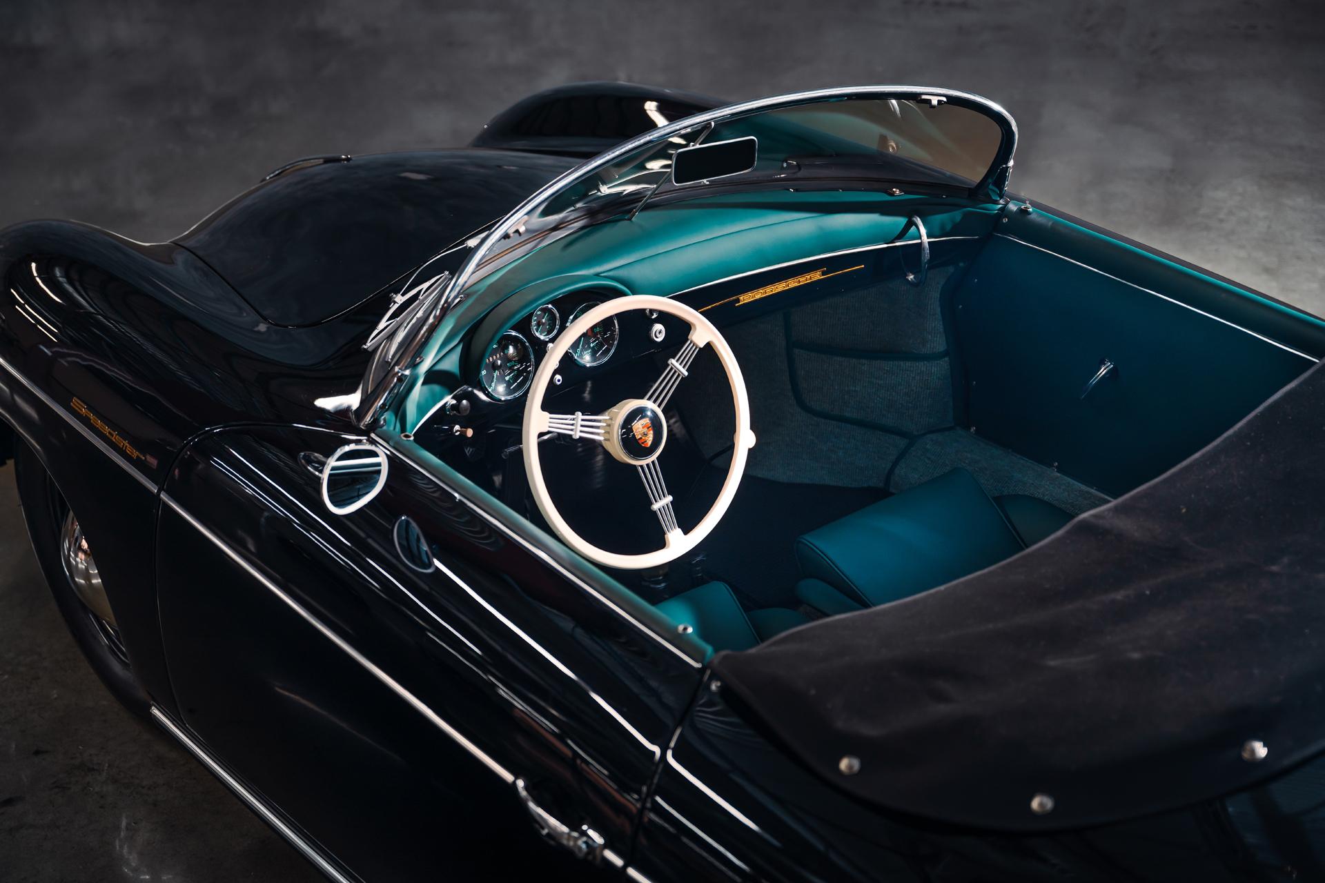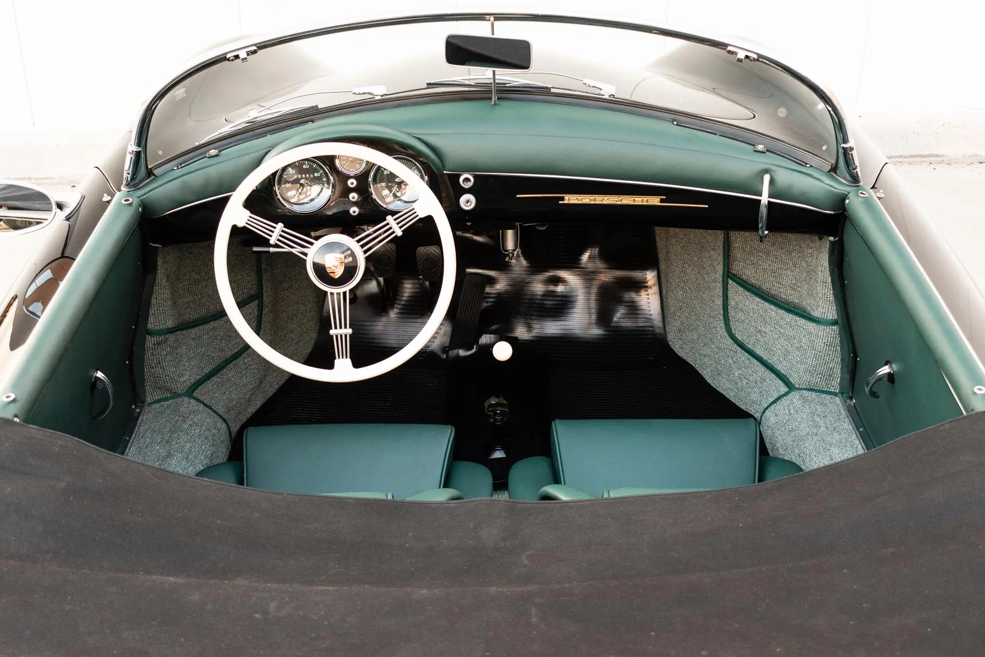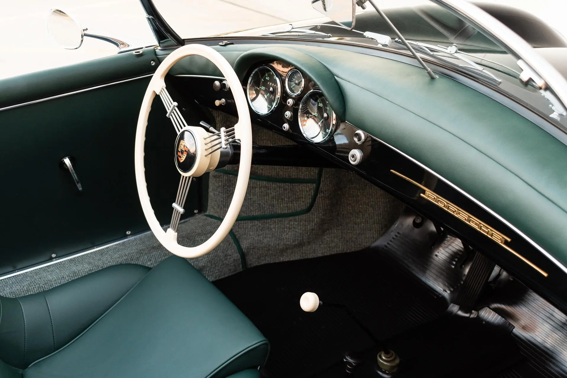 Construite le 8 novembre 1955 et distribuée via la Hoffman Motor Company à New York. La Porsche qui illustre cet article a une carrosserie Speedster construite par Reutter et est finie en noir avec capote noire et habillage de l’habitacle vert. Le moteur est un quatre cylindres “à plat” de 1L6 jumelé à une boîte-pont manuelle à quatre vitesses, et l’équipement supplémentaire comprend des roues en acier de 16 pouces, des sièges baquets à dossiers fixes et le système électrique a été changé de 8 en 12 volts. Le cockpit dont les sièges baquets ont été garnis en cuir vert. Une sellerie vinyle de couleur coordonnée a également été installée sur le tableau de bord et les panneaux de porte, et des tapis verts à tissage carré comme à l’origine ont été installés.