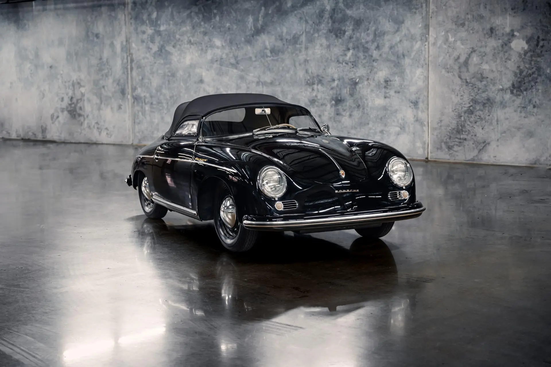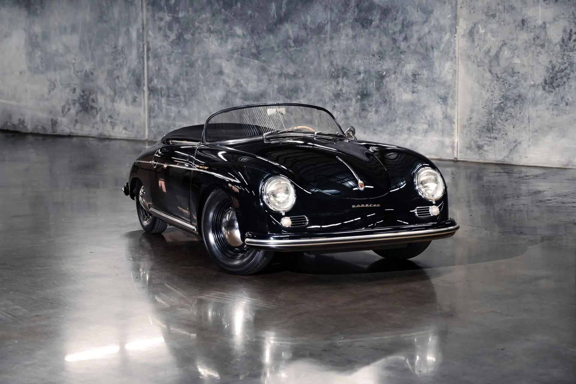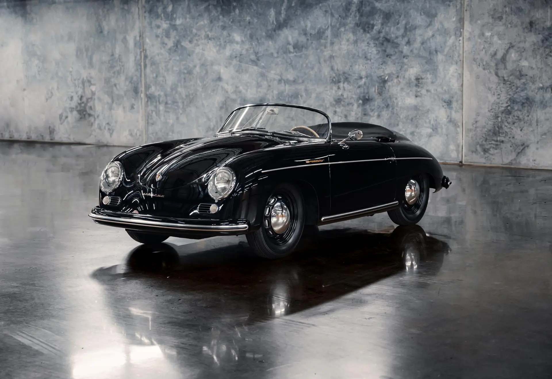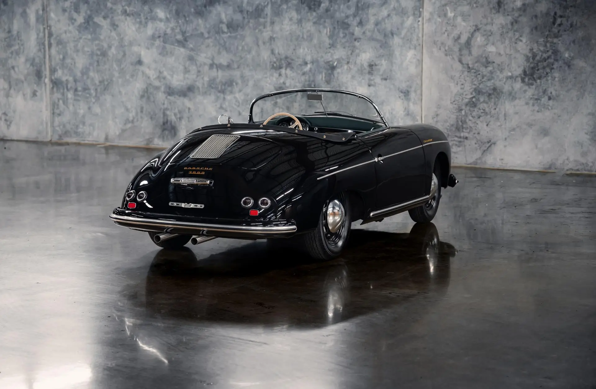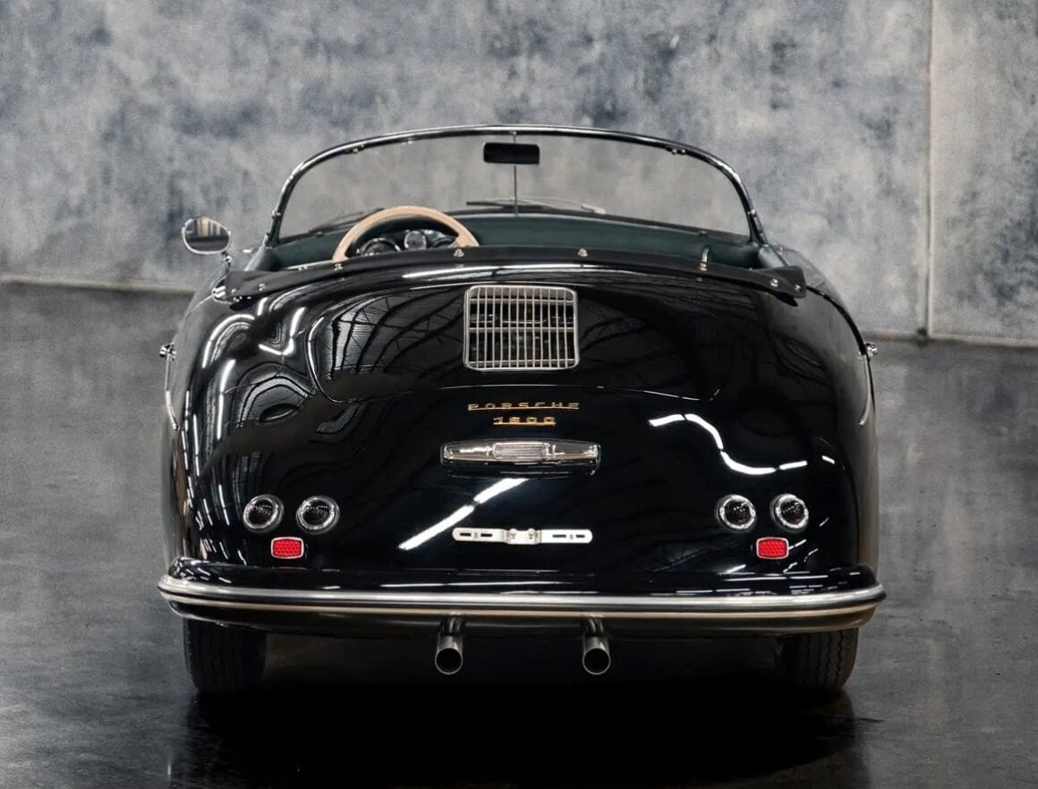 Construite le 8 novembre 1955 et distribuée via la Hoffman Motor Company à New York. La Porsche qui illustre cet article a une carrosserie Speedster construite par Reutter et est finie en noir avec capote noire et habillage de l’habitacle vert. Le moteur est un quatre cylindres “à plat” de 1L6 jumelé à une boîte-pont manuelle à quatre vitesses, et l’équipement supplémentaire comprend des roues en acier de 16 pouces, des sièges baquets à dossiers fixes et le système électrique a été changé de 8 en 12 volts. Le cockpit dont les sièges baquets ont été garnis en cuir vert. Une sellerie vinyle de couleur coordonnée a également été installée sur le tableau de bord et les panneaux de porte, et des tapis verts à tissage carré comme à l’origine ont été installés.