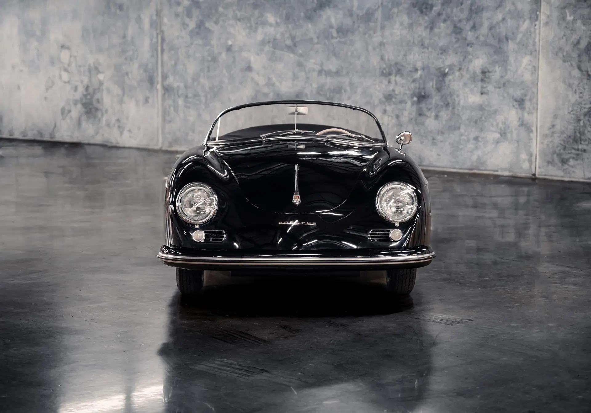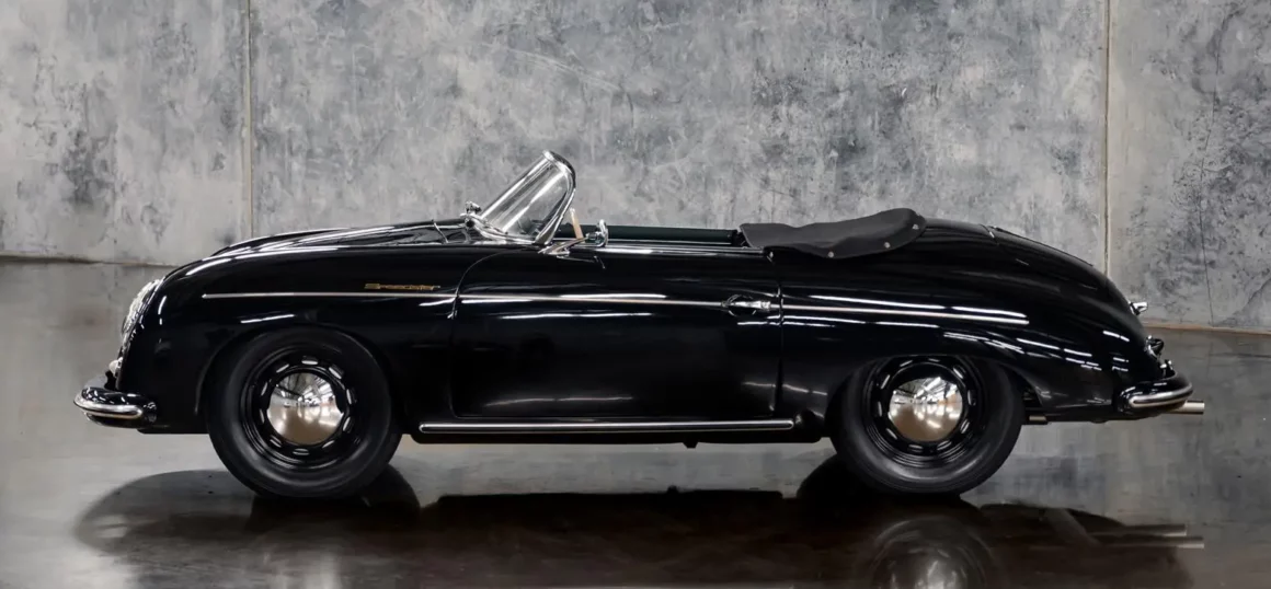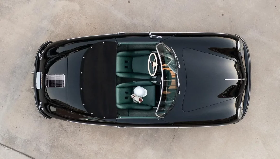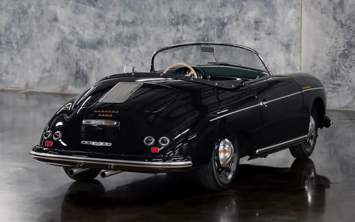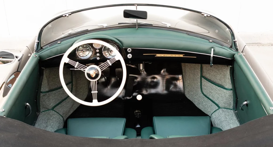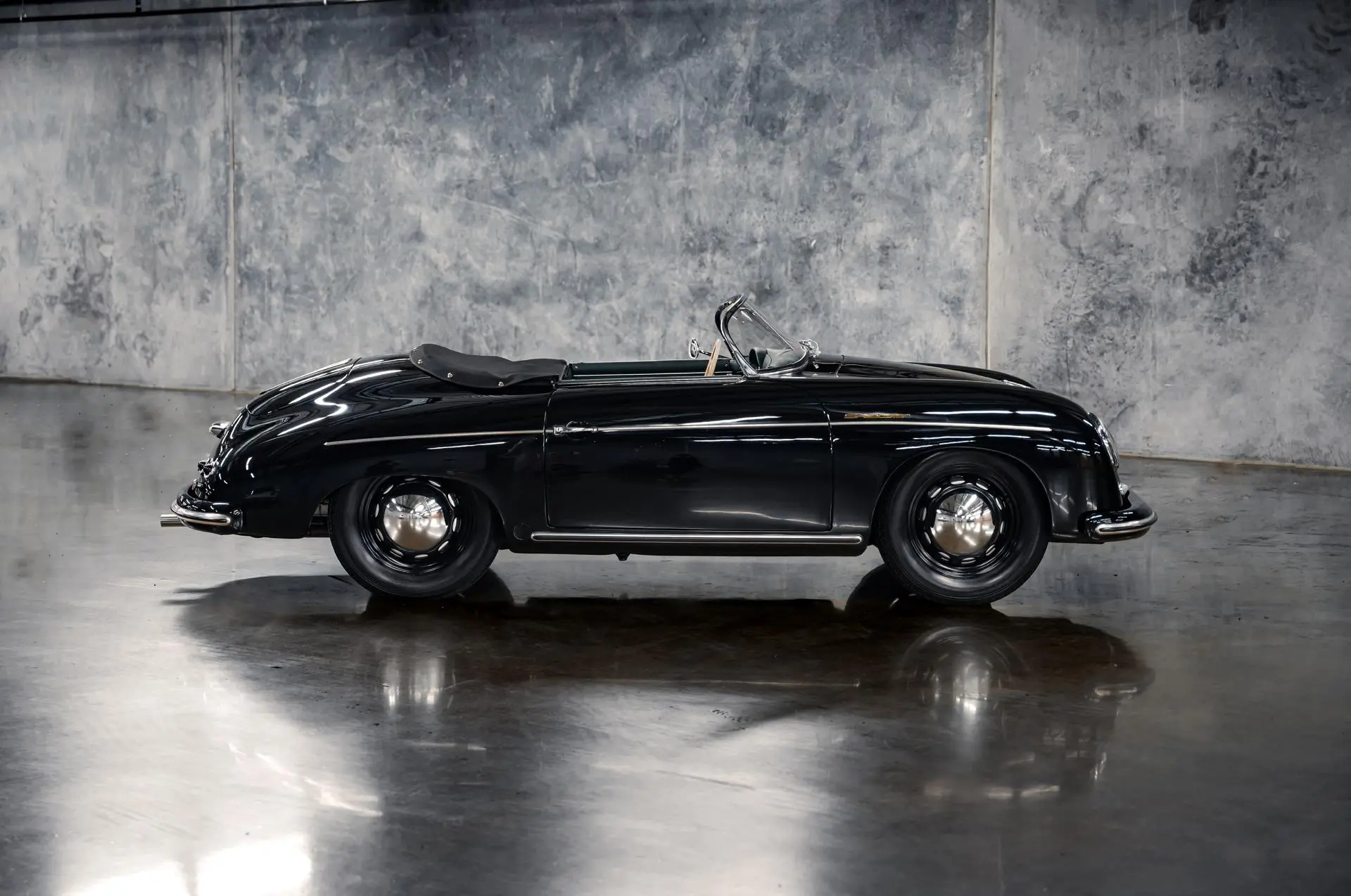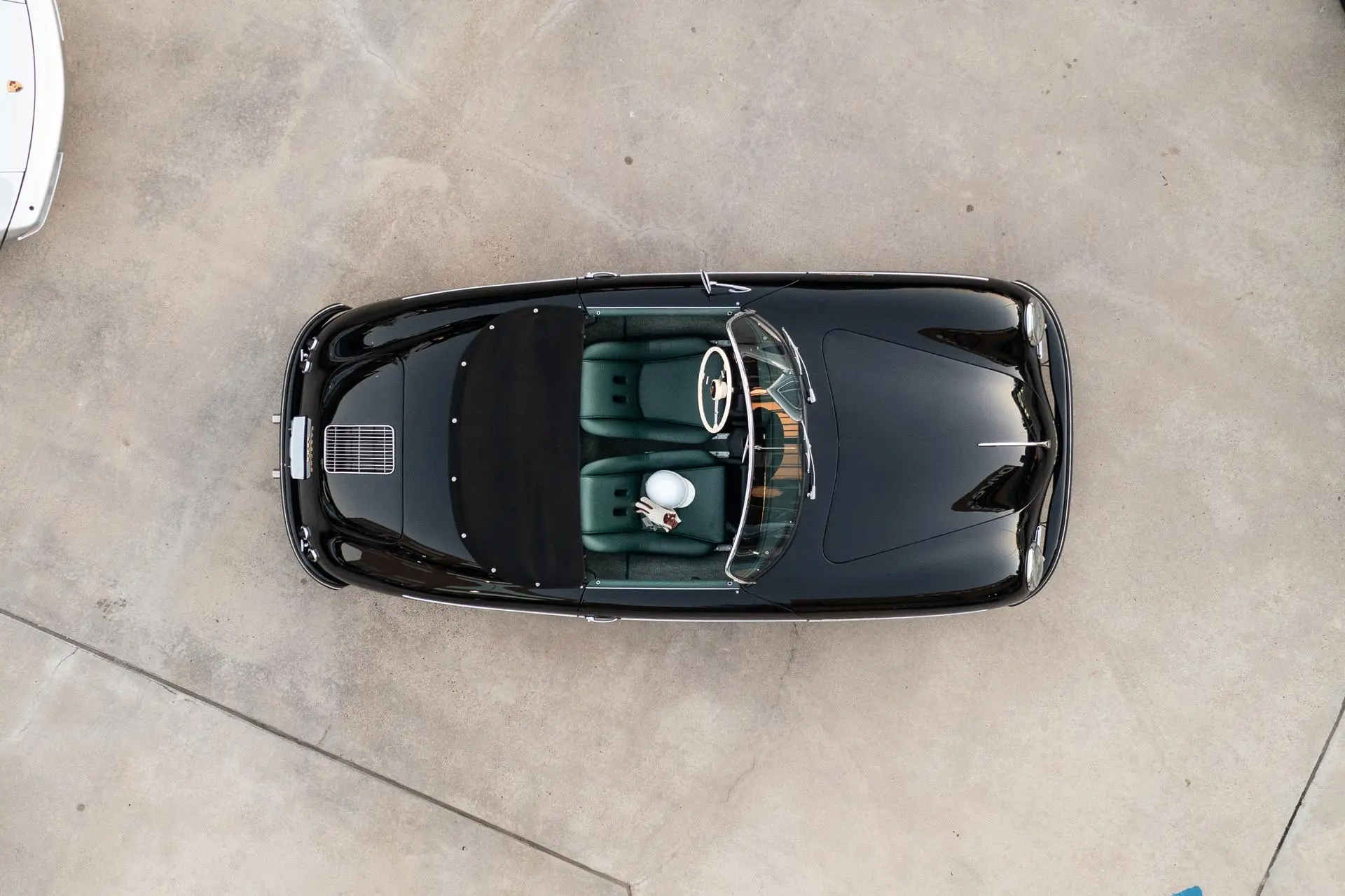Construite le 8 novembre 1955 et distribuée via la Hoffman Motor Company à New York. La Porsche qui illustre cet article a une carrosserie Speedster construite par Reutter et est finie en noir avec capote noire et habillage de l’habitacle vert. Le moteur est un quatre cylindres “à plat” de 1L6 jumelé à une boîte-pont manuelle à quatre vitesses, et l’équipement supplémentaire comprend des roues en acier de 16 pouces, des sièges baquets à dossiers fixes et le système électrique a été changé de 8 en 12 volts. Le cockpit dont les sièges baquets ont été garnis en cuir vert. Une sellerie vinyle de couleur coordonnée a également été installée sur le tableau de bord et les panneaux de porte, et des tapis verts à tissage carré comme à l’origine ont été installés.