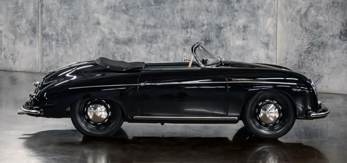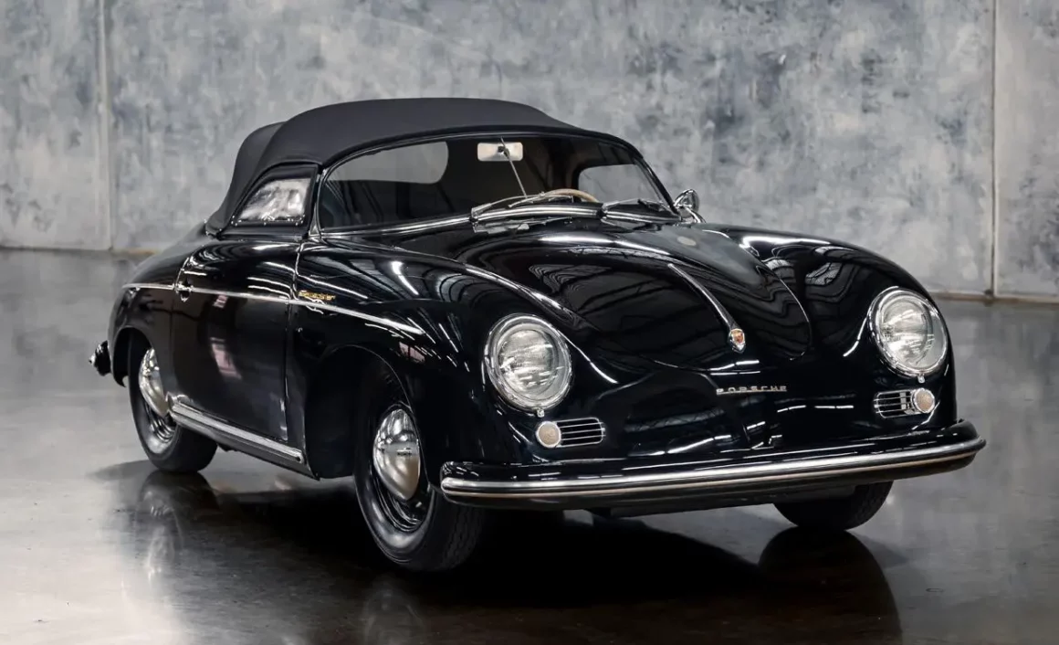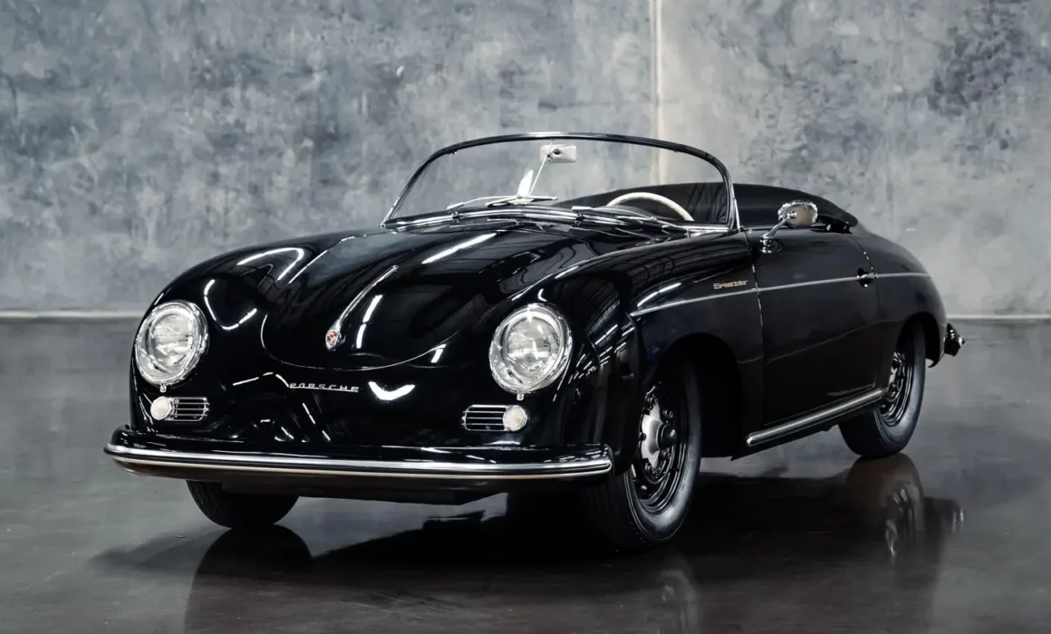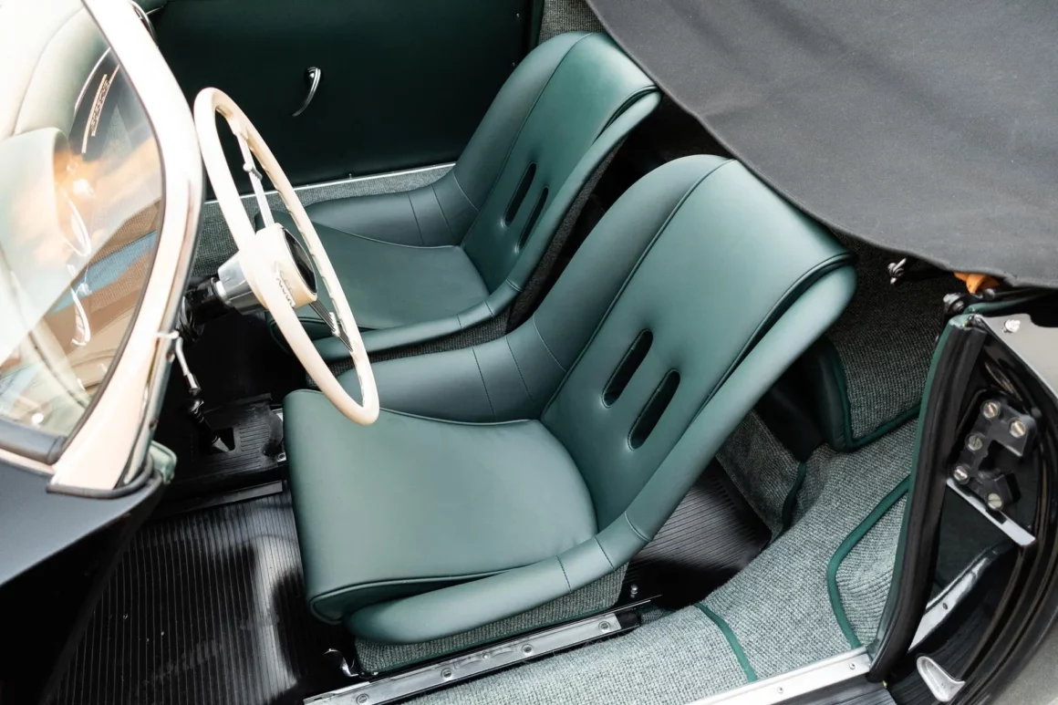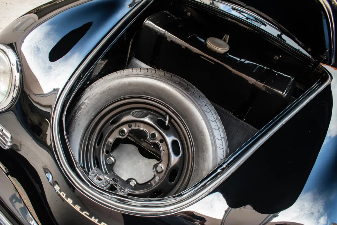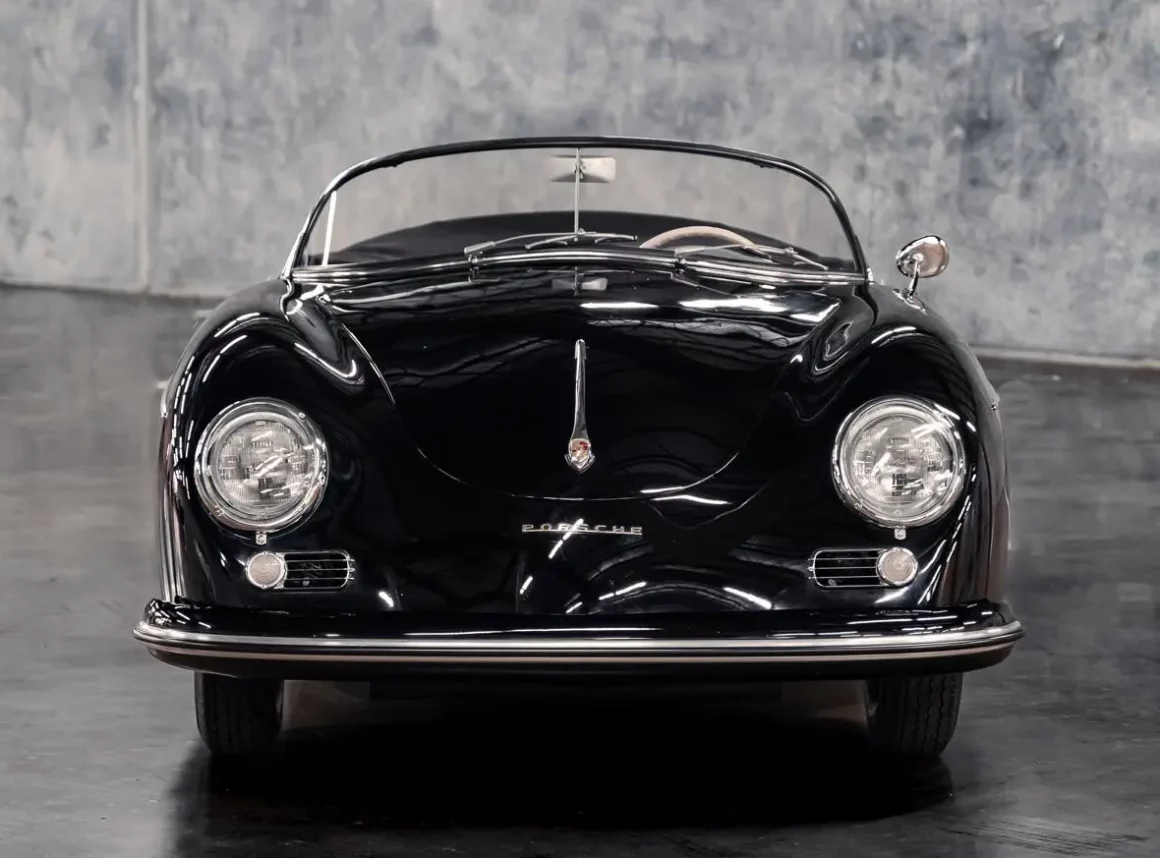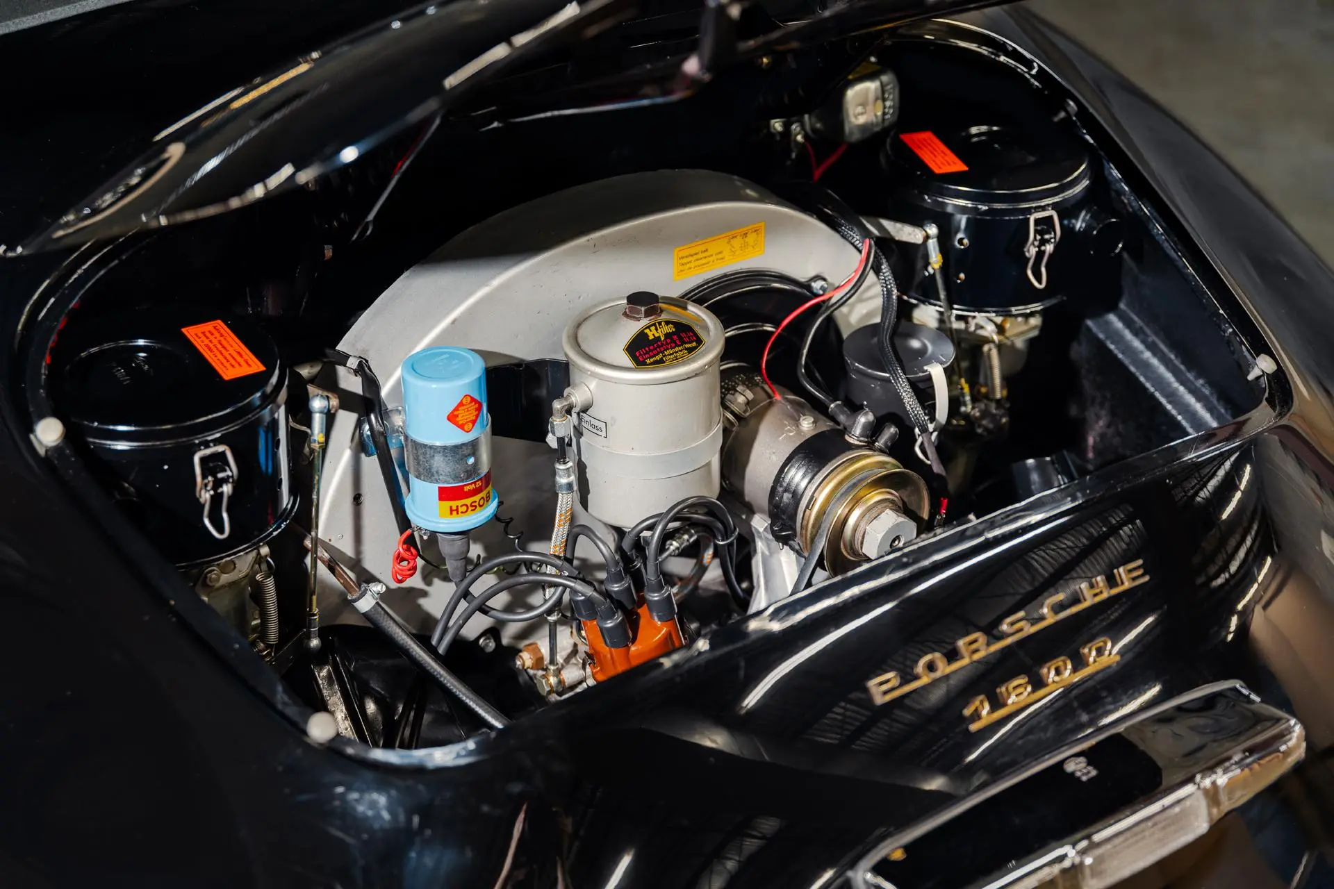 Construite le 8 novembre 1955 et distribuée via la Hoffman Motor Company à New York. La Porsche qui illustre cet article a une carrosserie Speedster construite par Reutter et est finie en noir avec capote noire et habillage de l’habitacle vert. Le moteur est un quatre cylindres “à plat” de 1L6 jumelé à une boîte-pont manuelle à quatre vitesses, et l’équipement supplémentaire comprend des roues en acier de 16 pouces, des sièges baquets à dossiers fixes et le système électrique a été changé de 8 en 12 volts. Le cockpit dont les sièges baquets ont été garnis en cuir vert. Une sellerie vinyle de couleur coordonnée a également été installée sur le tableau de bord et les panneaux de porte, et des tapis verts à tissage carré comme à l’origine ont été installés.