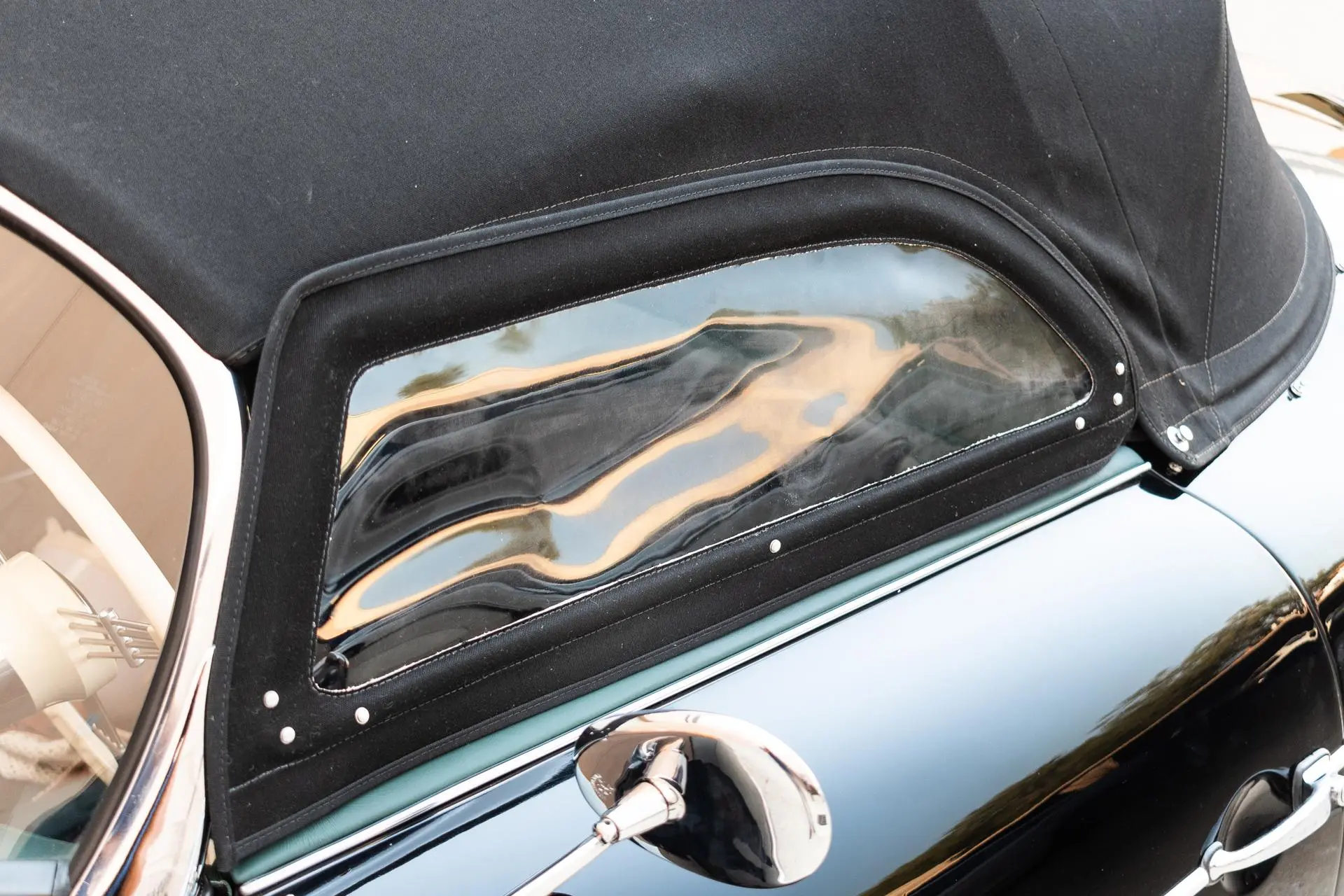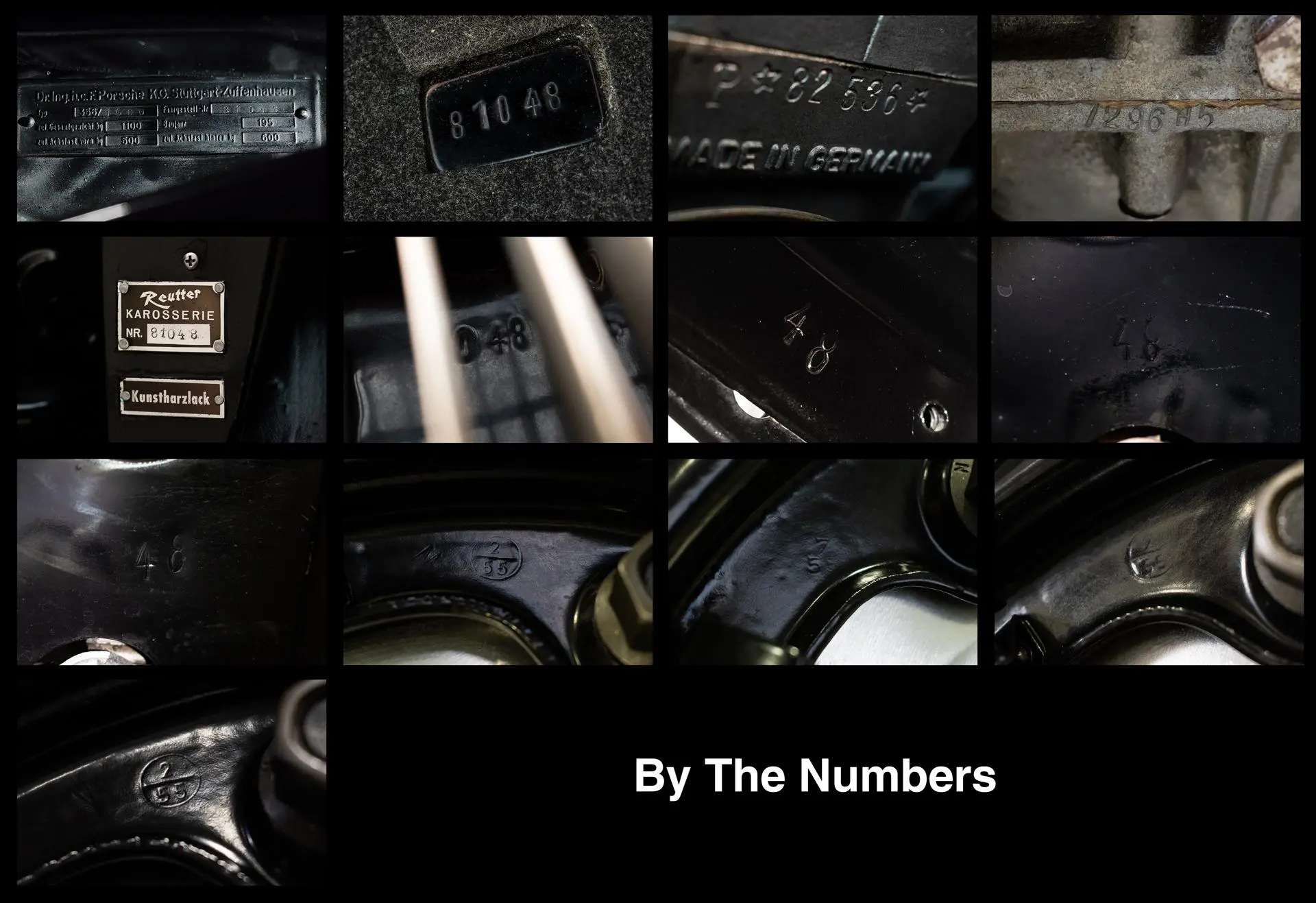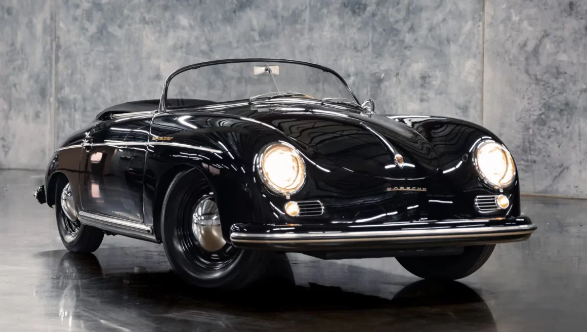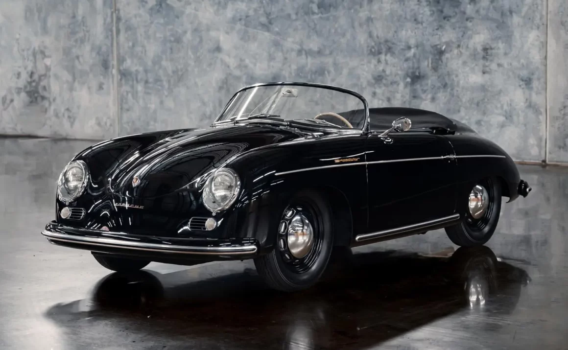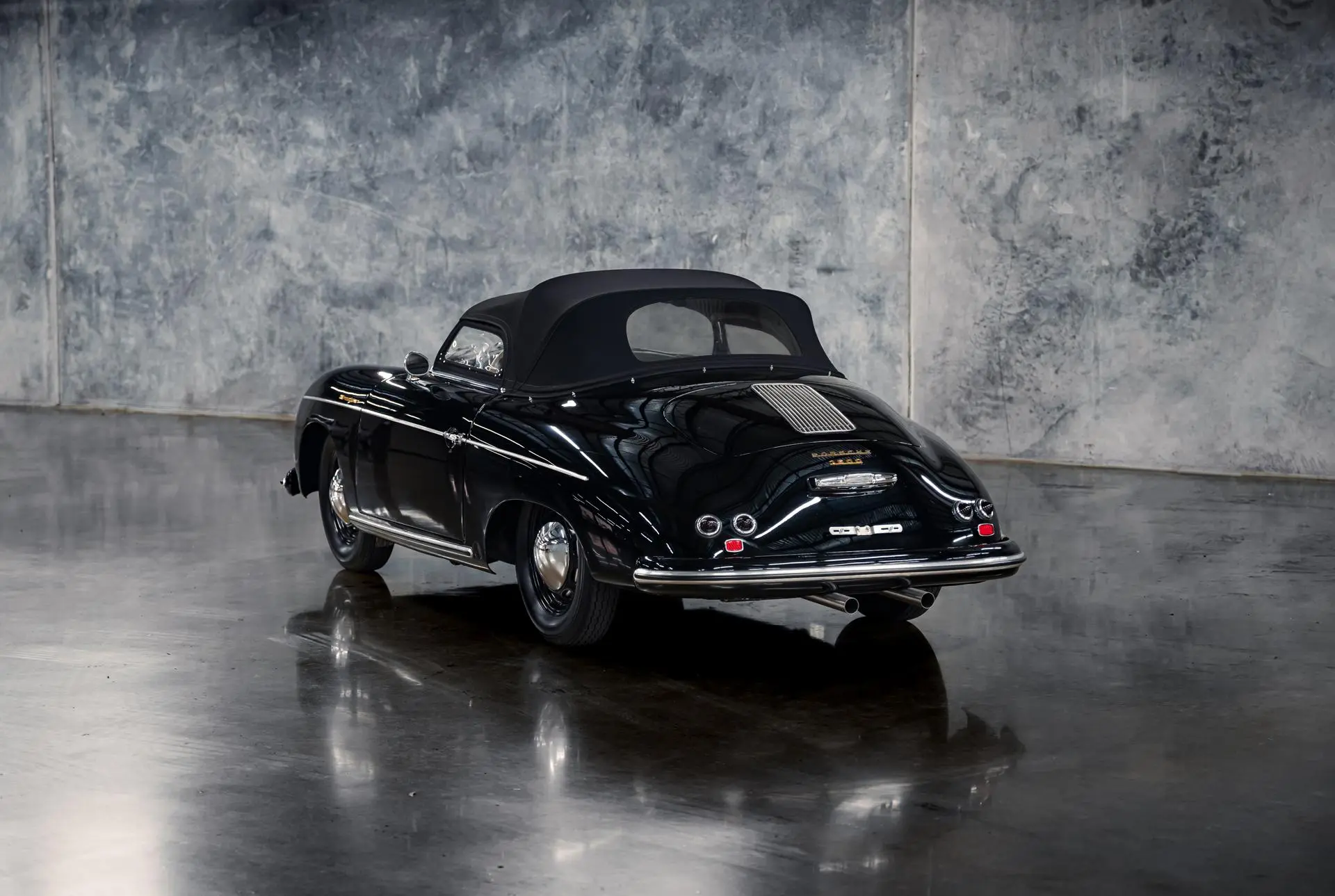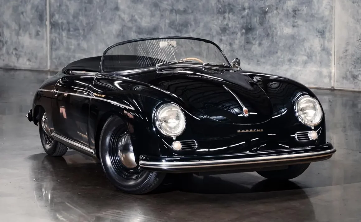 Construite le 8 novembre 1955 et distribuée via la Hoffman Motor Company à New York. La Porsche qui illustre cet article a une carrosserie Speedster construite par Reutter et est finie en noir avec capote noire et habillage de l’habitacle vert. Le moteur est un quatre cylindres “à plat” de 1L6 jumelé à une boîte-pont manuelle à quatre vitesses, et l’équipement supplémentaire comprend des roues en acier de 16 pouces, des sièges baquets à dossiers fixes et le système électrique a été changé de 8 en 12 volts. Le cockpit dont les sièges baquets ont été garnis en cuir vert. Une sellerie vinyle de couleur coordonnée a également été installée sur le tableau de bord et les panneaux de porte, et des tapis verts à tissage carré comme à l’origine ont été installés.