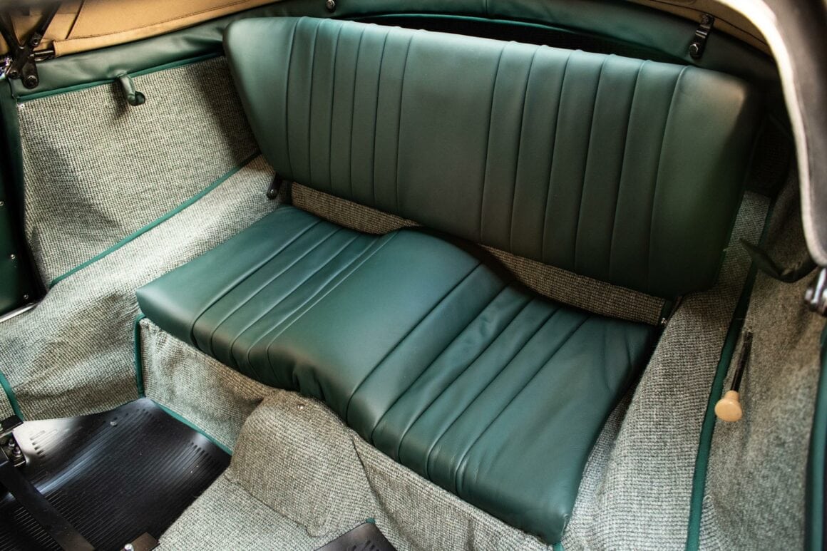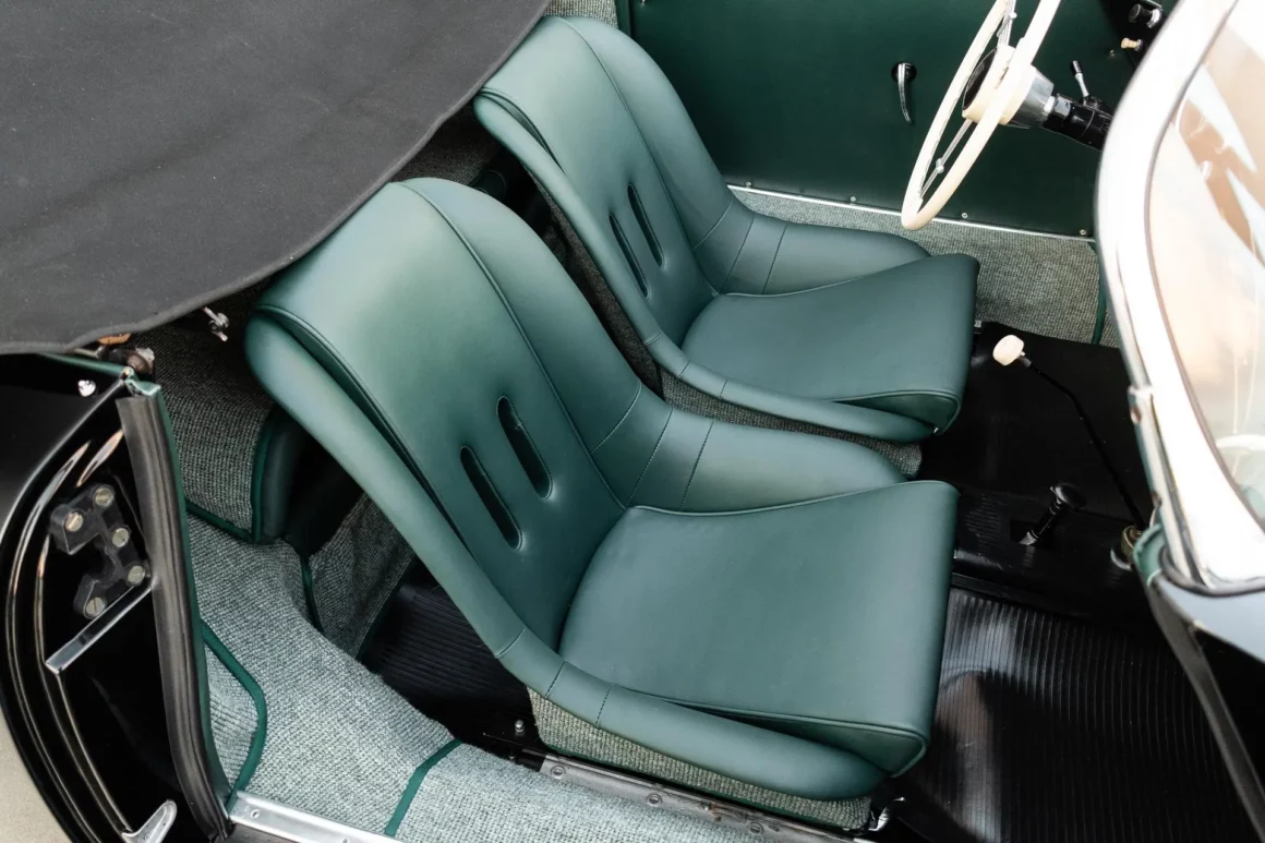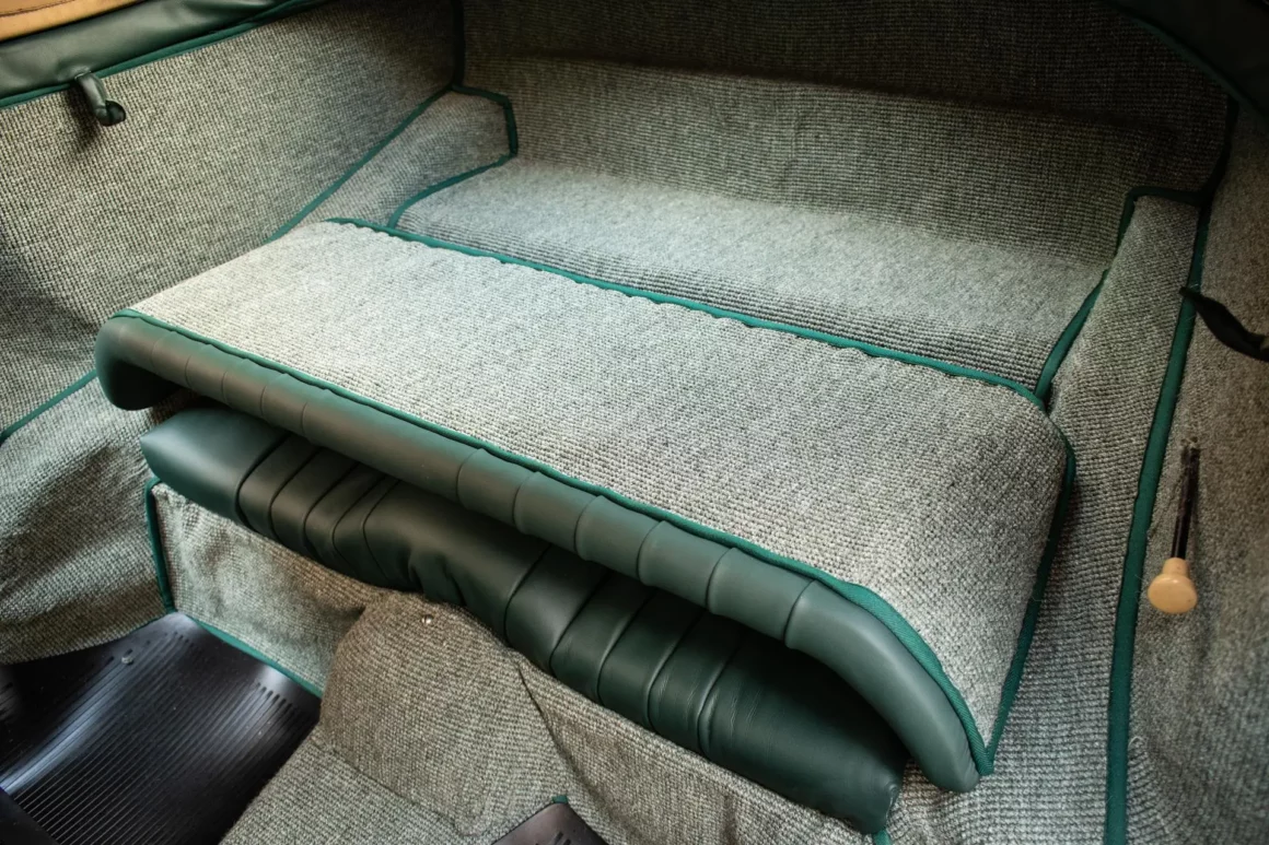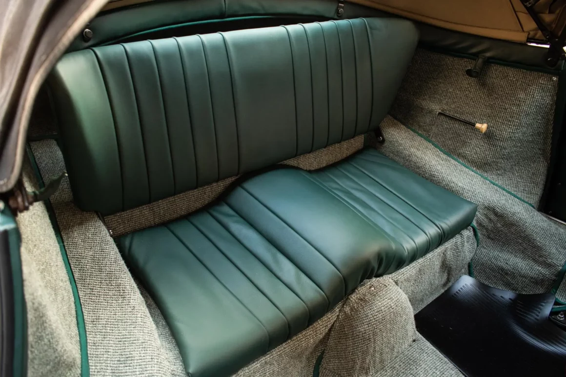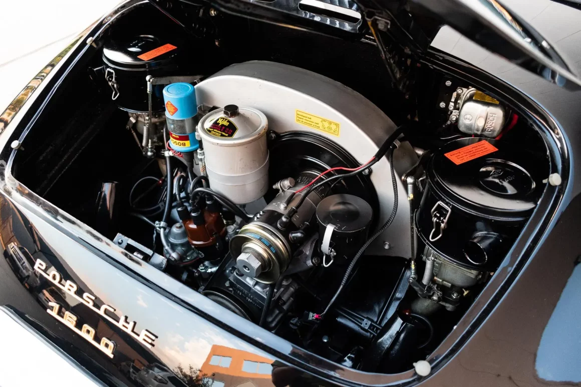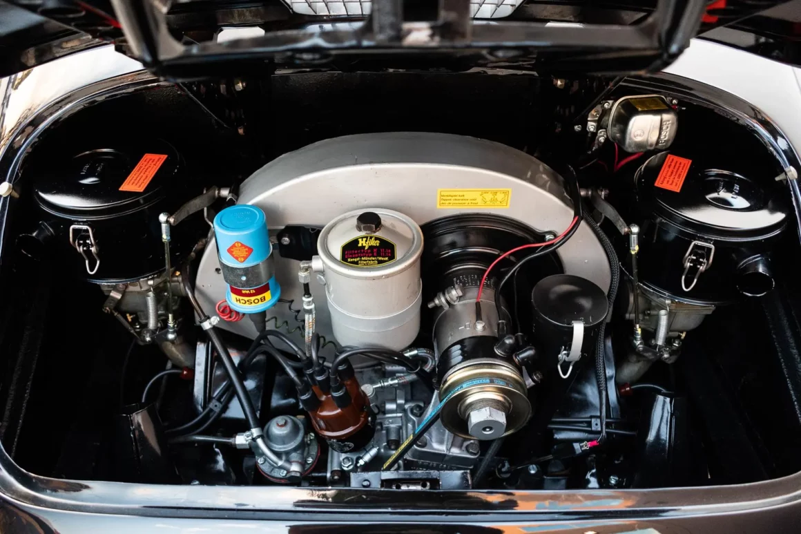 Des tapis en caoutchouc noir tapissent également les planchers et l’équipement comprend un badge de tableau de bord doré, un rétroviseur réglable et une poignée de maintien pour les passagers. Des réparations du faisceau de câblage ont été effectuées en août 2019. Un volant blanc de style banjo encadre un compteur de vitesse Veigel de 120 mph en lettres vertes, un tachymètre 6k-tr/min et une jauge de température d’huile Störk. L’odomètre à cinq chiffres indique 49.000 miles, bien que le kilométrage total réel soit inconnu. Un quatre cylindres à plat Type 616/2 1L6 de remplacement a été installé et dispose de deux carburateurs avec filtres à air Knecht. Le réservoir de carburant a été reconstruit en août 2019.