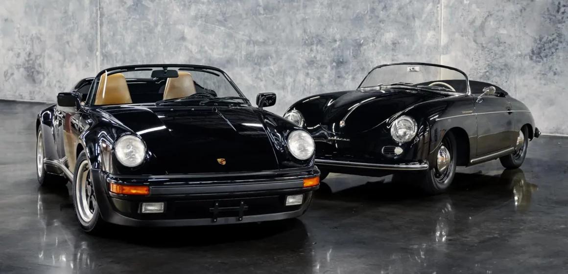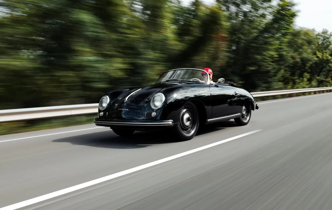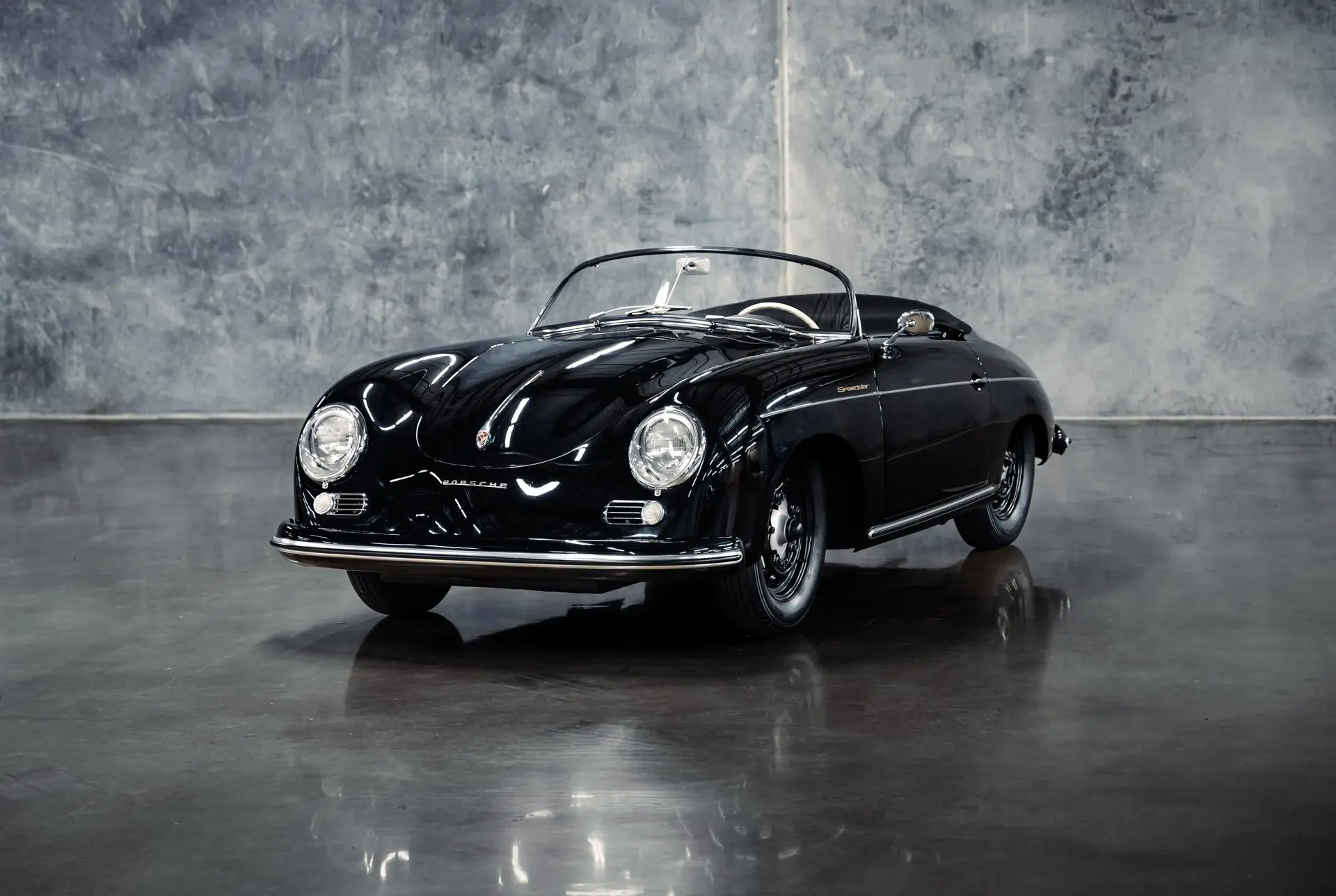 Pour expliquer le succès d’une telle voiture, Neumann déclara un jour : “Le samedi soir en juin, les gars veulent descendre Sunset boulevard le bras à la portière pour que les filles puissent les voir dans leur voiture”... Reconnaissable au premier coup d’œil à son pare-brise recourbé et aplati plutôt qu’en V en deux parties, à sa toute petite capote amovible, à son jonc chromé latéral au niveau des poignées de portes, à sa ceinture de caisse abaissée et à ses deux sièges baquets, le Speester était censé faire concurrence aux petites sportives britanniques bon marché. Il recevait au départ le moteur VW flat-four de 1L5, mais doté d’une version 1L6 de 60cv à l’apparition du modèle 356 A, en 1955. Affiché à 2.995 dollars, le Speedster était la plus légère des Porsche 356.