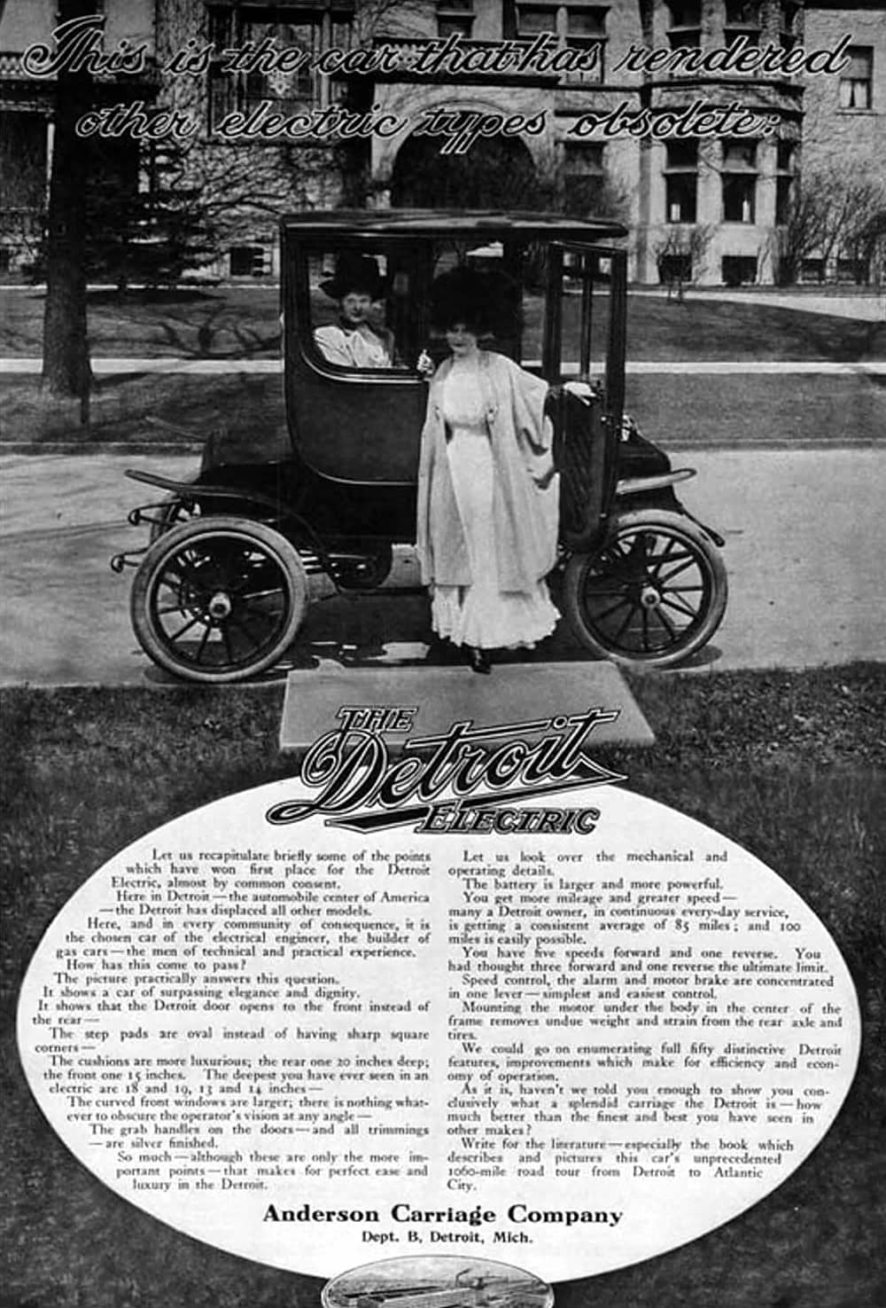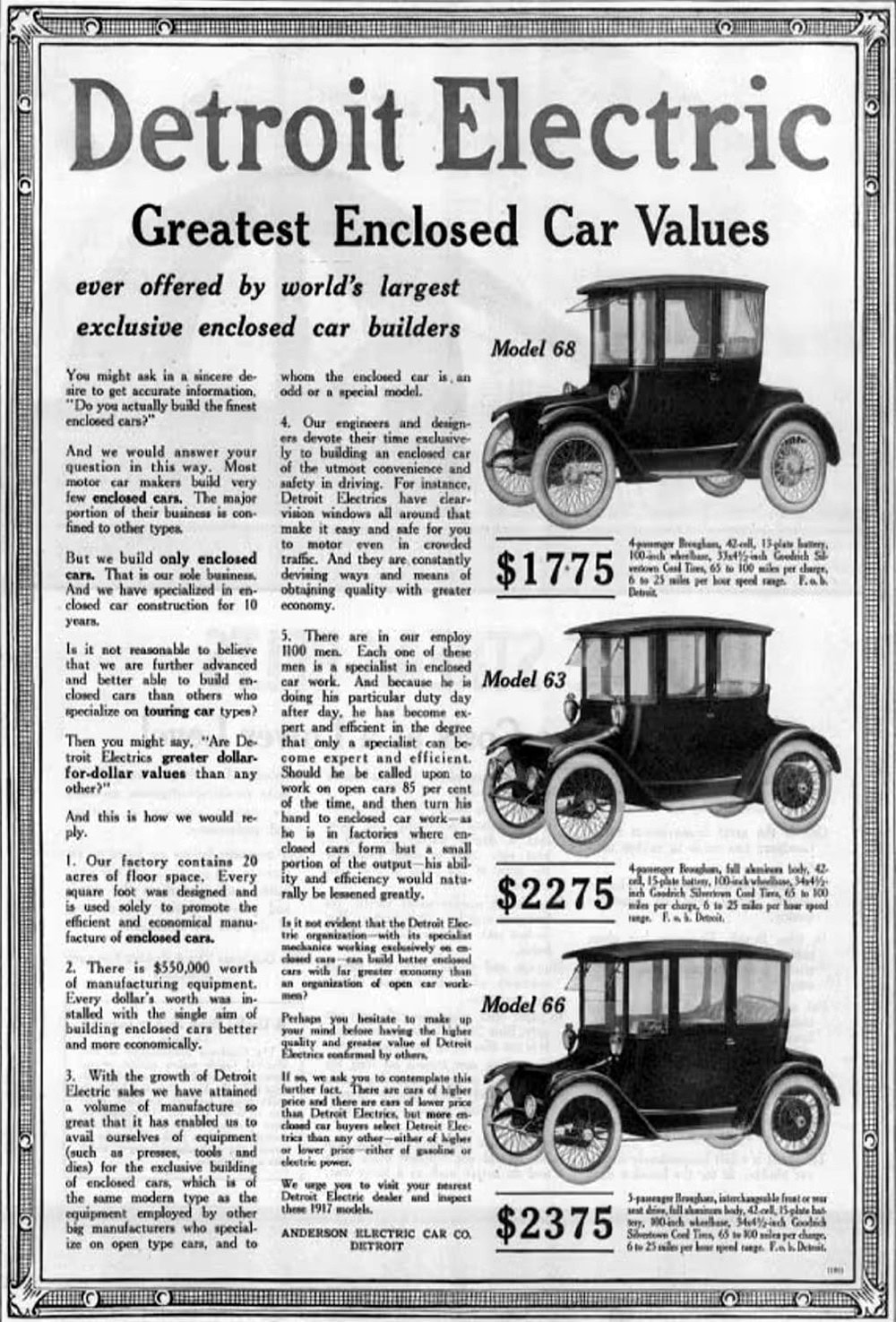 En 1921, le modèle T approchait du sommet de sa popularité. Henry Ford avait apporté peu de modifications à la T depuis son introduction à l’automne 1908, et pourtant les ventes continuaient de grimper. De même, l’Anderson Electric Car Company n’avait pas apporté beaucoup de modifications à ses modèles Detroit Electric depuis 1914 environ. Les voitures électriques avaient rivalisé avec l’essence au cours de la décennie précédente, stimulées par les prix élevés du carburant pendant la Grande Guerre 1914/1918, mais les ventes ont commencé à décliner en 1922. À l’époque comme aujourd’hui, les voitures électriques étaient chères à construire, de sorte que la Detroit Electric s’est positionnée comme une voiture de luxe.