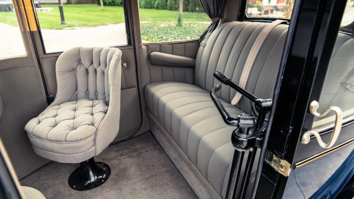 L’habitacle du modèle 90 est d’ailleurs, dans cet esprit aménagé comme un salon Edouardien, avec une moquette moelleuse, des rideaux, des vases à fleurs et, ce qui semble être une causeuse bien rembourrée le long du mur du fond. C’est en fait, le perchoir de la conductrice et de son compagnon (j’ai indiqué “conductrice” car les voitures électriques étaient invariablement commercialisées auprès des femmes ! Même Clara Ford, l’épouse d’Henry Ford, était l’une des clientes les plus importantes de Detroit Electric)… Il y a donc un siège baquet très moelleux à l’avant qui pivote vers la banquette arrière pour socialiser (à l’arrêt) et un petit tabouret rembourré pour un quatrième occupant.