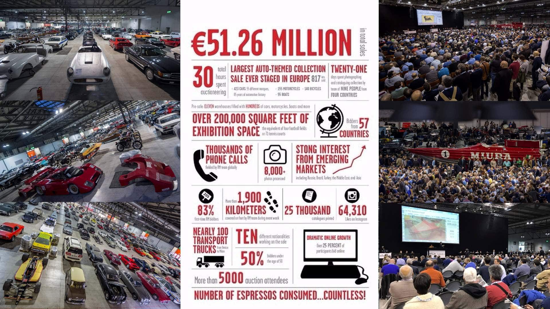 L’ensemble, dénommé : “Duemila Ruote” (2000 roues) a été vendu à Milan (Italie) les 24 & 25 novembre 2016, coïncidant avec la foire automobile géante “Milano Auto Classica”, de même “poids” que “Techno Classica” à Essen en Allemagne (200.000 entrées) et que “Retromobile” à Paris/France (125.000 entrées).
