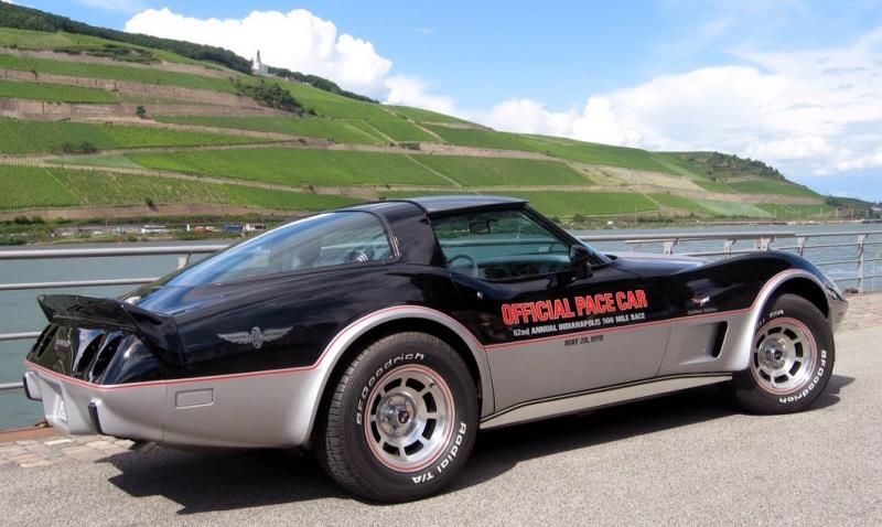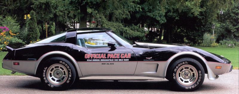 1978 : 25ème anniversaire de la Corvette, première Pace-car. 1er restyling depuis 1968 : le toit est entièrement modifié et retour de la lunette arrière monobloc (bulle) qui vient remplacer le vitrage “tunnel”. A l’occasion de cet anniversaire, on peut commander la version “Indy Package” (la copie du modèle retenu pour servir de Pace-car aux 500 miles d’Indianapolis) sous le nom de code “Z78”. Cela inclut : une livrée noire en haut et grise en bas avec un liseré rouge en séparation, une série de sticker (optionnels) rappelant le Pace-car, un becquet arrière, le marquage en blanc des flancs de pneus, des roues en aluminium et toutes les options de l’époque. Côté moteurs, toujours les deux même qu’en 1976 : le L48 de 175cv ou 180cv et le L82 de 220cv.