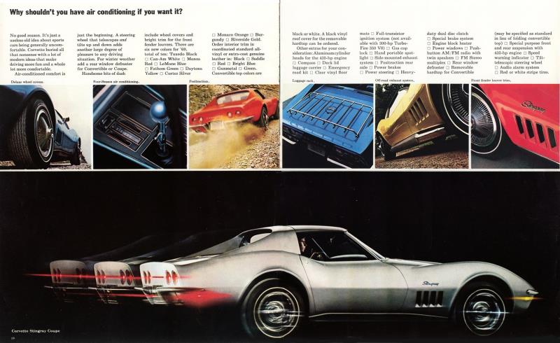 1969 : le sigle “Stingray” réapparaît après un an d’absence, mais cette fois-ci en un seul mot. Il se trouve au-dessus des 4 ouies de l’aile avant. Gros changements dans les options moteurs, toujours sur deux bases. Les 5733cc : le ZQ3 de 300ch et le L46 de 350cv. Les 7011cc : le L36 de 390cv, le L68 de 400cv, le L71 de 435cv, le L88 de 560cv, L89 de 435cv et le ZL1 de 430cv.