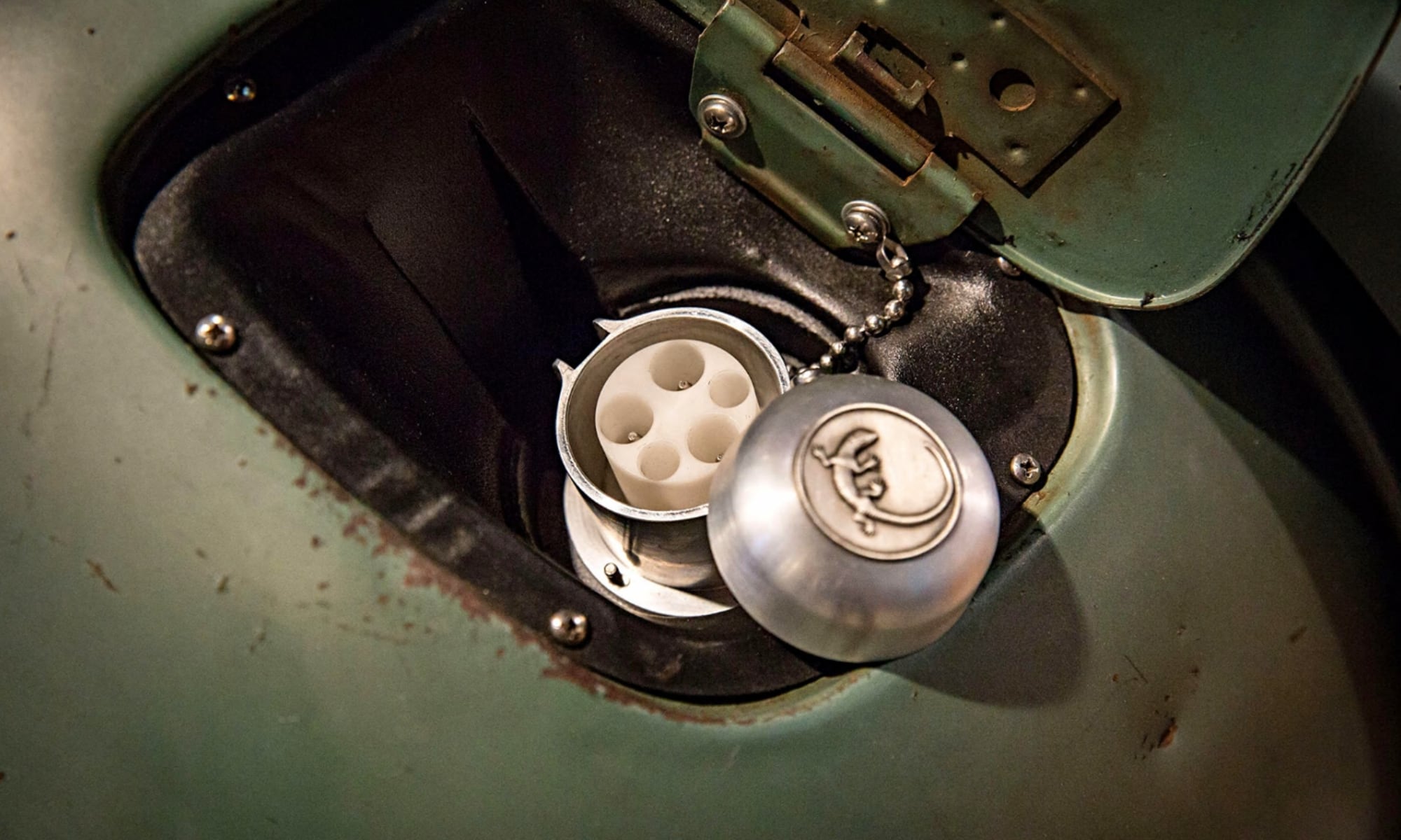 Deux méthodes de chargement (autonomie estimée entre 150-200 kms)…, soit un port de charge rapide de 125A caché derrière la plaque d’immatriculation arrière, l’autre étant une conversion intelligente de l’orifice de remplissage de carburant via une sorte de douille qui accepte les chargeurs Tesla.