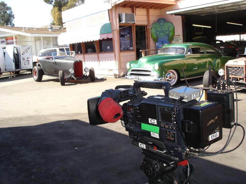 Quelques scènes du film “Deuce of Spades” en cours de tournage, ici dans le show-room et les ateliers de Georges Barris, “The King of Kustomizers”…