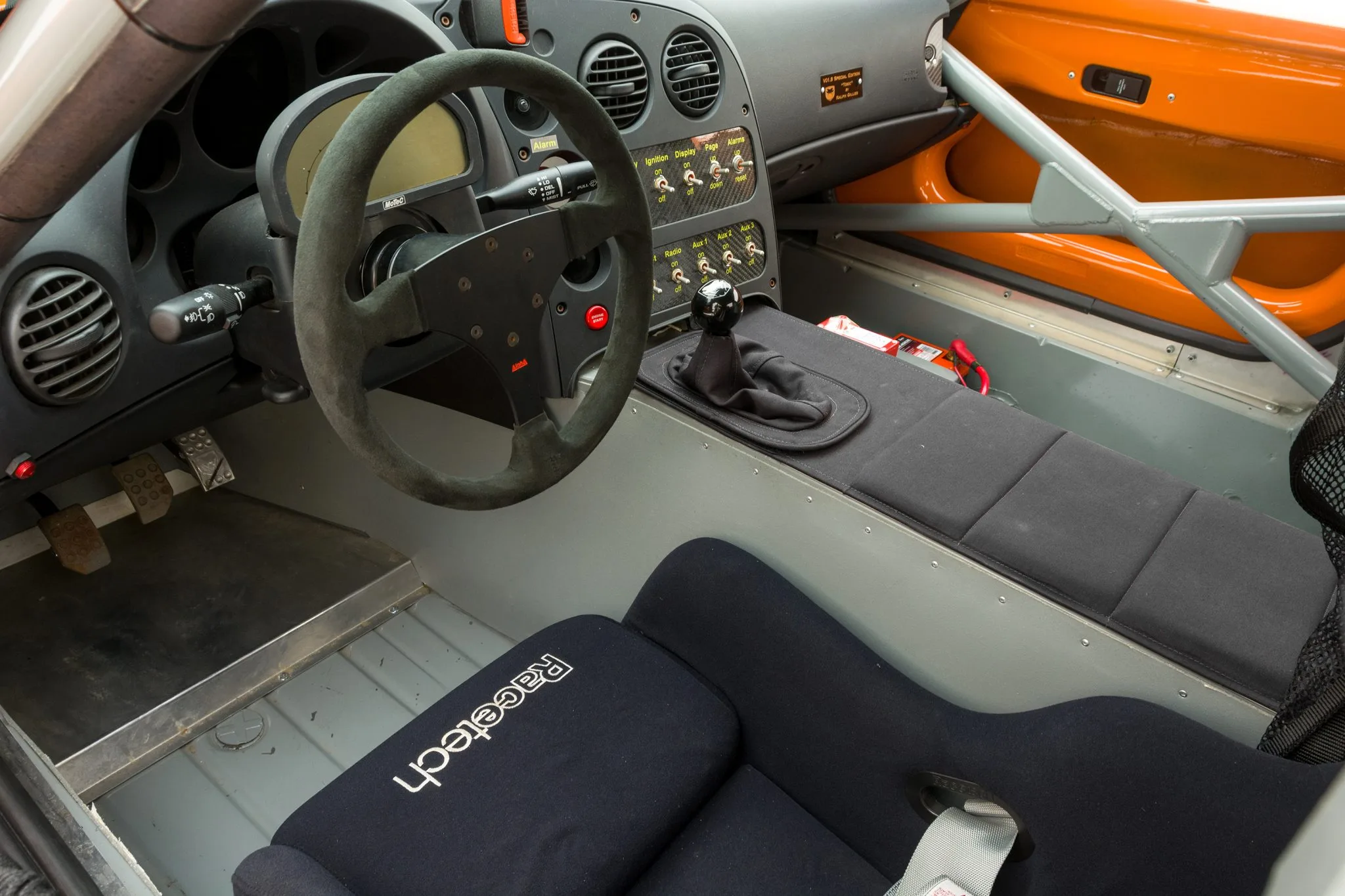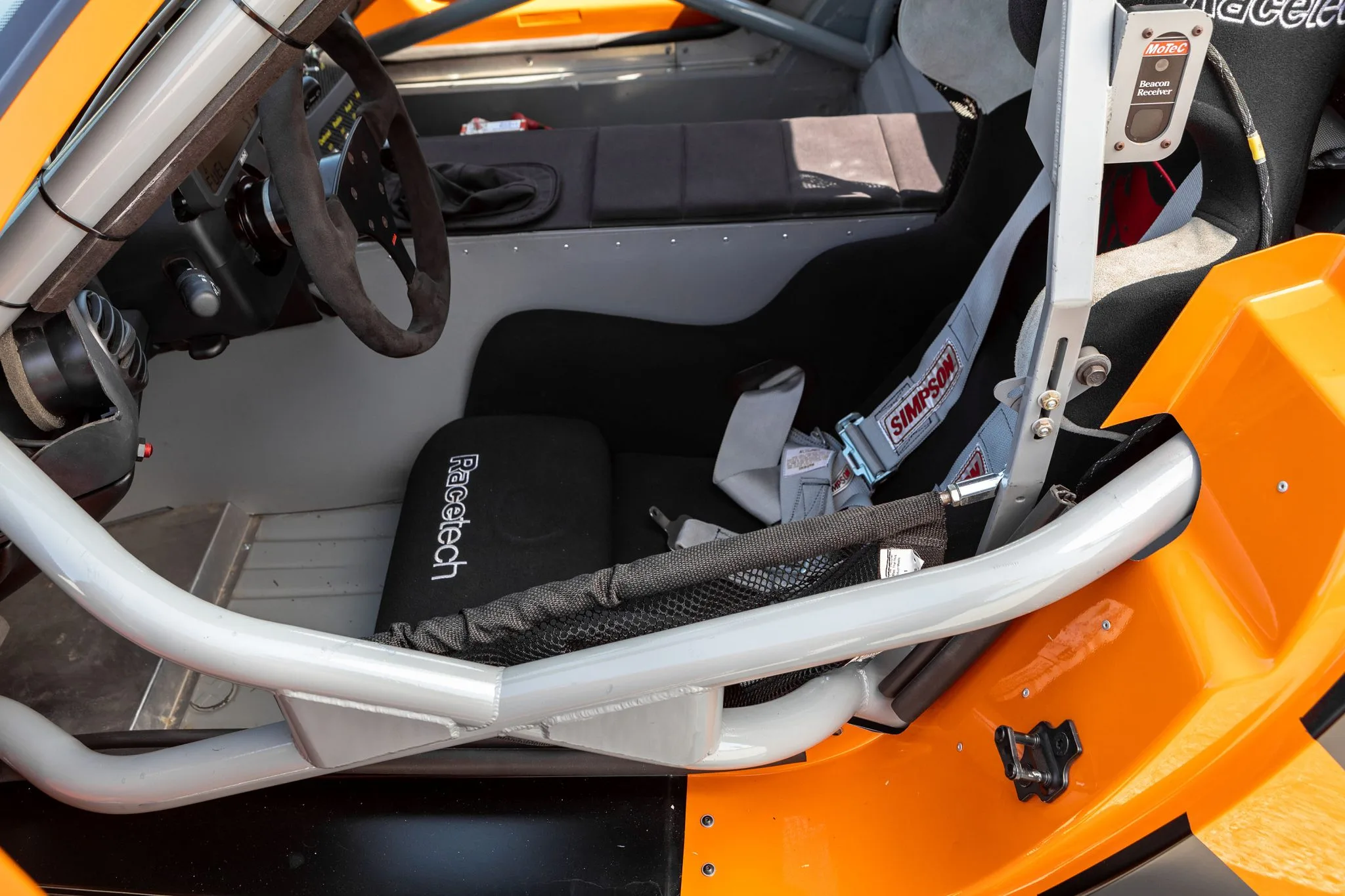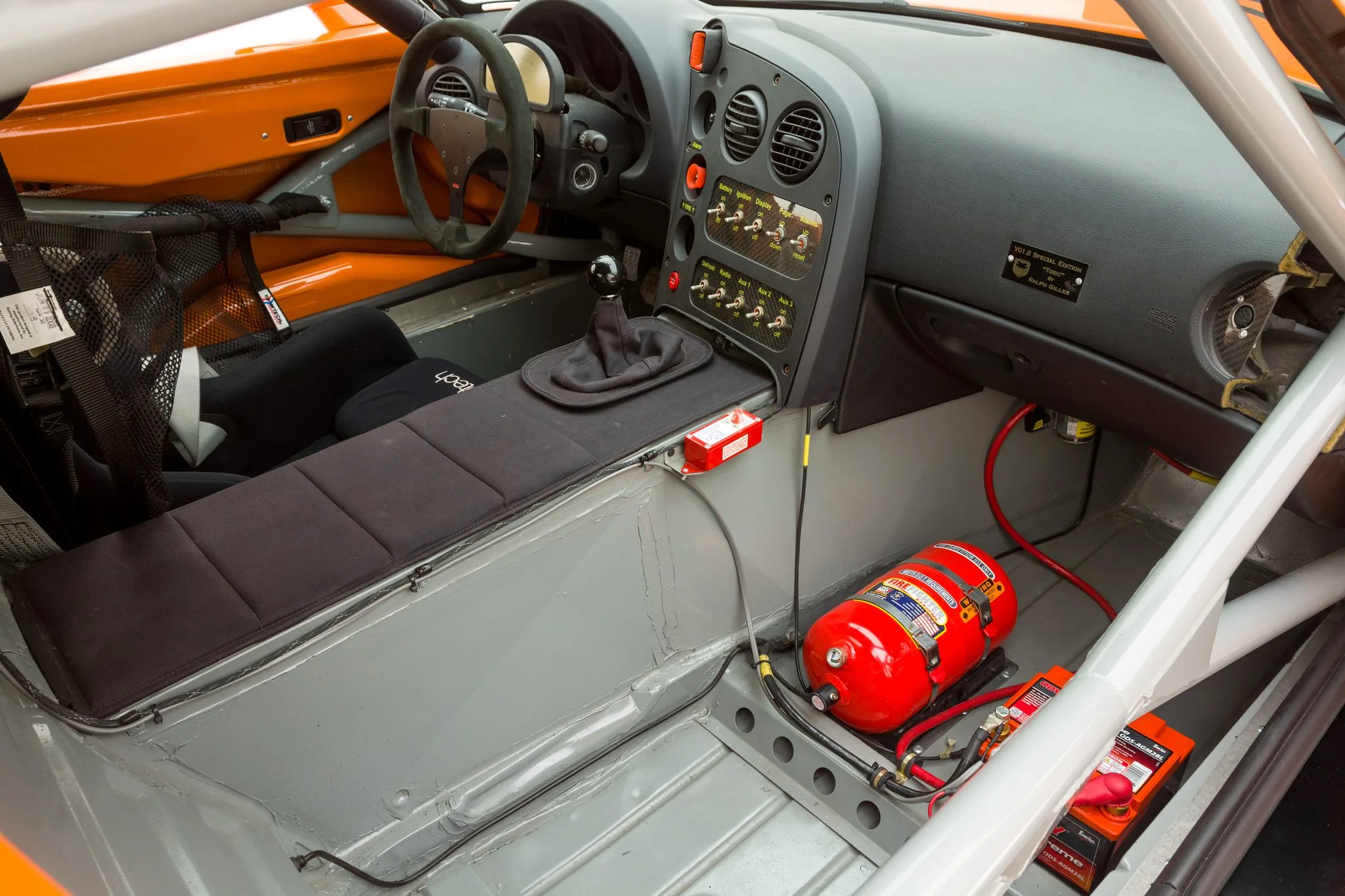 Également une pile à combustible Fuel Safe, d’un système d’extinction d’incendie, d’un siège de course Halo-Racetech avec harnais Simpson, d’un volant Alpha à trois branches monté sur un moyeu à dégagement rapide encadrant un écran numérique avec système d’acquisition de données Motec, ainsi qu’un panneau de commutation monté sur le tableau de bord, un récepteur de balise Motec et une plaquette-signature unique… La tôlerie intérieure est finie en gris et l’équipement supplémentaire comprend des vérins pneumatiques, un système d’extinction d’incendie, un levier de vitesses à courte focale Hurst et une batterie Odyssey. La documentation accompagnant la voiture comprend un manuel d’entretien, et le formulaire/facture de commande de 2004 indiquant la liste d’équipement et un prix total de 143.975 $.