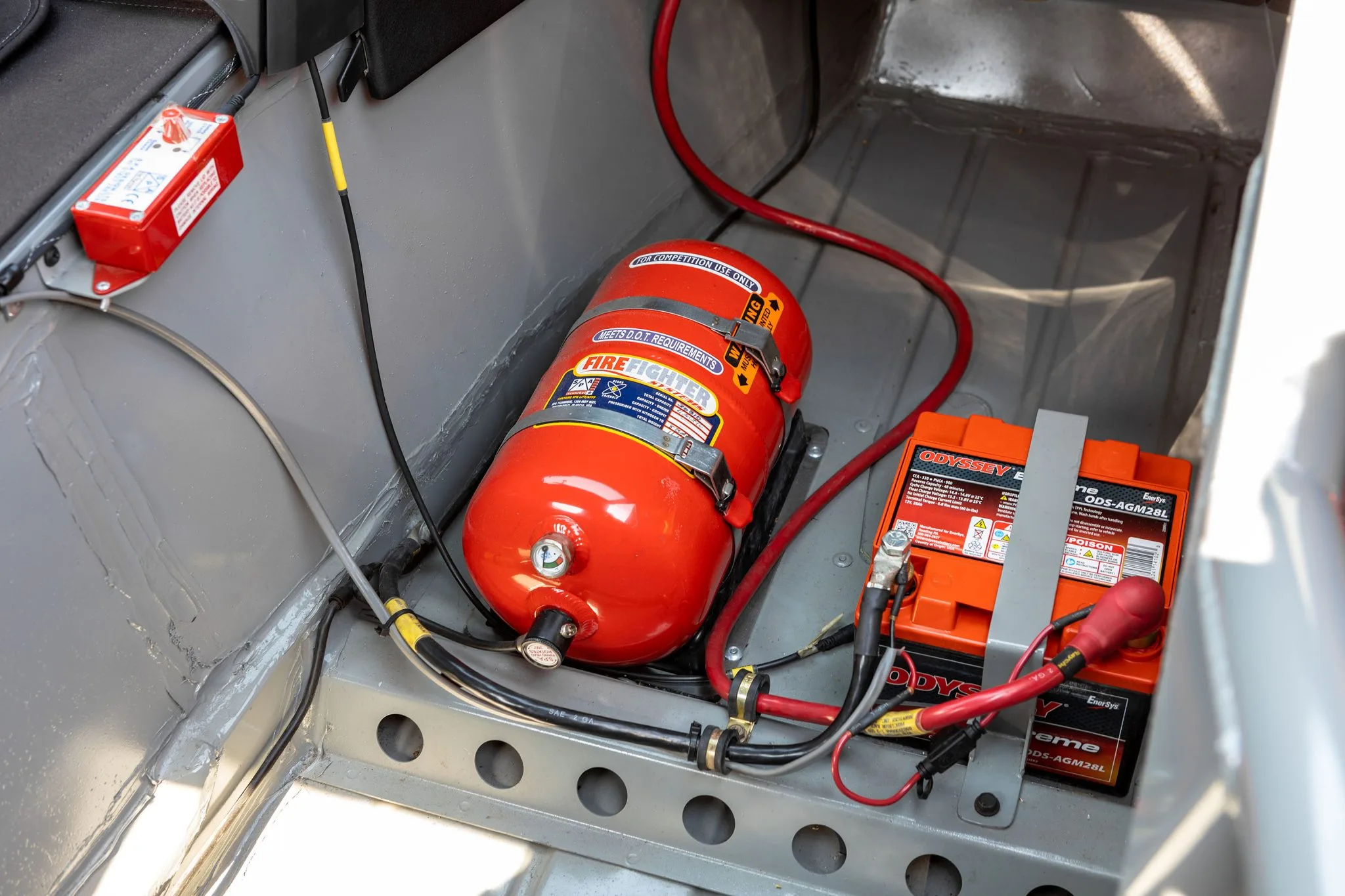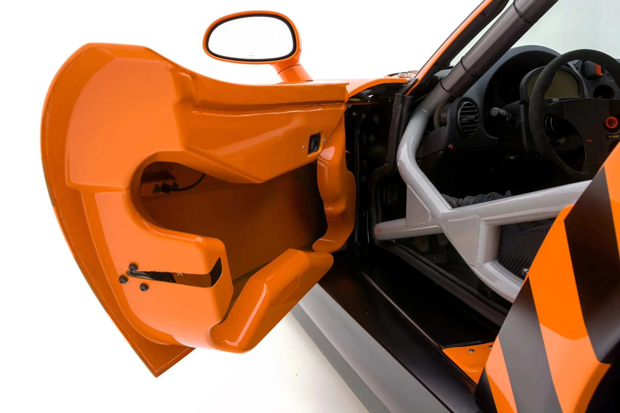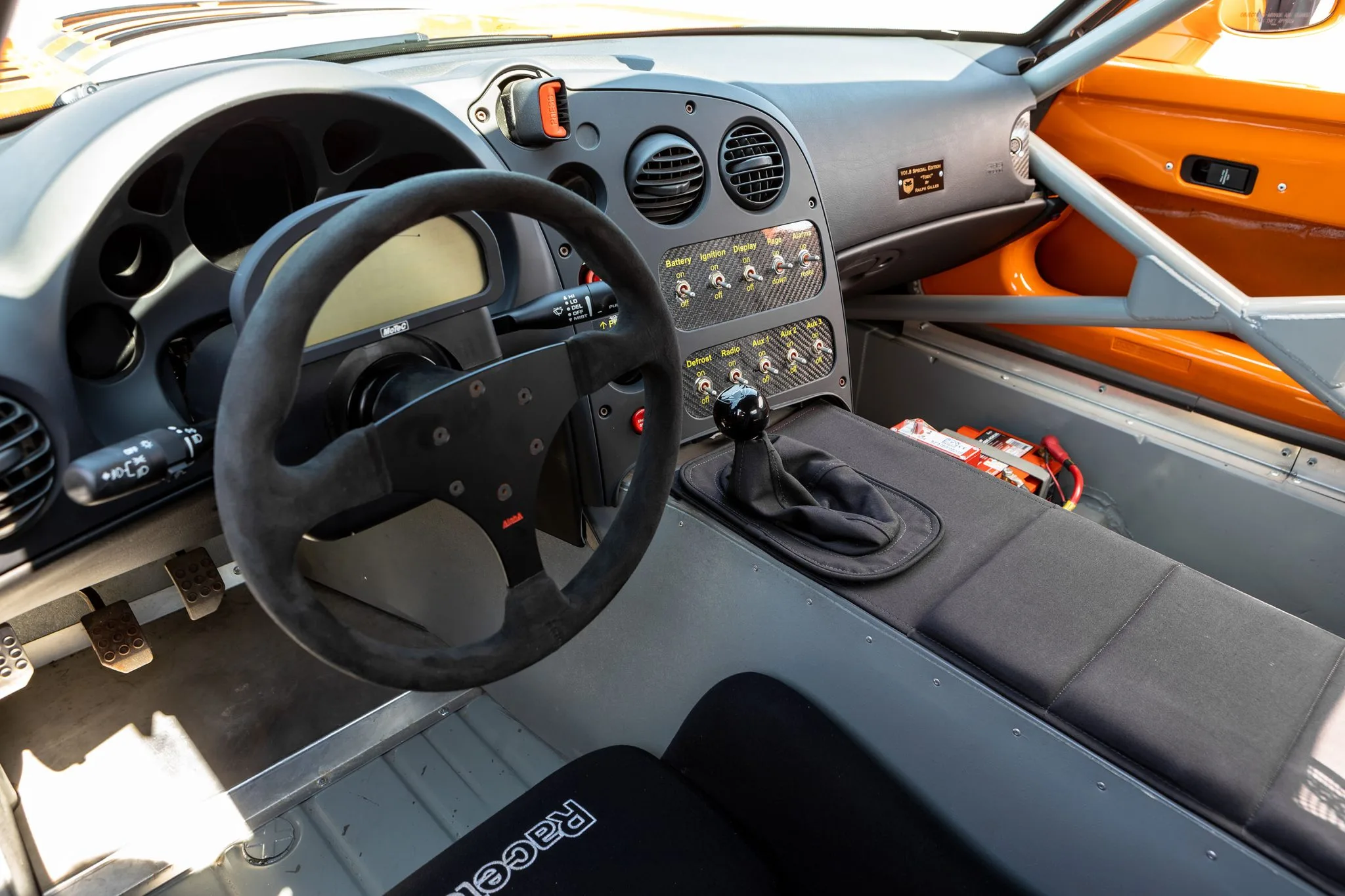 Également une pile à combustible Fuel Safe, d’un système d’extinction d’incendie, d’un siège de course Halo-Racetech avec harnais Simpson, d’un volant Alpha à trois branches monté sur un moyeu à dégagement rapide encadrant un écran numérique avec système d’acquisition de données Motec, ainsi qu’un panneau de commutation monté sur le tableau de bord, un récepteur de balise Motec et une plaquette-signature unique… La tôlerie intérieure est finie en gris et l’équipement supplémentaire comprend des vérins pneumatiques, un système d’extinction d’incendie, un levier de vitesses à courte focale Hurst et une batterie Odyssey. La documentation accompagnant la voiture comprend un manuel d’entretien, et le formulaire/facture de commande de 2004 indiquant la liste d’équipement et un prix total de 143.975 $.