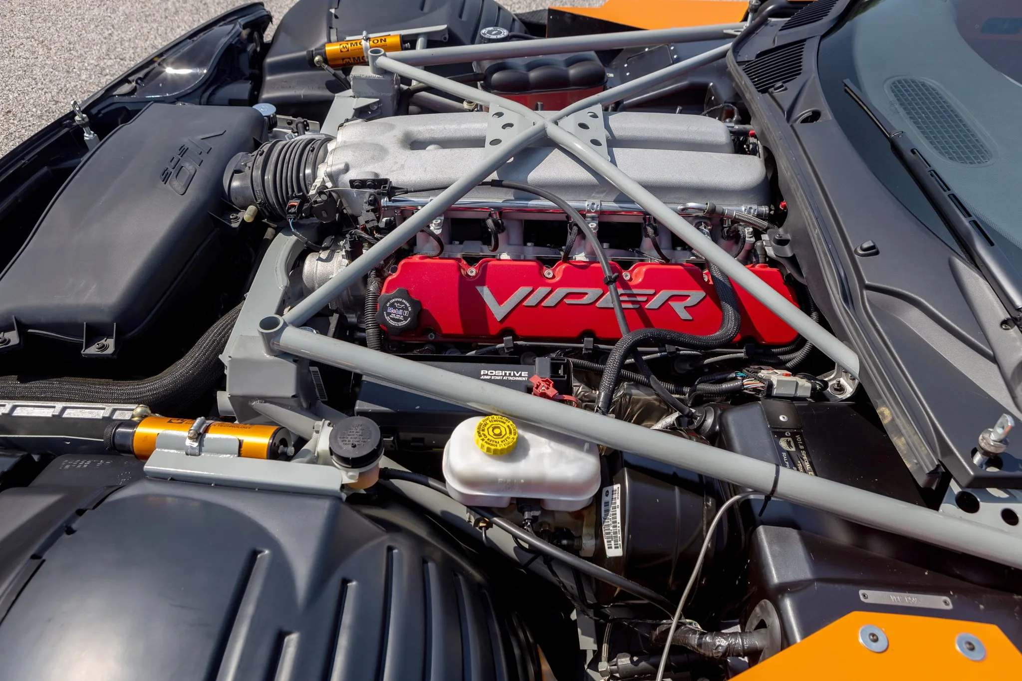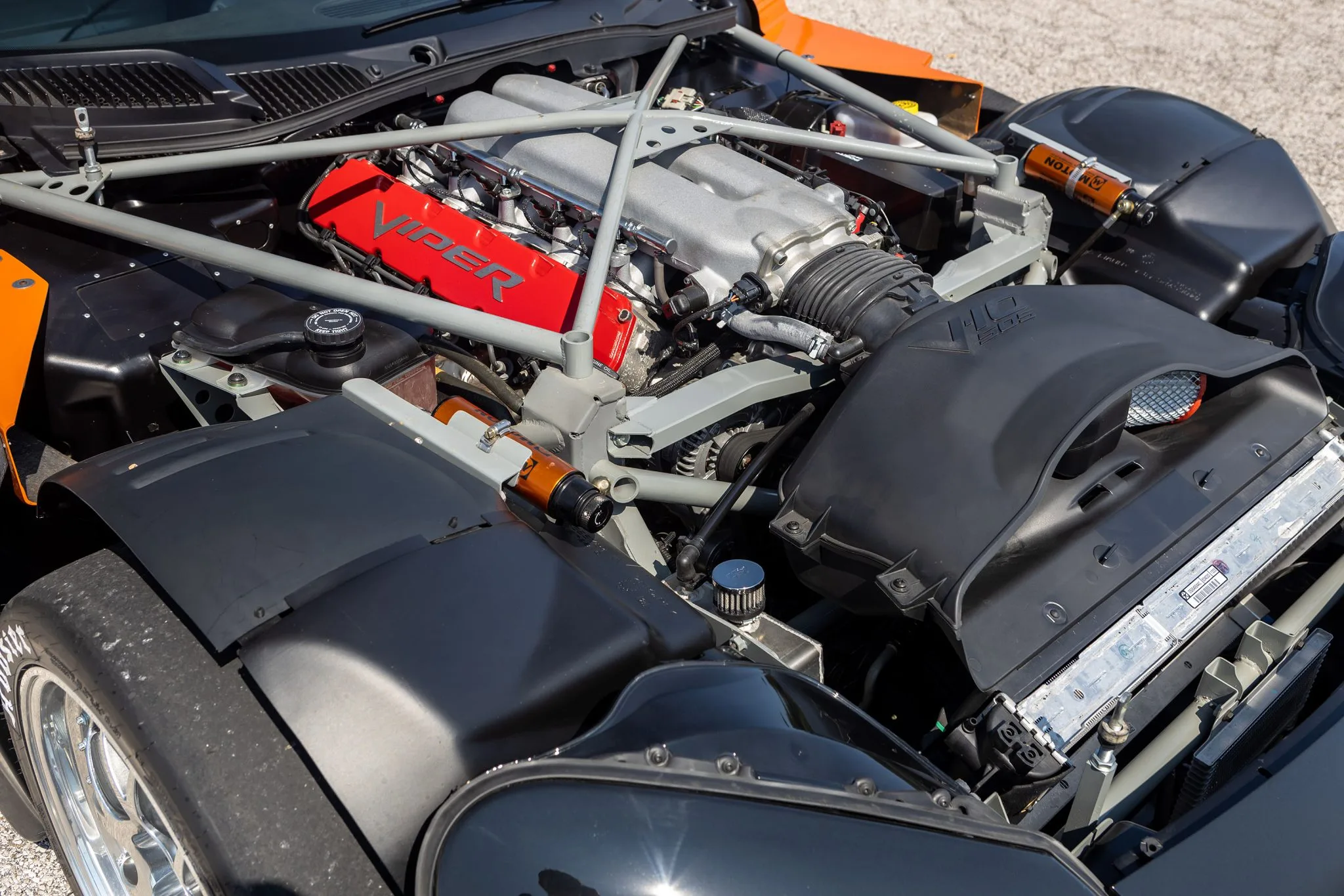 L’équipement supplémentaire comprend un refroidisseur d’huile destiné à la compétition ainsi qu’une pile à combustible “Fuel Safe” de 100 litres. Cette Viper Coupe-Compétition utilise un châssis de roadster SRT-10 renforcé qui a été doté d’une cage de roulis approuvée par la FIA, d’une carrosserie aérodynamique plus légère dépourvue de finitions intérieures extrapolée d’une Viper GTS-R seconde génération, de jantes modulaires BBS de 18 pouces équipées de pneumatiques de course Hoosier, de freins à disques ventilés avec étriers à 4 pistons Brembo, et de coilovers réglables Moton.