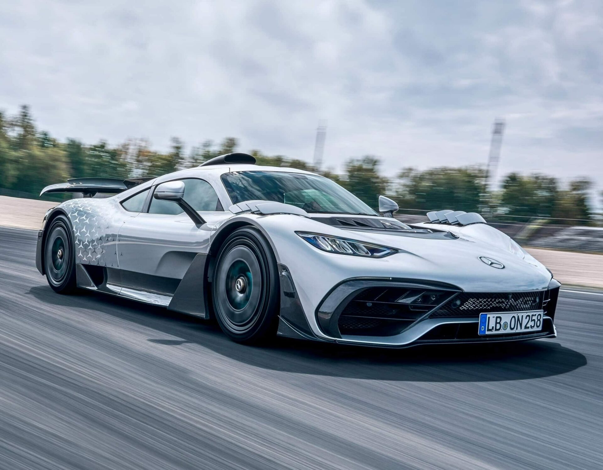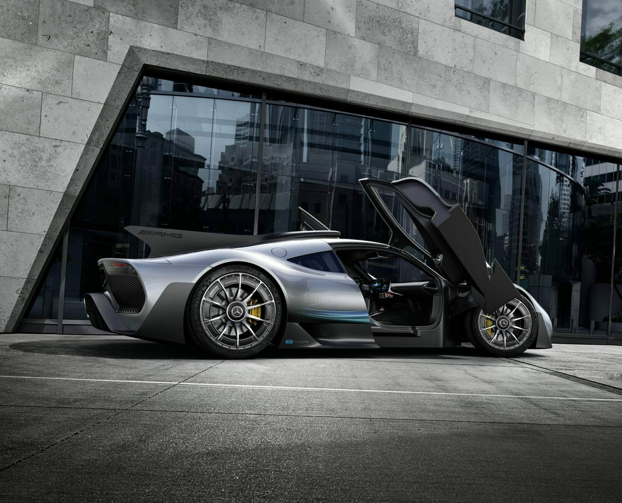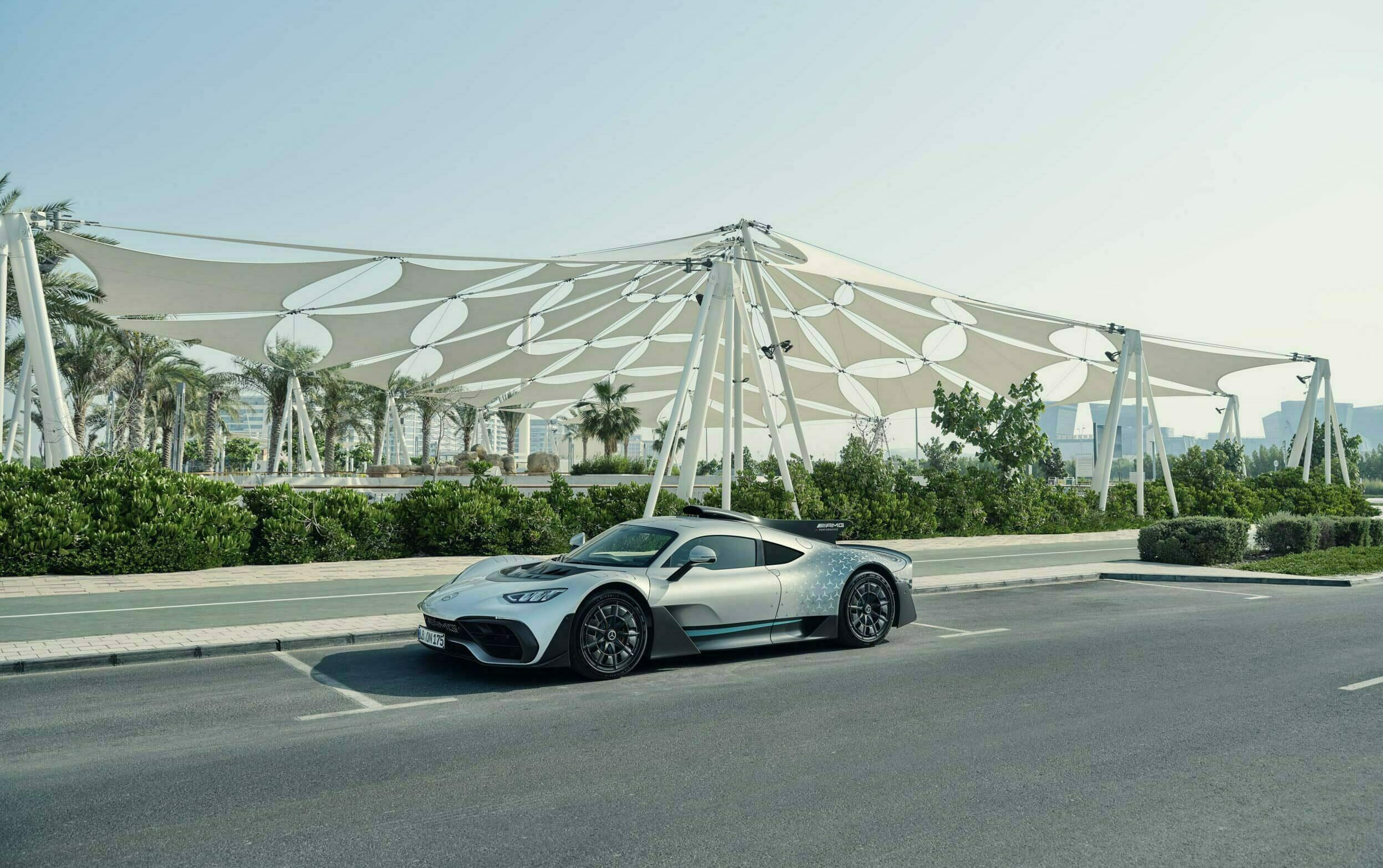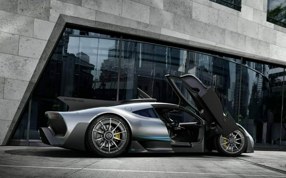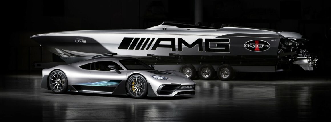 Sous sa carrosserie à l’aérodynamique apocalyptique optimisée, l’AMG One construite en titane, en acier, plastique et divers autour d’un châssis en carbone largement carboné, accueille un groupe hybride mis au point par le département “Mercedes AMG High Performance Powertrains” basé à Brixworth, en Grande-Bretagne. Ce groupe n’a pas été conçu avec un V16, ni avec un V12, ni avec un V10, ni avec un V8, mais conçu autour d’un bloc V6 1.600cc poussé à 574 chevaux, auquel sont associés quatre moteurs électriques qui garantissent au véhicule une puissance totale de 1063 chevaux. A cette hybridation “packagée” s’ajoutent notamment un système de freinage en céramique-composite ainsi qu’une suspension active ajustable…