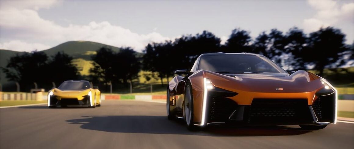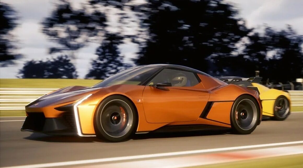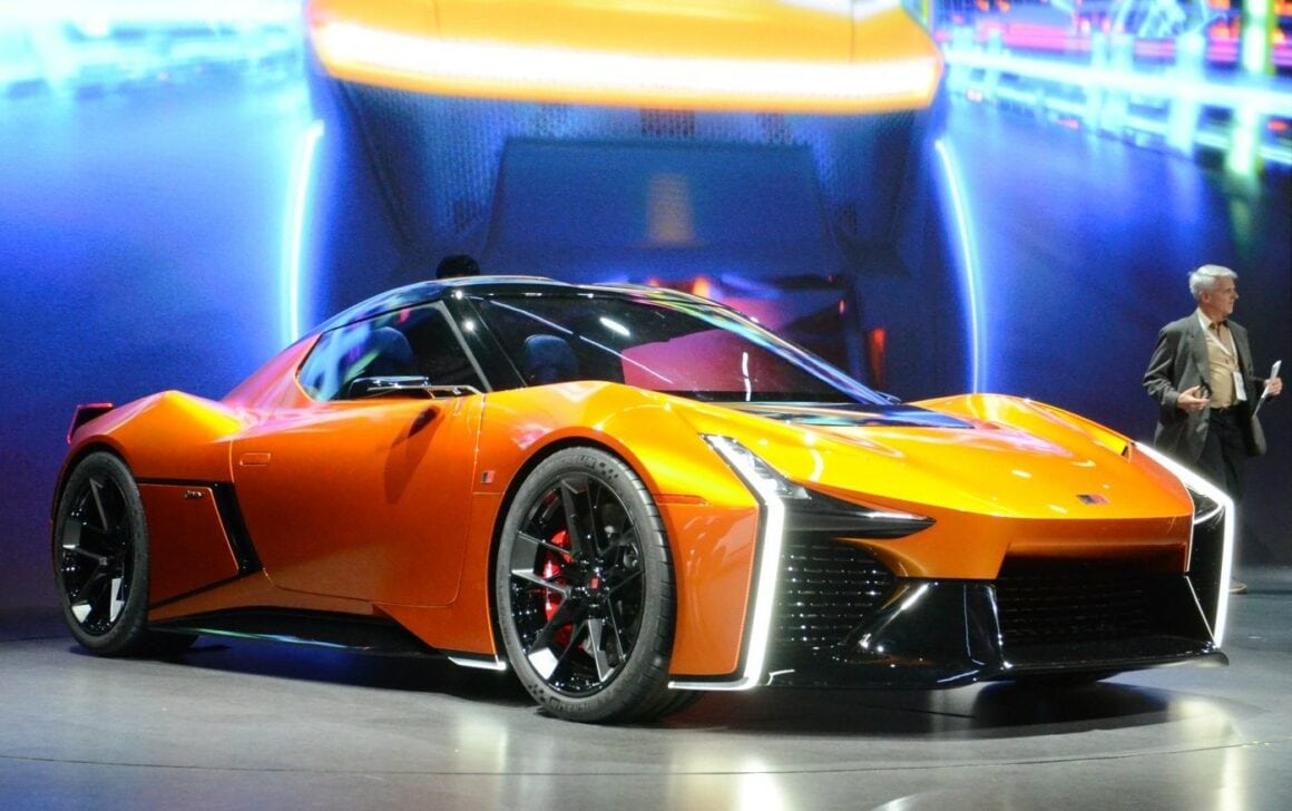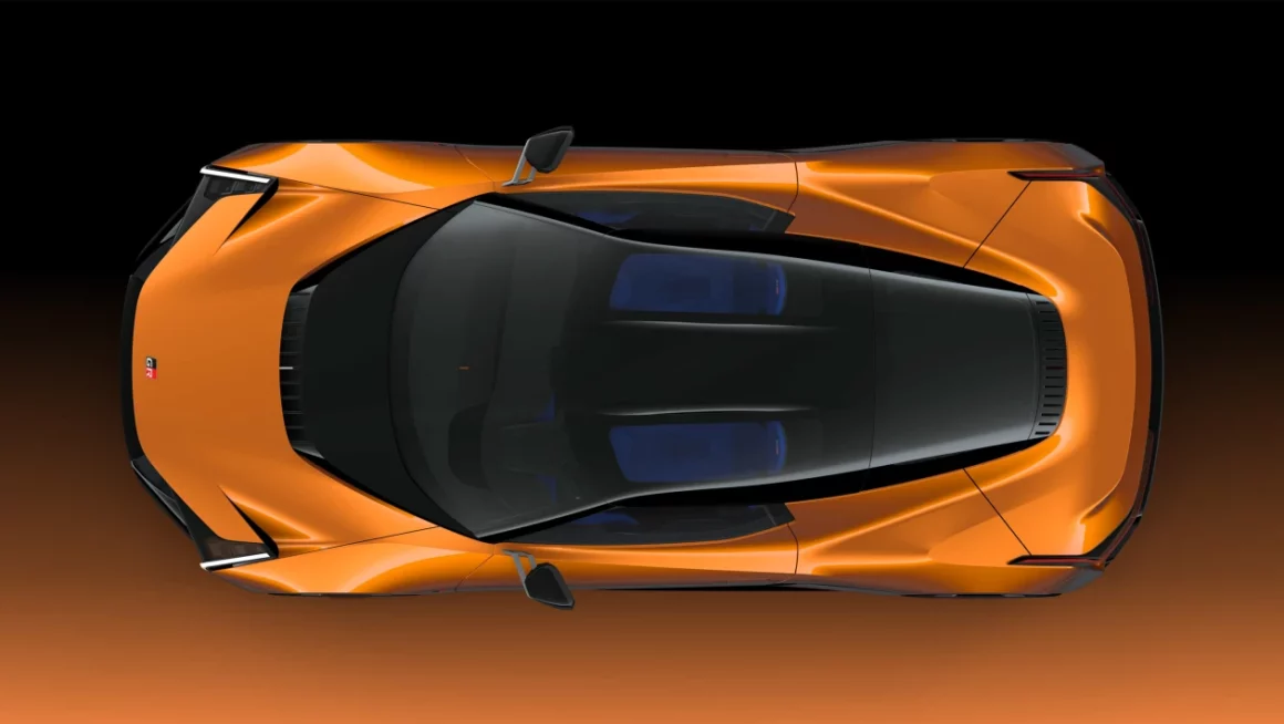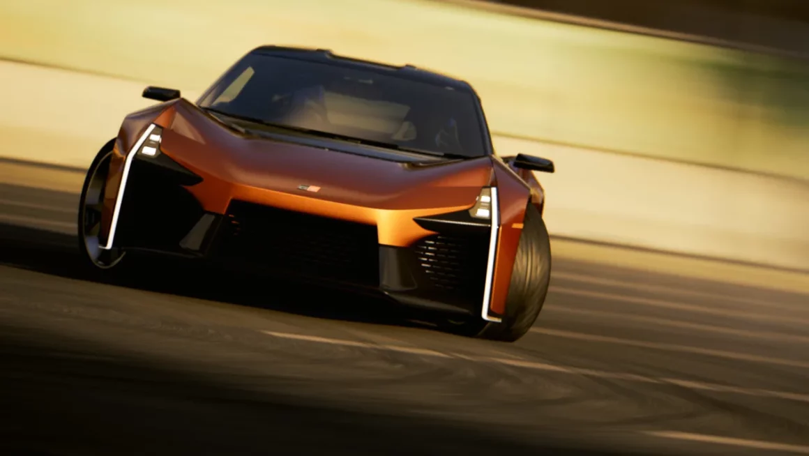 Ce concept surbaissé n’est pas équipé d’un groupe moteur à combustion interne, mais sa carrosserie orange métallisée (trop) sculptée et son cockpit à bulles noires lui donnent l’apparence d’une machine à vapeur à moteur central disposant d’un aménagement épuré dans un cockpit qui est extrapolé directement d’une borne d’arcade.