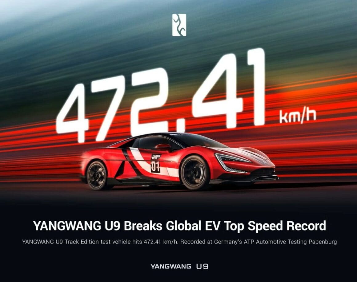 Le constructeur automobile chinois BYD a réalisé le record du monde de vitesse de pointe pour les véhicules électriques avec une vitesse de 472,41 km/h avec sa version sur mesure BYD Yangwang U9 Track Edition DE 3.000cv ! Le record a été établi sur le site ATP Automotive Testing de Papenburg en Allemagne le 8 août 2025 et dépasse la vitesse établie par son modèle de base U9 l’année dernière.