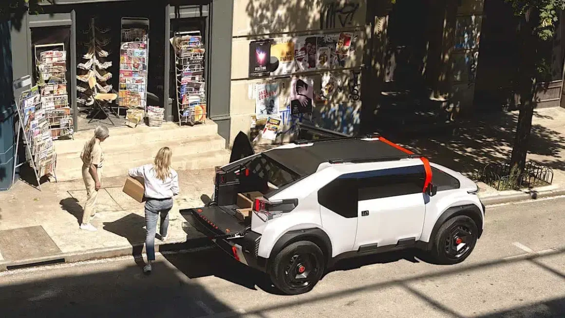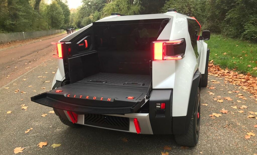 Le profil arrière est très plongeant et dépourvu de hayon. En effet, le plus inhabituel de sa conception est qu’au lieu d’un coffre conventionnel, il dispose d’un arrière façon pick-up disposant de nombreux points d’attache pour les accessoires ou la cargaison…