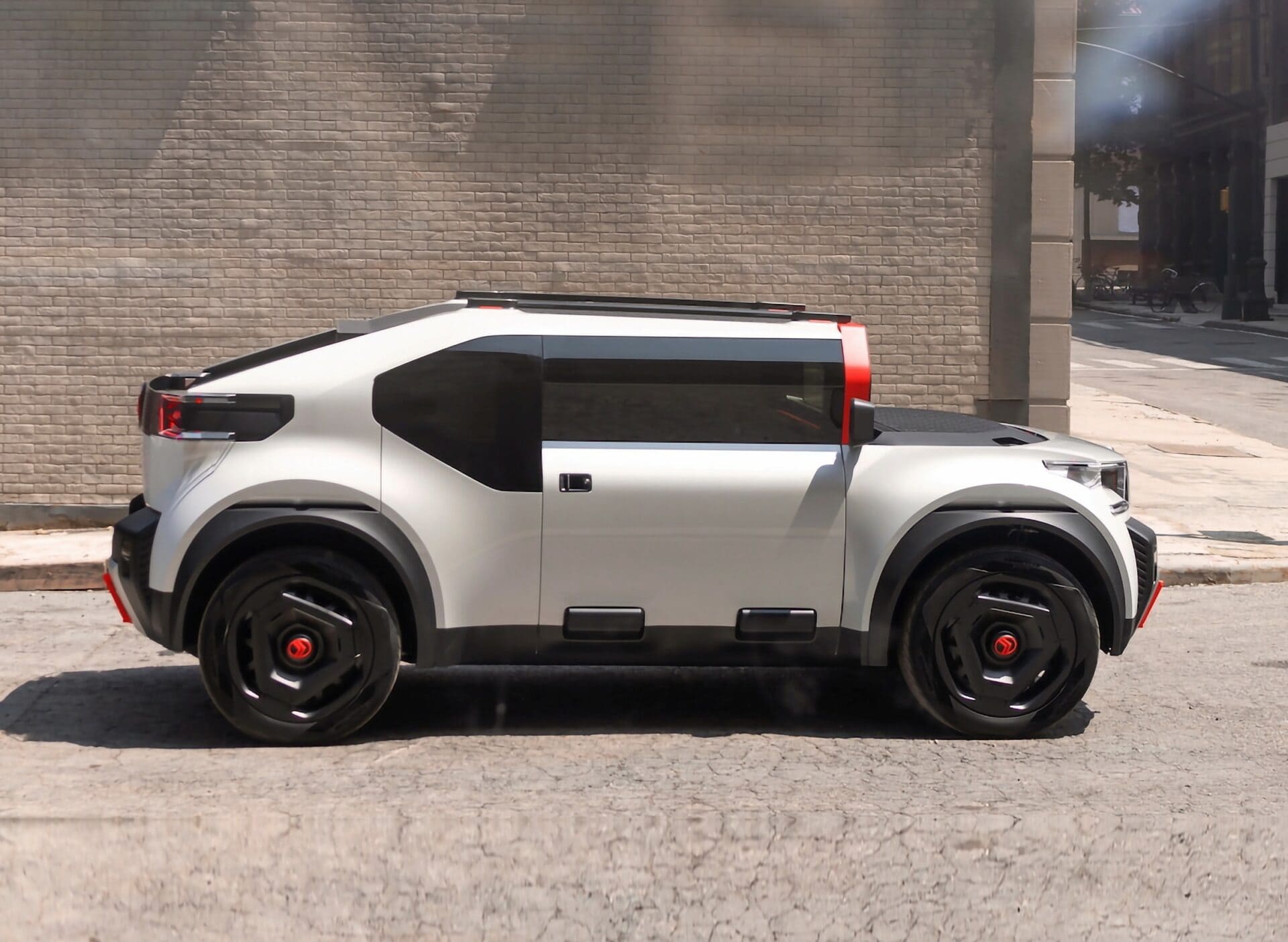 Oli prouve que l’on peut faire beaucoup plus avec beaucoup moins. Compact (4,20 m de long), mais large (1,90 m) et “haut sur pattes” (1,65 m), Oli est un concept-car au style bien affirmé, qui mise sur un style assez peu conventionnel, à la croisée des chemins entre un petit SUV, un pick-up et un coupé. Avec sa proue massive, son pare-brise vertical et son arrière plongeant, ce crossover 100 % électrique, aux faux airs de mini-Hummer H1 mêlé au Tesla X, en jette un max. Il est perché sur de grandes jantes de 20′ (avec centre entôle et voile en aluminium, ce qui a permis de gagner 6 kg sur l’ensemble des jantes.